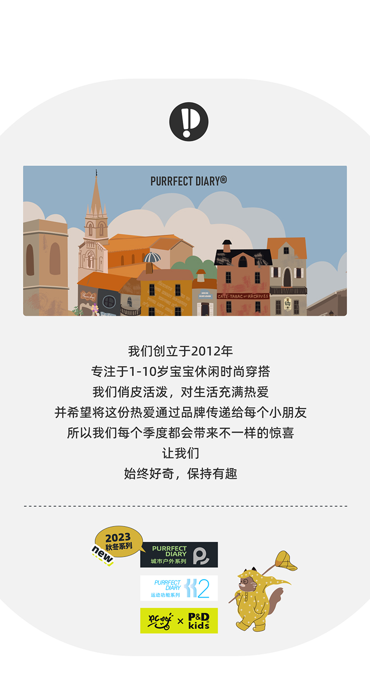 Purrfect-Diary专注于贴近自然随性的穿着概念,轻奢平价的童装文化传播,在产品设计上更加注重婴童穿着的舒适性、安全性、更出众的国际化品牌,将欧美的育婴文化在中国进行深入的传播与推广。