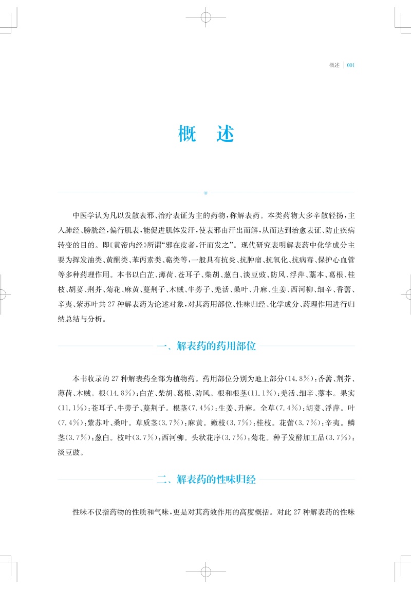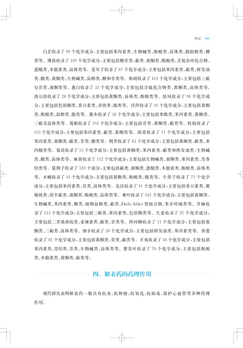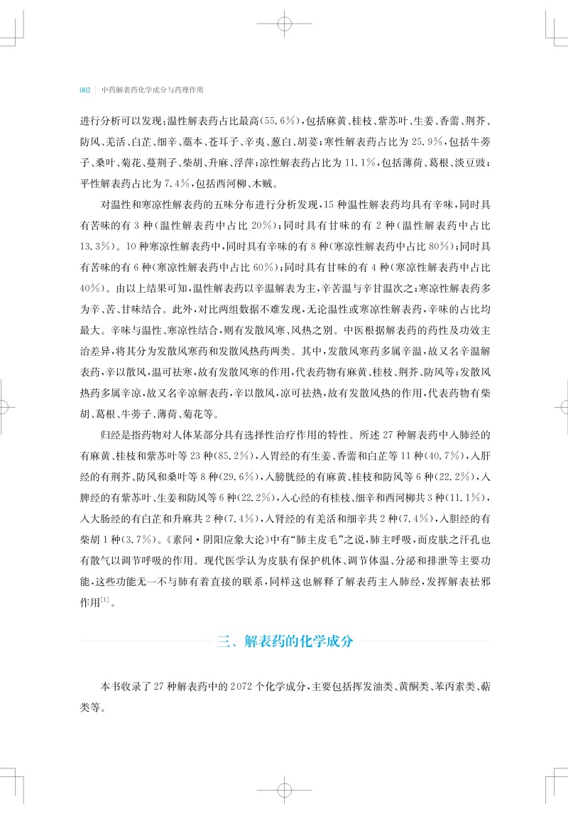 中医认为凡以发散表邪、治疗表证为主的药物,称解表药。解表药能促进肌体发汗,使表邪由汗出而解,从而达到治愈表证、防止疾病转变的目的。本书收录27味解表药,从物质基础及作用机制的角度系统性地阐述解表药的科学内涵。总结整理了每味中药中单体化学成分及其平面结构、立体构型,并按结构母核归纳了每种中药中重要类型的化学成分。现代研究表明,解表药中化学成分多以挥发油、黄酮、苯丙素和萜类为主。现代药理研究认为,解表药普遍具有抗炎、抗氧化、镇痛和抗病毒等药理活性。