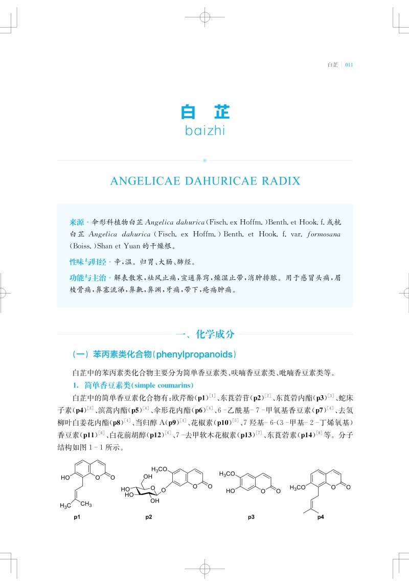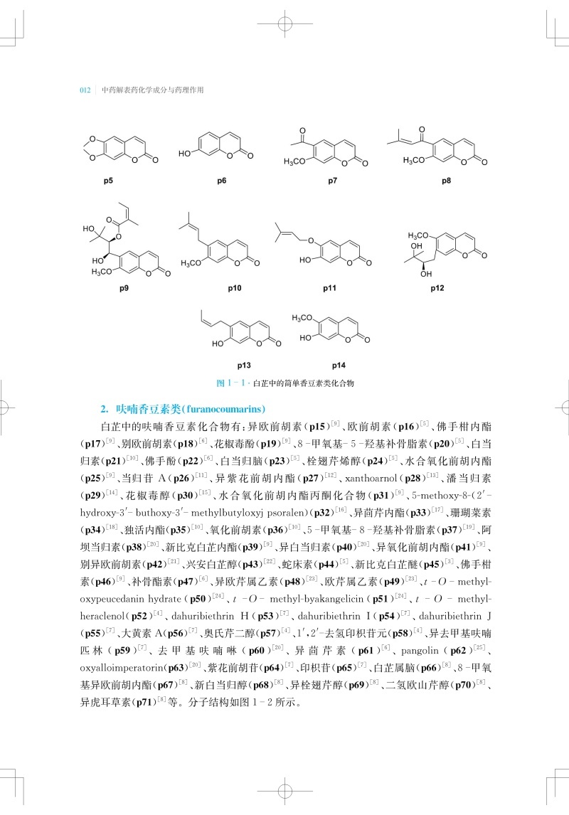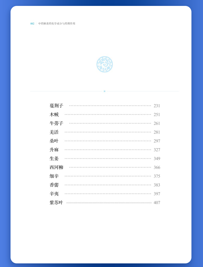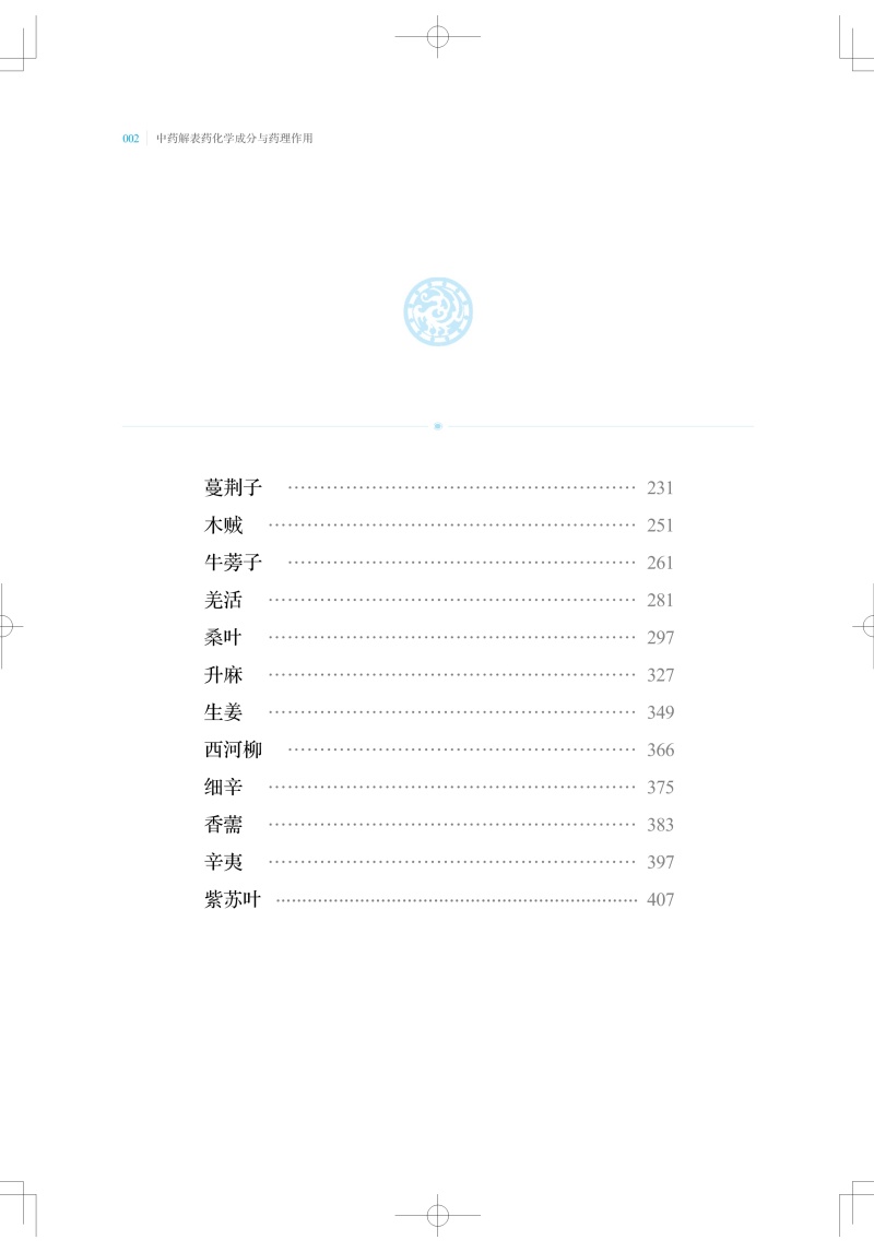 中医认为凡以发散表邪、治疗表证为主的药物,称解表药。解表药能促进肌体发汗,使表邪由汗出而解,从而达到治愈表证、防止疾病转变的目的。本书收录27味解表药,从物质基础及作用机制的角度系统性地阐述解表药的科学内涵。总结整理了每味中药中单体化学成分及其平面结构、立体构型,并按结构母核归纳了每种中药中重要类型的化学成分。现代研究表明,解表药中化学成分多以挥发油、黄酮、苯丙素和萜类为主。现代药理研究认为,解表药普遍具有抗炎、抗氧化、镇痛和抗病毒等药理活性。