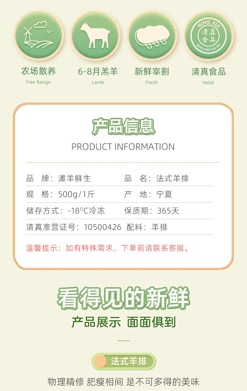 滩羊鲜生羔羊排原切 法式小切500g/袋