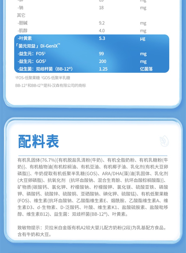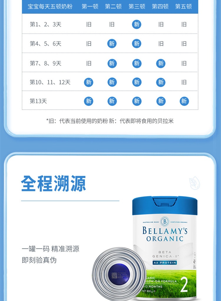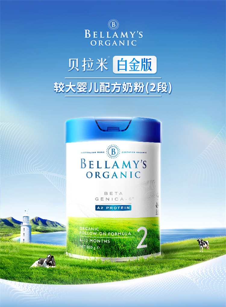【贝拉米白金版】澳洲进口DHA有机A2蛋白奶粉2段6-12个月800g/罐