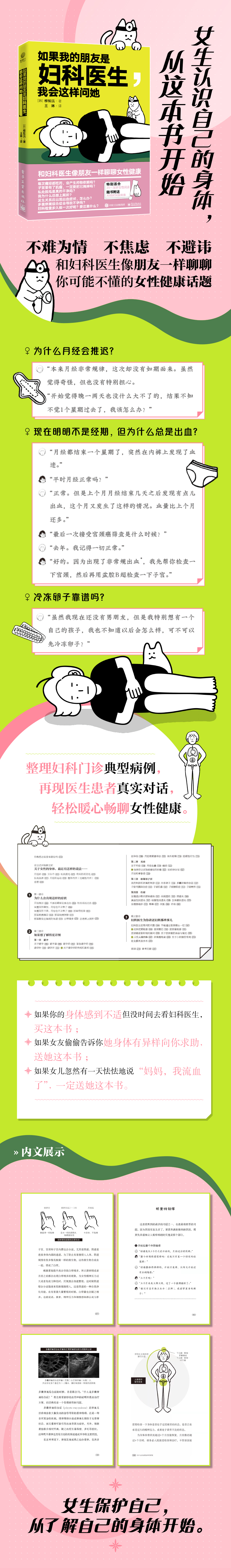 1.这本书适合谁读?这是一本写给年轻女性的妇科健康书,针对年轻女性的生理特点,聚焦她们常遇到的妇科问题和热门话题,以医患对话作为引子,用轻松、坦诚的方式将妇科知识娓娓道出。如果你身体感到不适但犹豫去看妇科医生,如果你的闺蜜偷偷告诉你她身体有异样向你寻求帮助,如果你的女友跟你抱怨你不关心她,如果你的女儿忽然有一天怯怯地跟你说“妈妈我流血了”,请买这本书送给她们吧。2.这本书讲了什么?首先介绍妇科门诊常见的典型病症和发病原因;然后详细介绍避孕、月经、子宫和卵巢、性病等妇科问题;后聊聊关于妇科定期检查、宫颈癌检查等的那些事儿。3.这本书能读得懂吗?作者年轻时也曾经历身体明明不适却羞于就医的迷茫与窘境,后来成为妇科医生后亲眼看到很多年轻女性未能及时就医身体发生异常而后悔莫及,她深知患者心理,她希望通过这本书像和朋友聊天一样把女性生理、妇科疾病及安全防护等问题讲清楚,让读者读得懂,记得住。