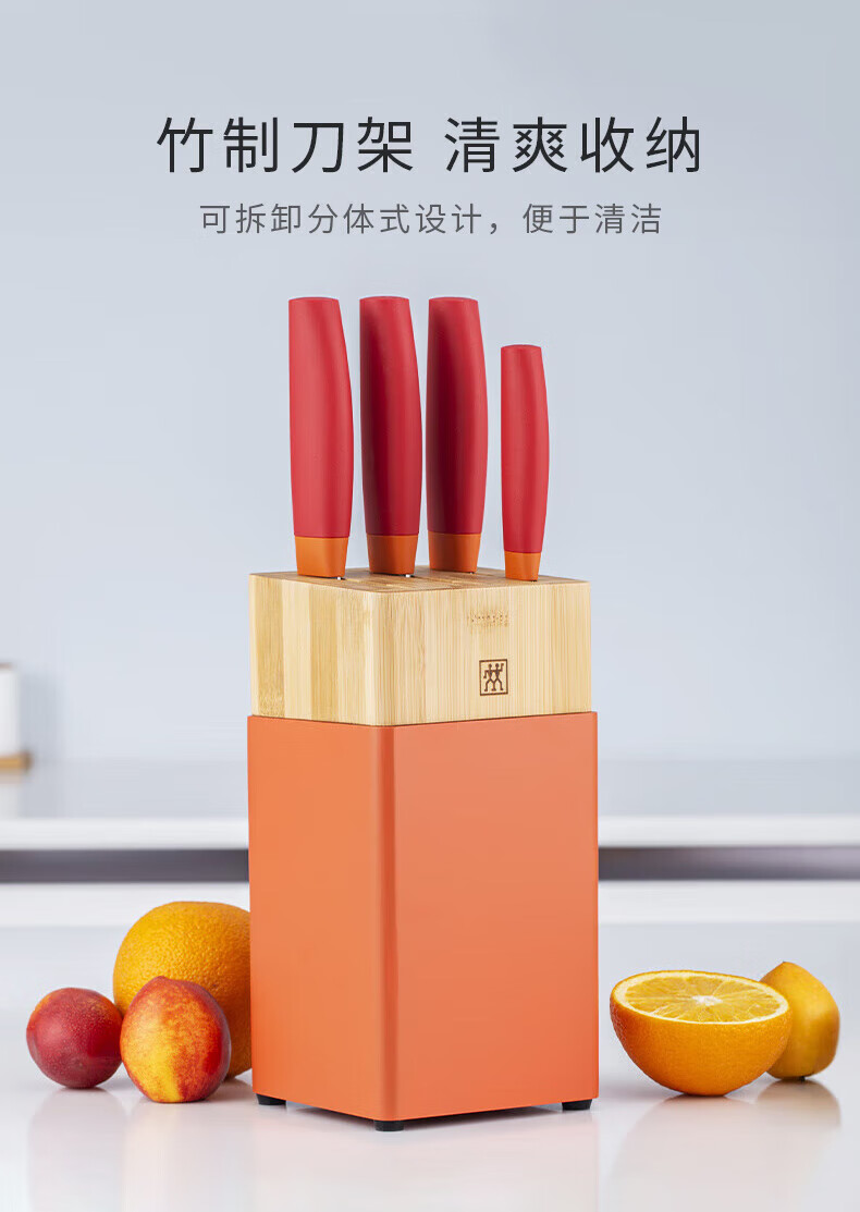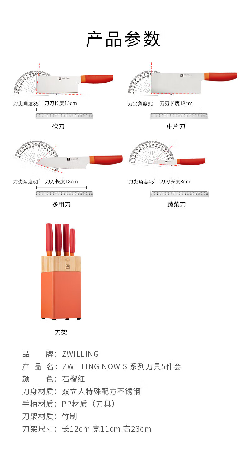 双立人(ZWILLING)刀具套装菜刀多用水果刀砍骨刀切菜刀切肉刀刀架NOW S厨房用具 石榴红刀具 5件套