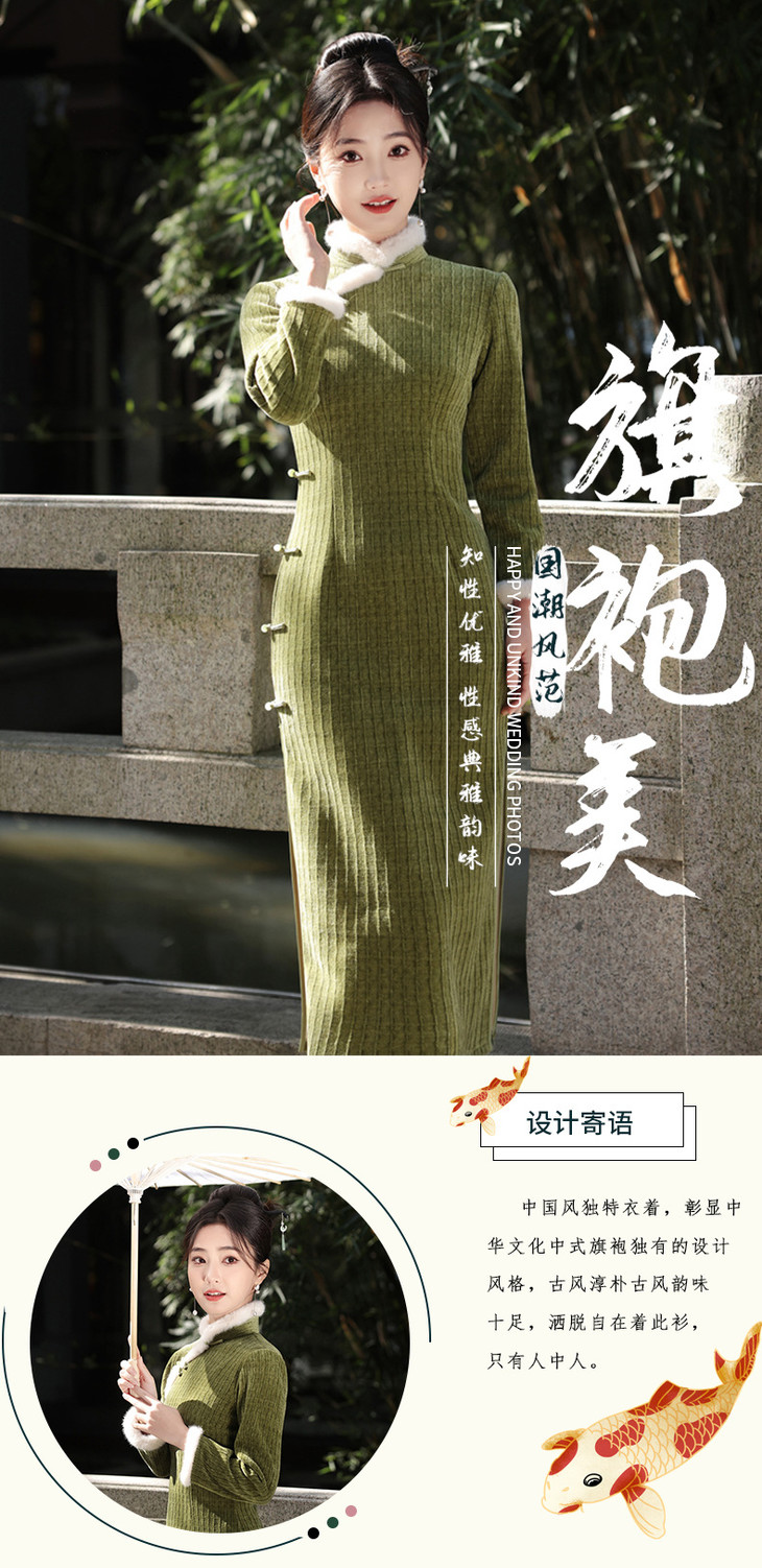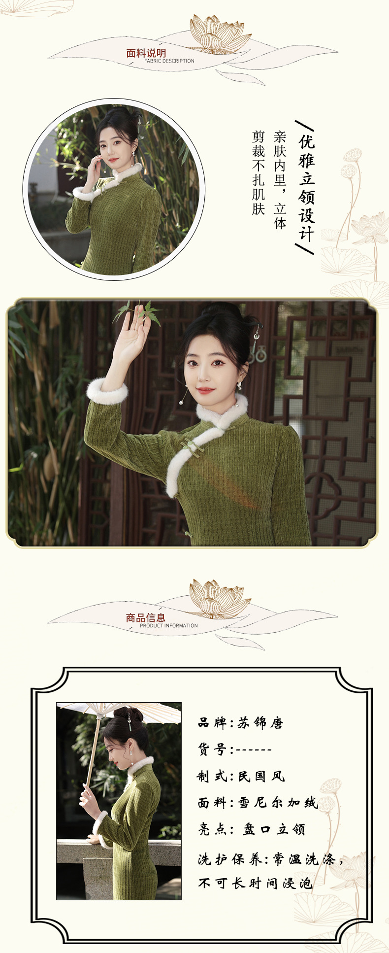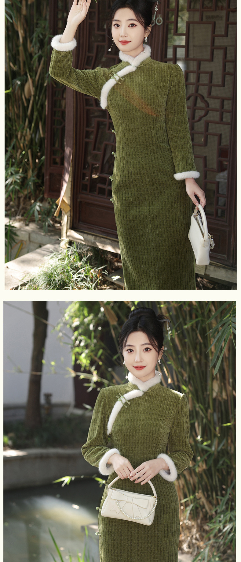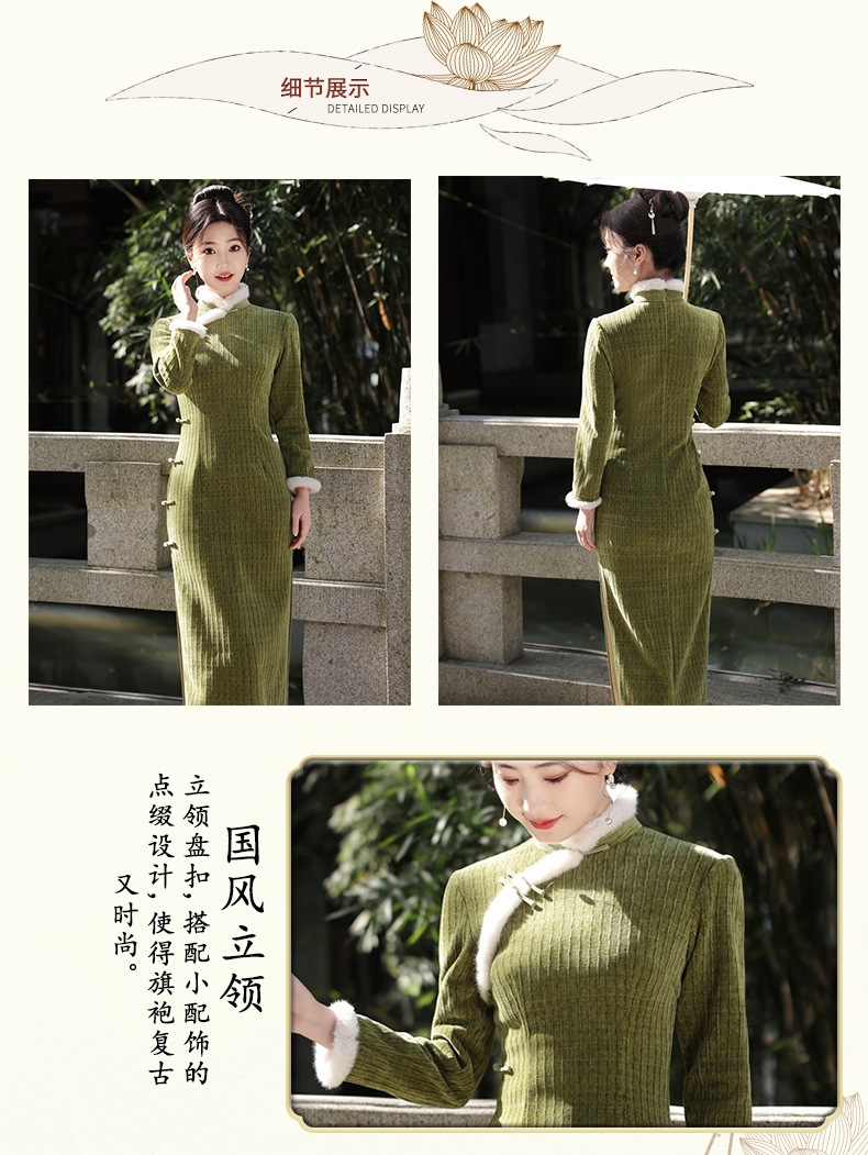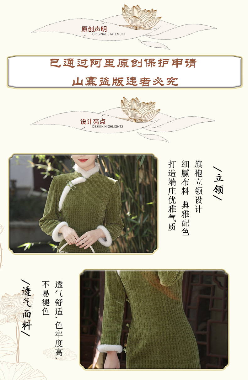 2023冬季新款加绒加厚毛领长款侧八扣中国复古风修身旗袍SJT-409