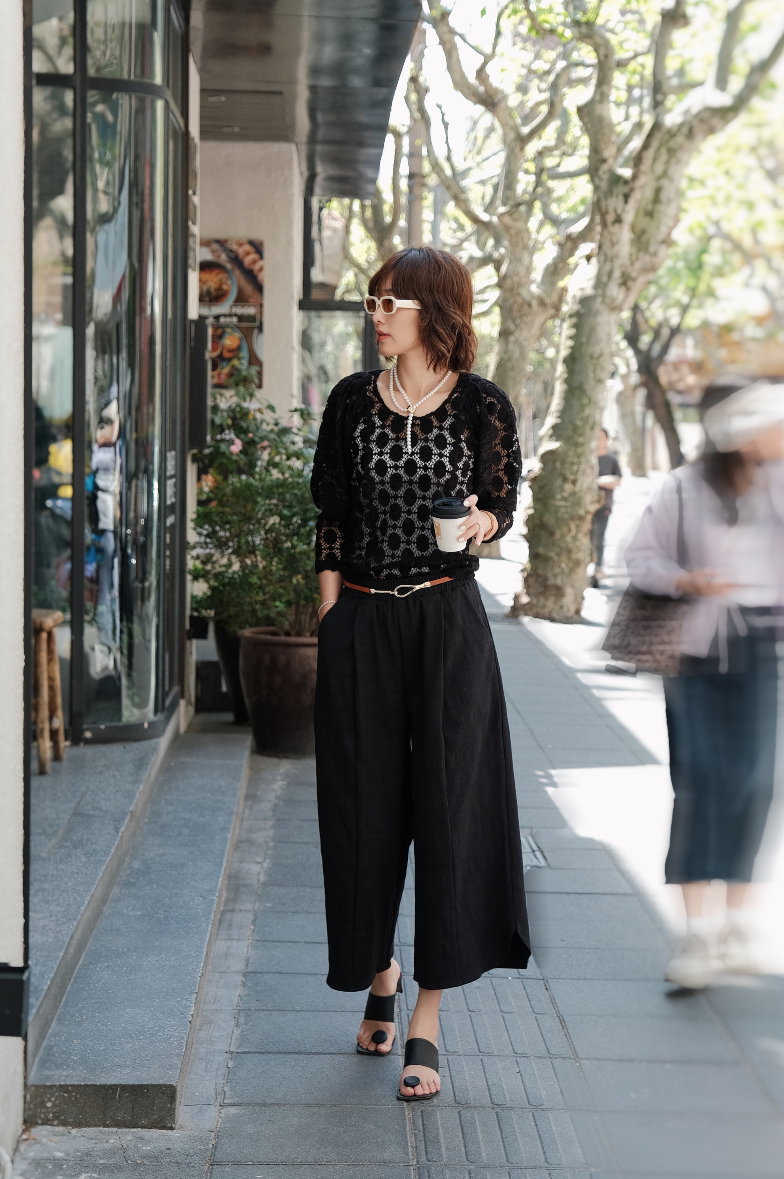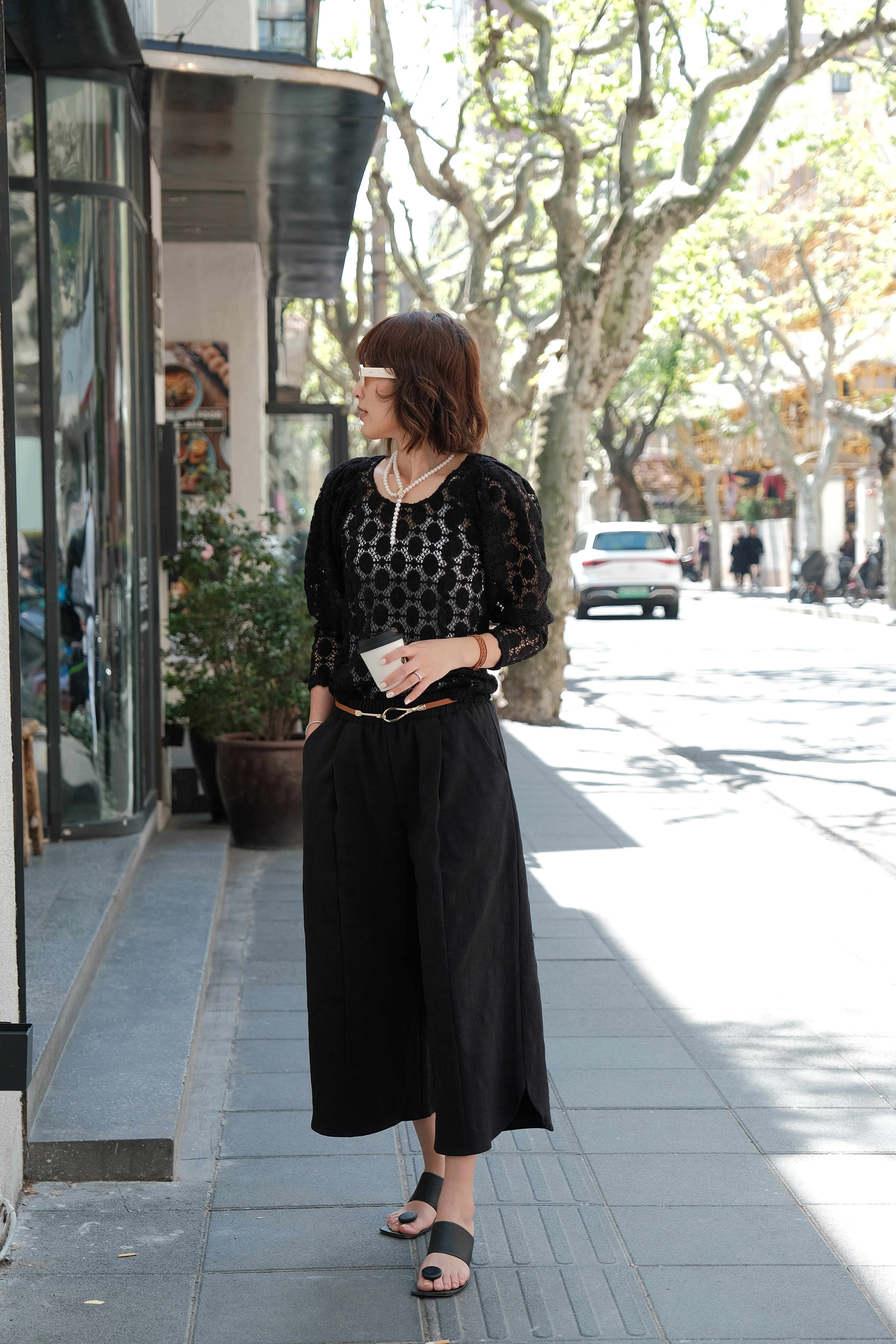 TYNVIE 褶皱袖口镶边花型蕾丝透视长袖上衣-白色
