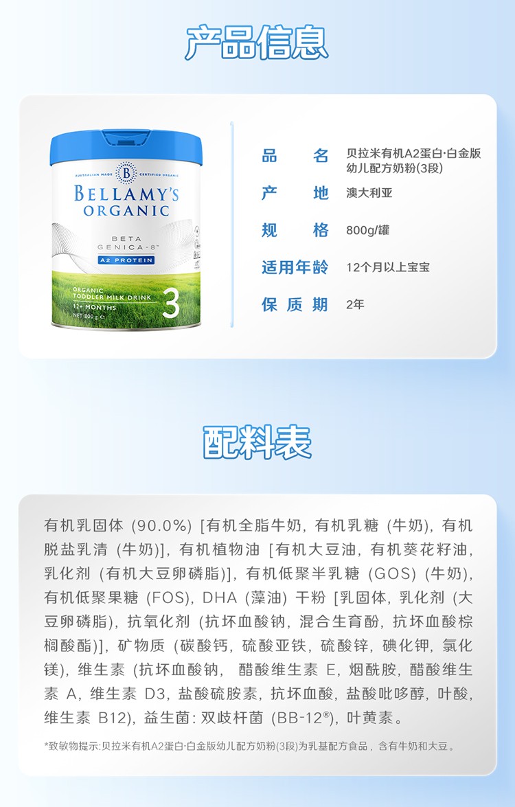 【不包税费跨境】澳洲贝拉米Bellamy‘s Organic白金版有机A2奶粉3段800g(新老包装随机发货)
