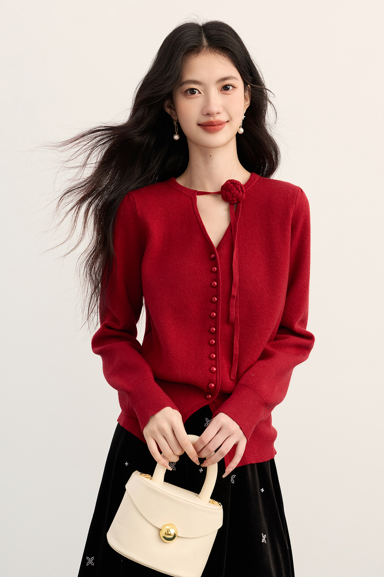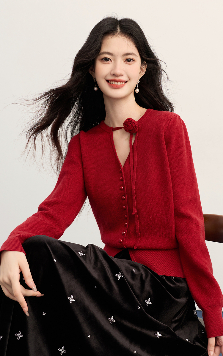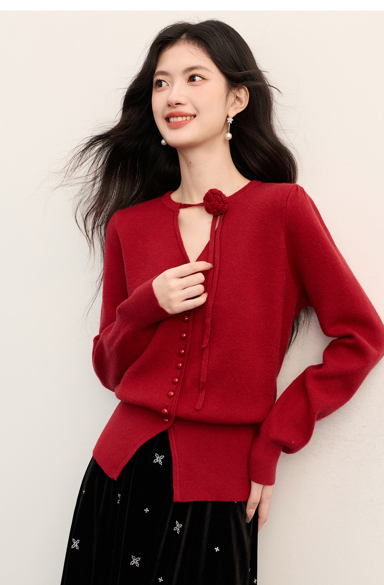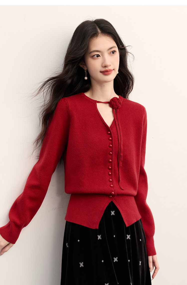 【11/19新品】熙世界氛围感立体花朵系带红色毛衣开衫女秋冬独特别致羊毛针织衫
