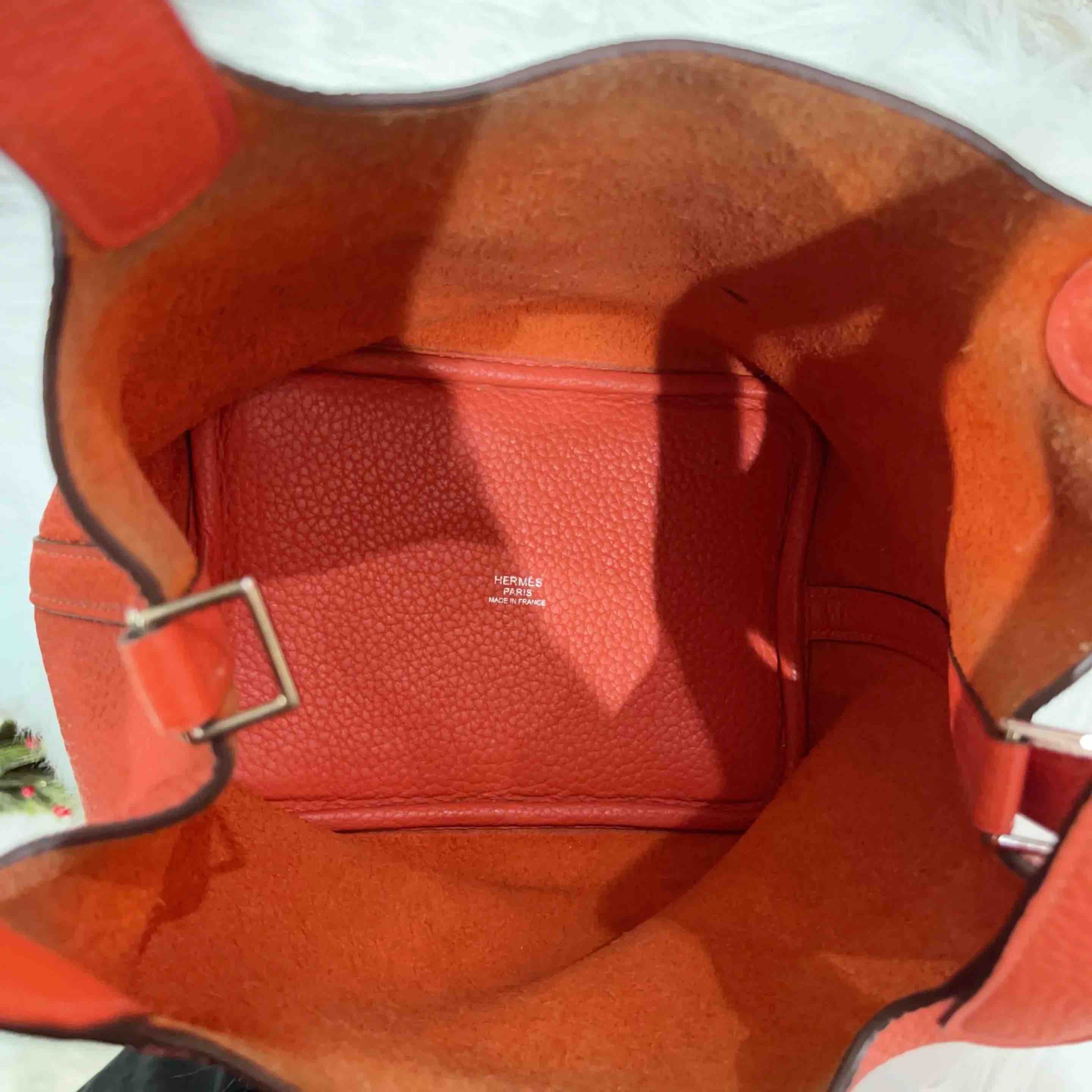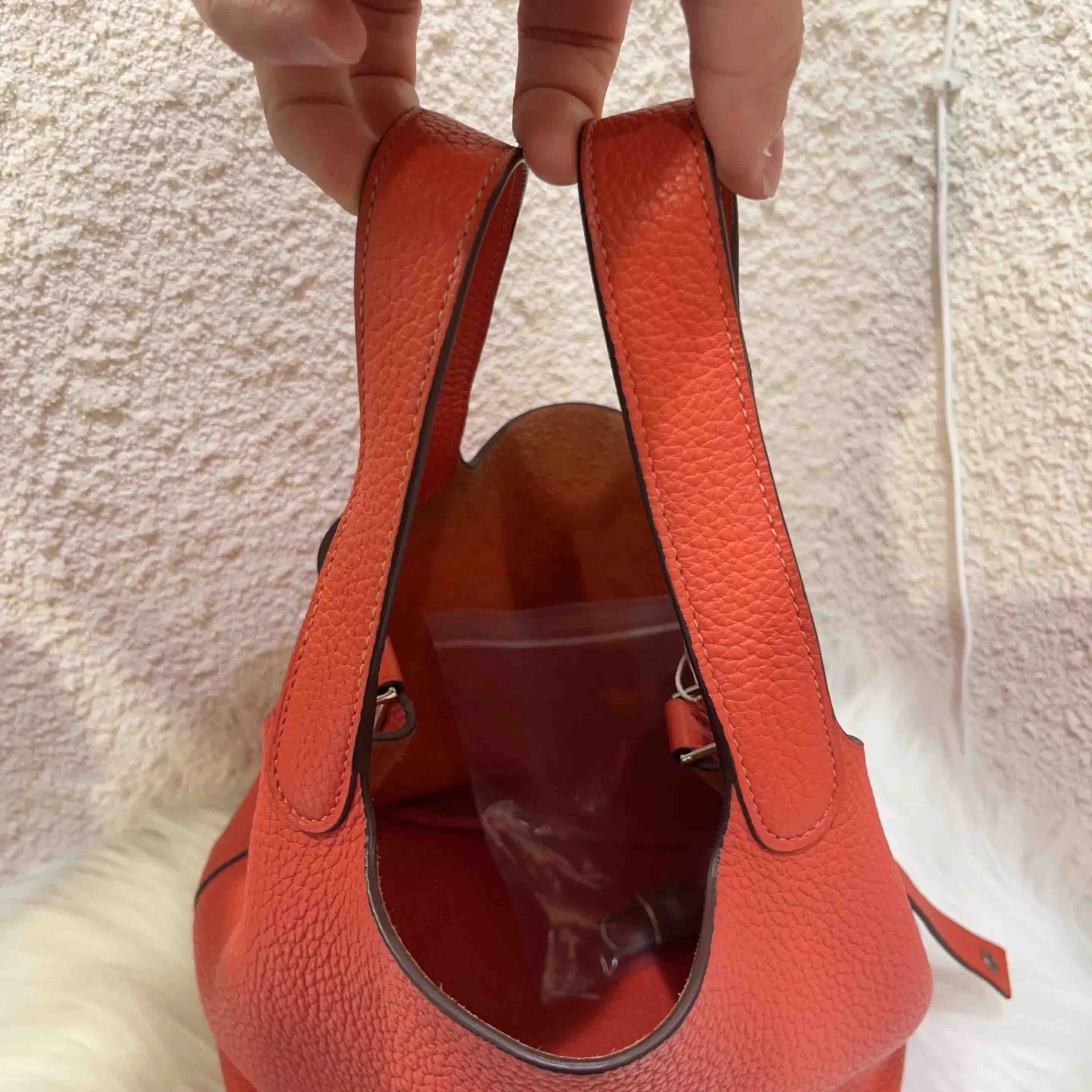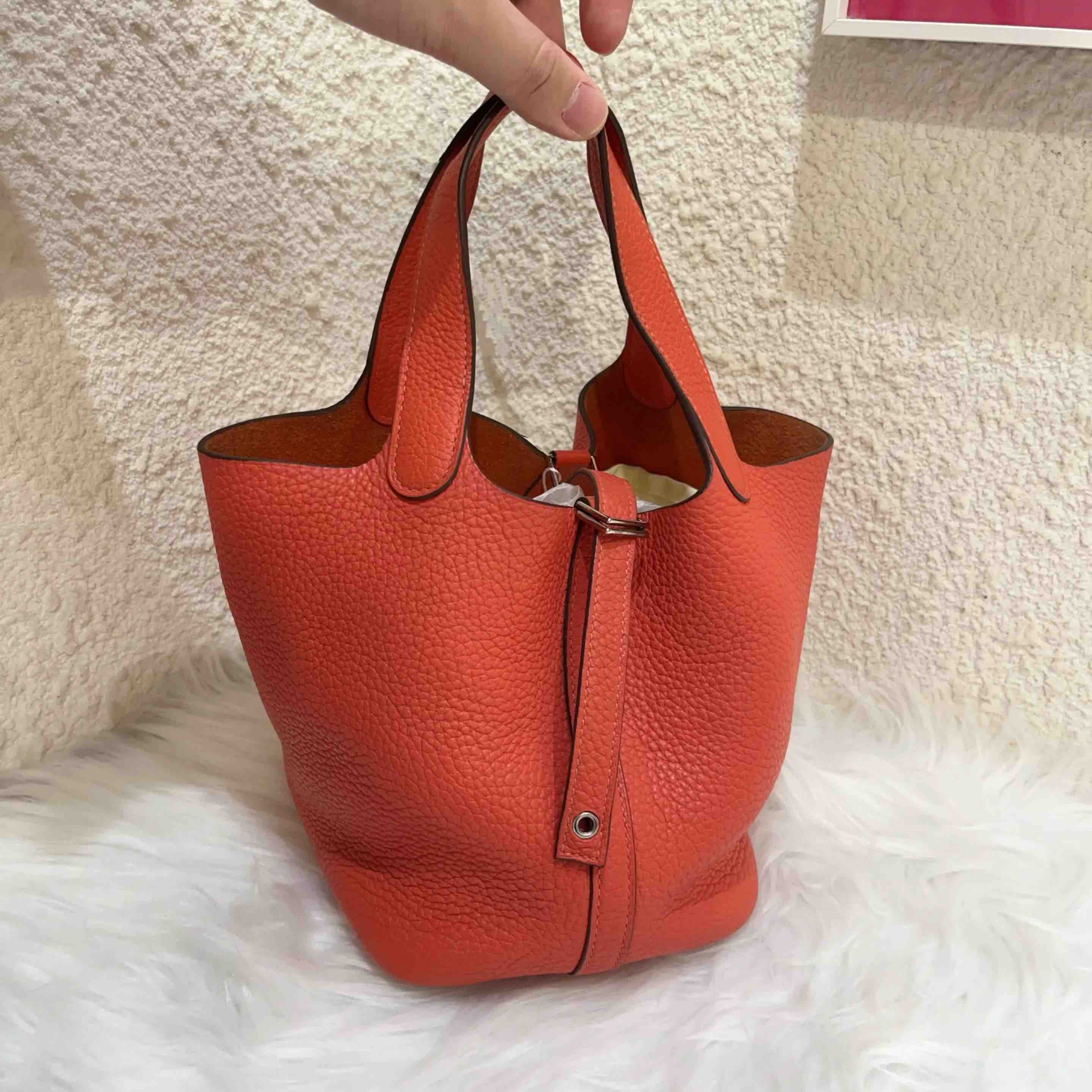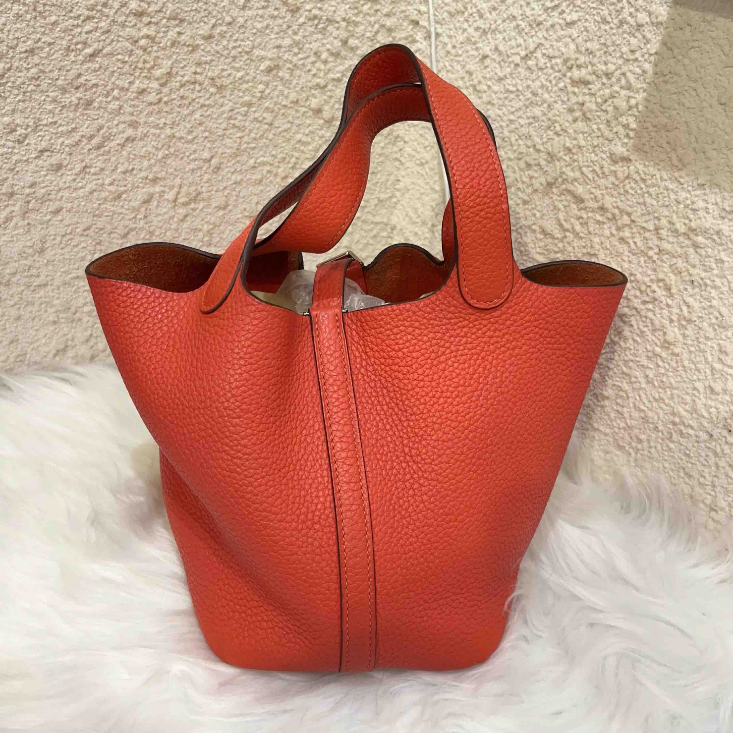 【商品详情】正品二手 爱马仕 菜篮子18 罂栗橙 Togo皮 手提包🥏 95新 18×18 框R刻 配件:钥匙 锁。内里正常使用感。带点红调的橙色 穿搭点睛之笔