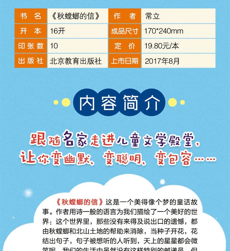 《秋螳螂的信/注音版儿童文学名家精选书系》收录了常立老师创作的经典童话故事,包括《秋螳螂的信》《爱上夜莺的捕鸟机》《没有名字的童话》等等。这些故事中有奇特的想象,如《没有名字的童话》中“童话”寻找名字的奇妙过程;有童稚的话语,如《笑笑爱垃圾桶》中笑笑与爸爸充满童趣的对话;有想象力十足的画面,如《蓝先生的画》中笑笑进入的美丽的“画”的世界。故事题材丰富,情节曲折有趣,语言亲近自然,每一个故事都能让小读者在阅读中自然地感受到故事的魅力。