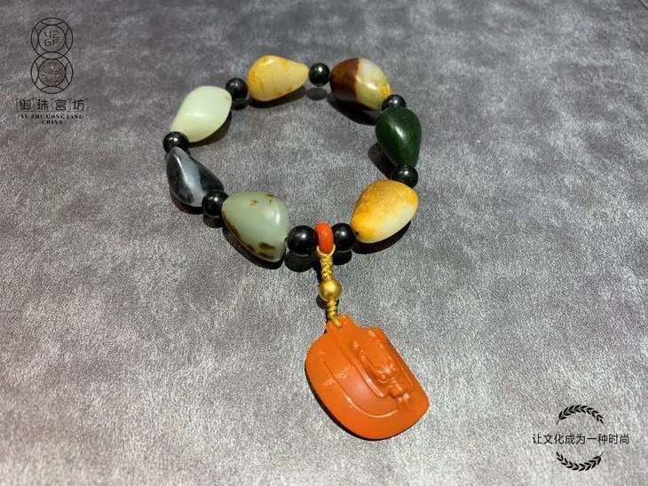 该款作品由7颗形状大小类似的玩料级新疆和田子料原石组成,颗颗独子,纯天然无修型,真皮真色,实属难得。原石间用8颗子料墨玉珠分隔,同时用南红环和24K古法金珠连接搭配了一款满色满肉的原矿柿子红南红龙牌吊坠,该龙牌为苏州御珠-天语玉雕工作室首席工艺师亲工作品,整条手串材质珍贵,设计精美,低调奢华,是一款可以自戴传家的精品。