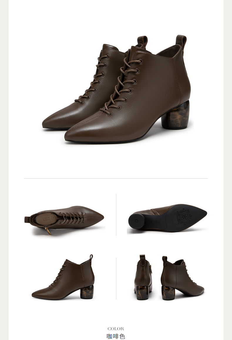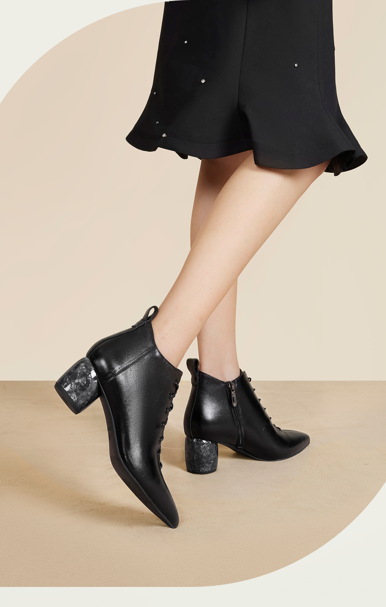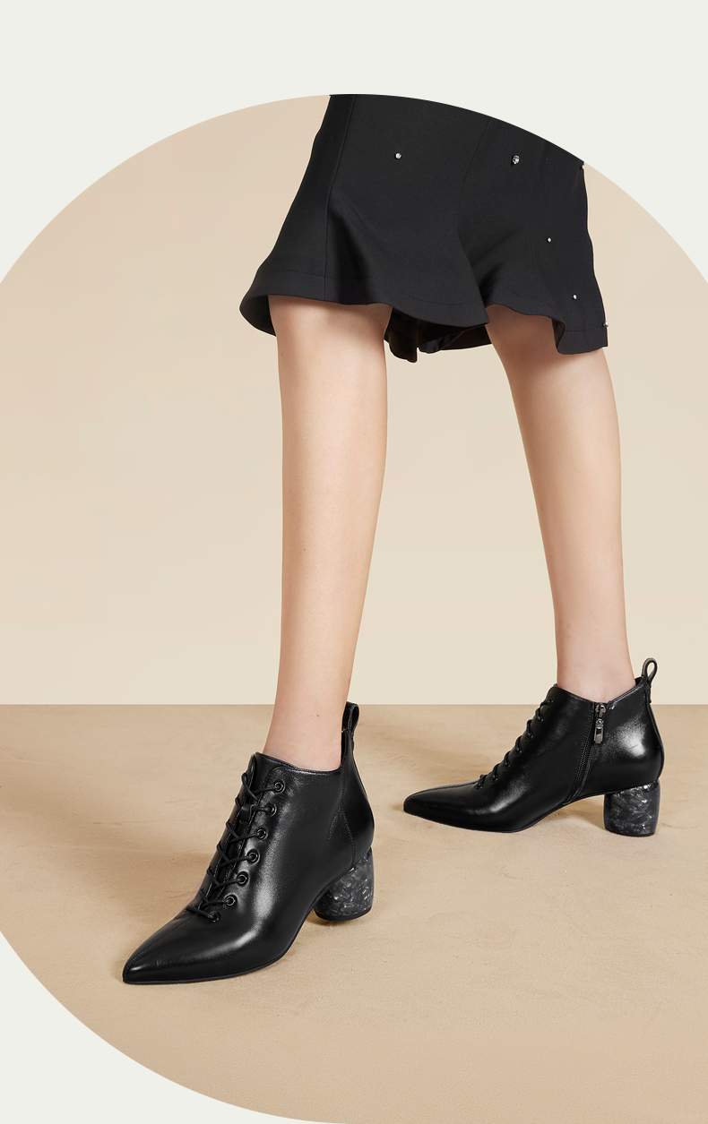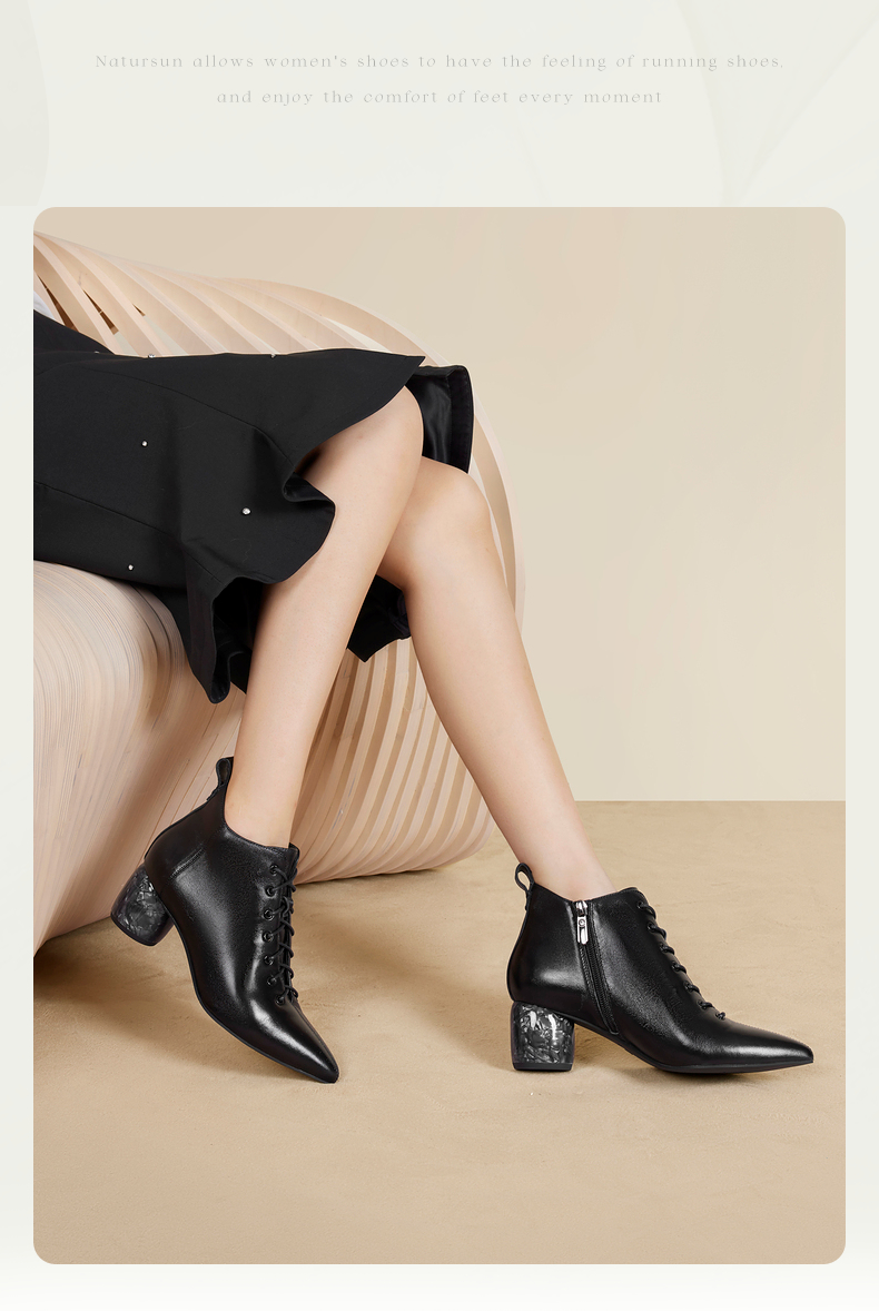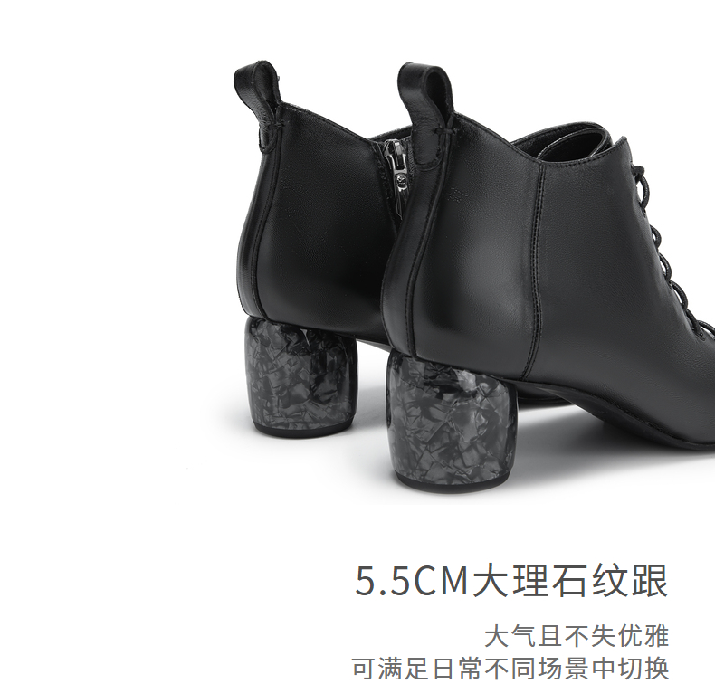 natursun法式时装靴秋冬季时尚气质尖头粗跟大理石纹短靴女鞋N24526815