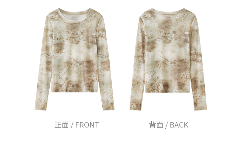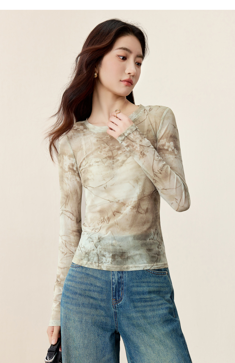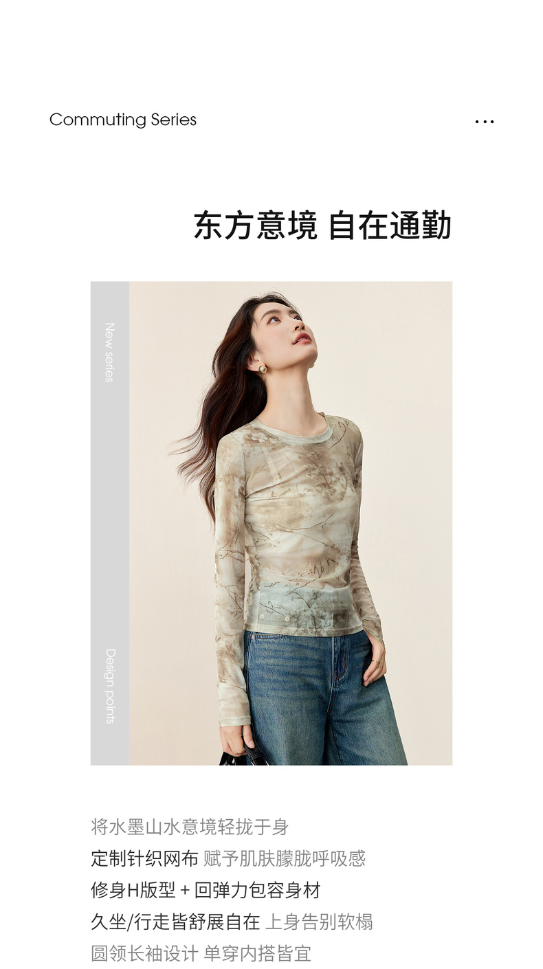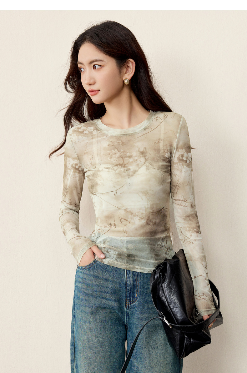 【内购】【新中式】山水画印花朦胧感透气网布上衣修身H版圆领长袖套头衫-153TE2713