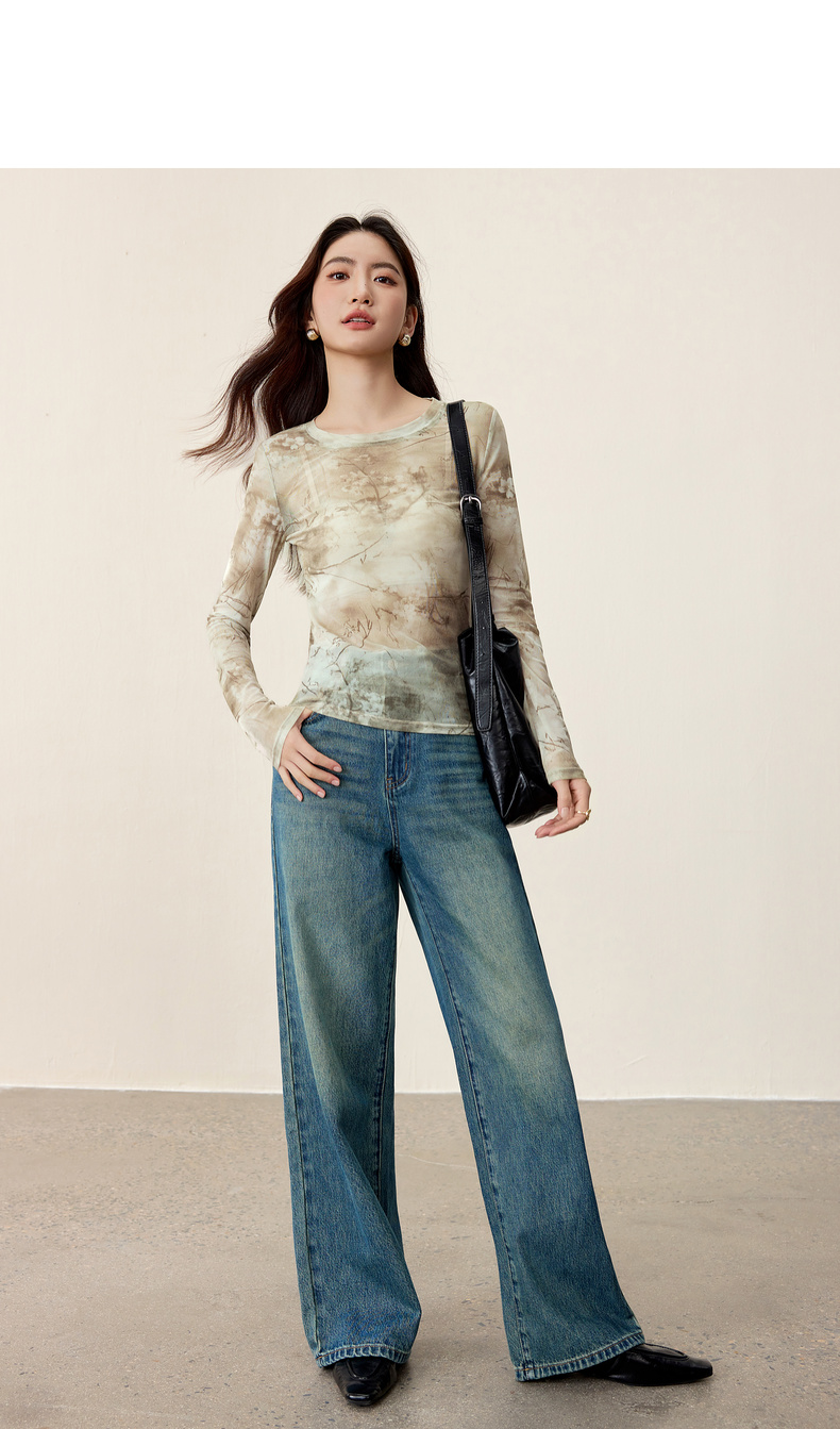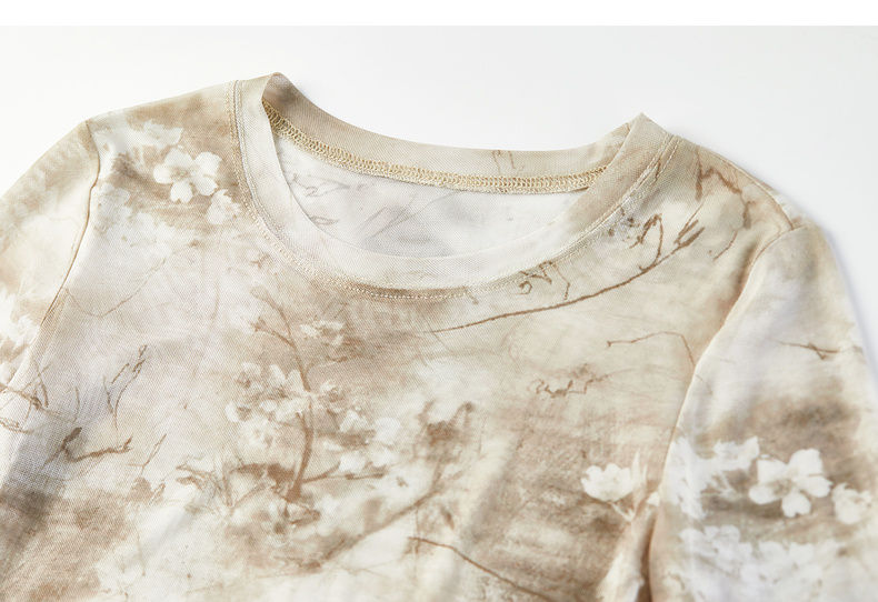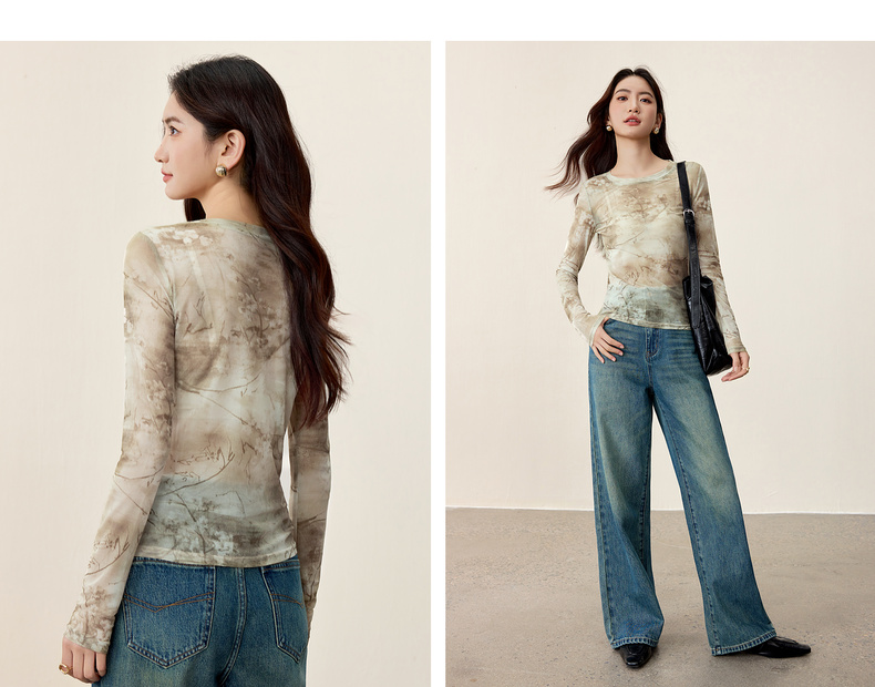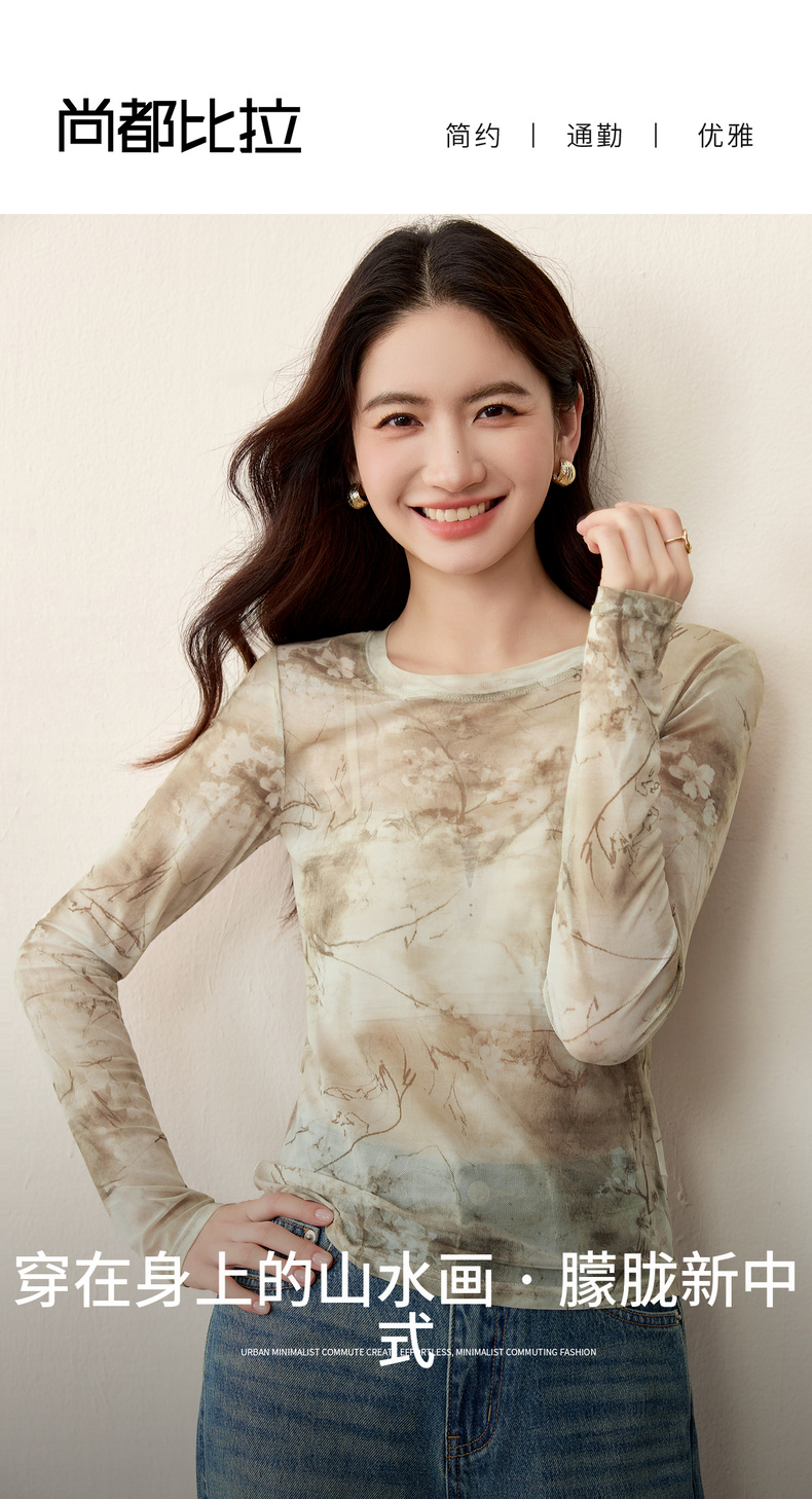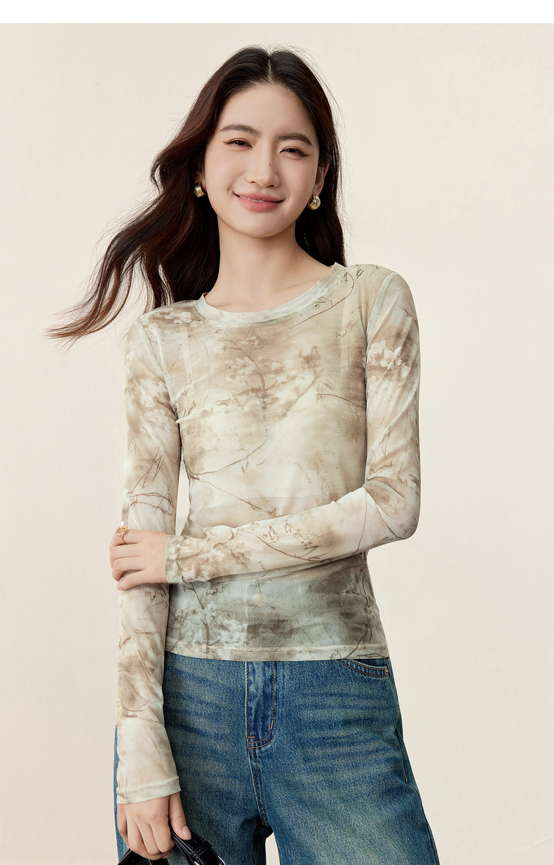【内购】【新中式】山水画印花朦胧感透气网布上衣修身H版圆领长袖套头衫-153TE2713