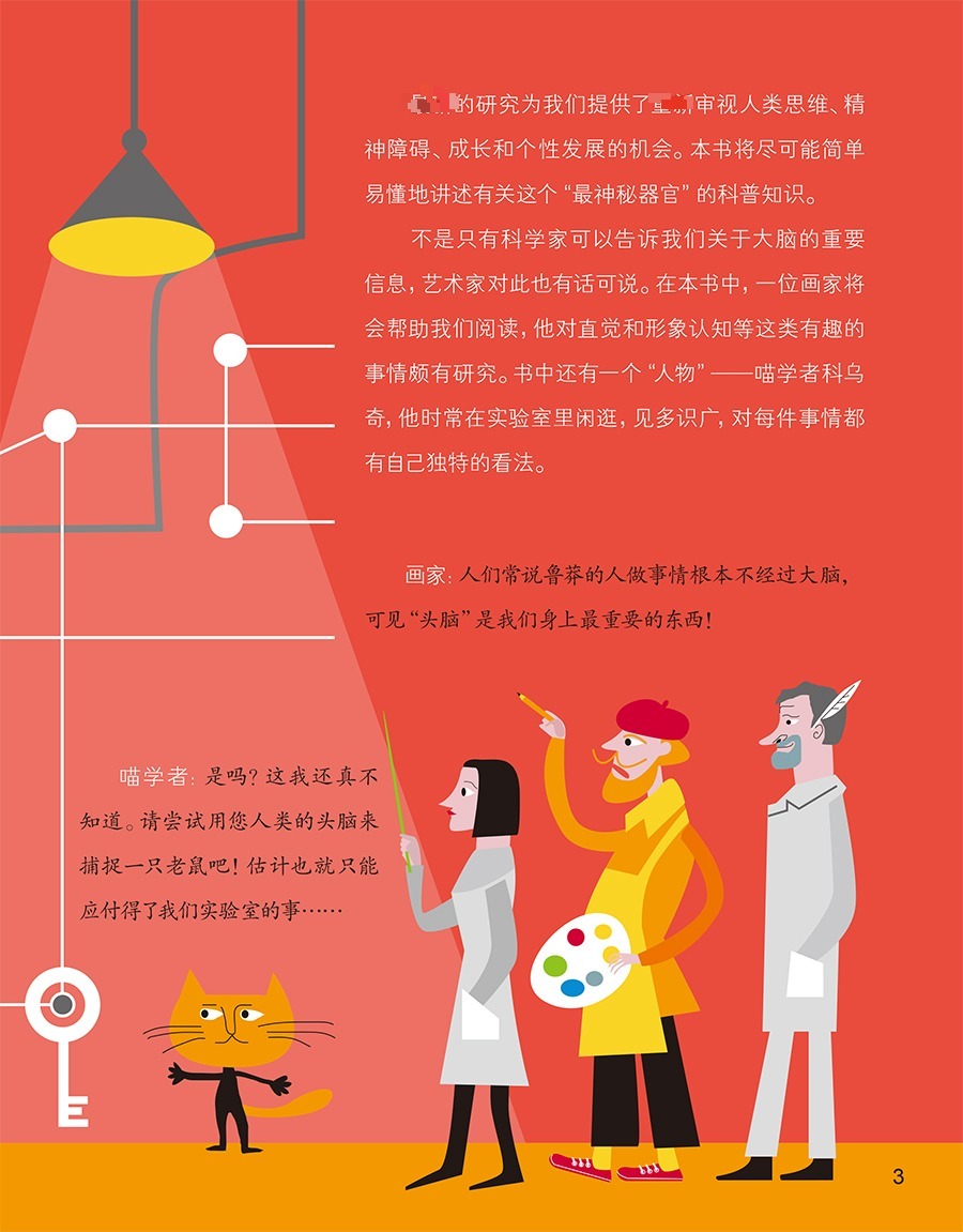 适读对象:9~12岁儿童。图书形式:图文并茂的科普绘本。以小朋友喜爱的漫画图片为切入点,进行有关生命健康的科普知识讲解。引导孩子学习关于大脑的科普知识,帮助孩子健康成长,可供亲子阅读。故事内容:本书主要讲述了人类大脑与动物大脑的根本区别、睡眠中的大脑活动、控制大脑效率的能力等等。此外,书中还有大量有关大脑和神经系统的发现,有关我们的大脑未解之谜的信息以及有关神经生物学领域等趣味知识。特点:轻松而生动,大量插图和具有象征意义的叙述方式有助于人们理解主题。