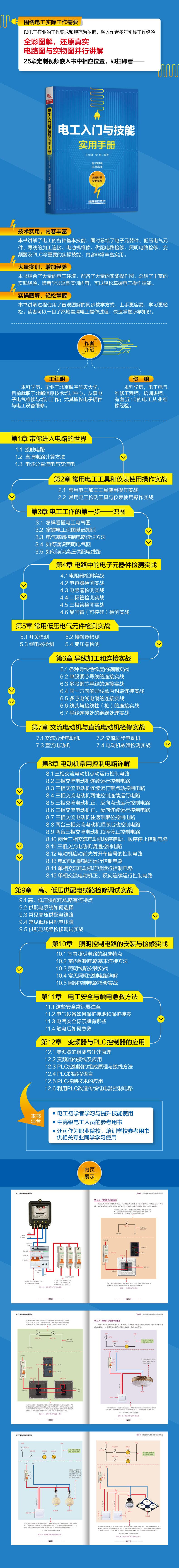 一、为什么写这本书电工是一个技术考究的行业,电工领域是目前世界上涉及面zui广的,几乎任何行业都离不开电,电工的需求量很高,因此只要你掌握了电工的操作技能,就可以轻松找到一份关于电工的工作。那么如何让初学者能够在短时间内掌握电工从业的知识和技能呢?其实也不难,只要“多看、多学、多问、多练”。通过学习来掌握电工的基本技能,而学习就需要一本好的电工学习资料,不但有丰富的电工知识、还有大量的电工实操用于增加读者的经验。这也是作者写作本书的目的。本书围绕电工实际工作需要,以电工行业的工作要求和规范为依据,采用全彩图解的方式,全面系统地讲解了电工的操作技能。本书是专为电工用户而编写的,为电工学习人员提供师傅带徒弟式的教程,使其快速成长为专业的电工。二、全书学习地图本书开篇首先介绍电工的基本知识和电工常用工具和仪表的使用方法,然后讲解了电工识图方法、电子元器件的检测实战、低压电气元件检测实战、导线的加......