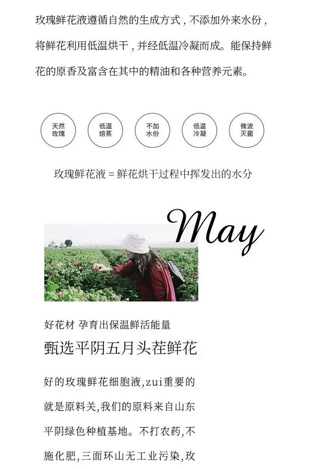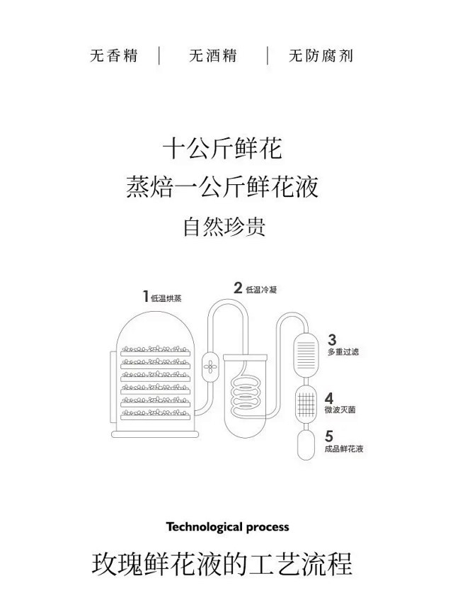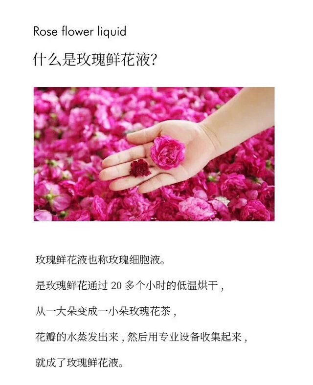 大马士革玫瑰鲜花液即是大马士革玫瑰提取液,是大马士革玫瑰低温烘干过程中蒸发的水分,通过专业设备收集而得,且10公斤鲜花才能出1公斤鲜花液…
