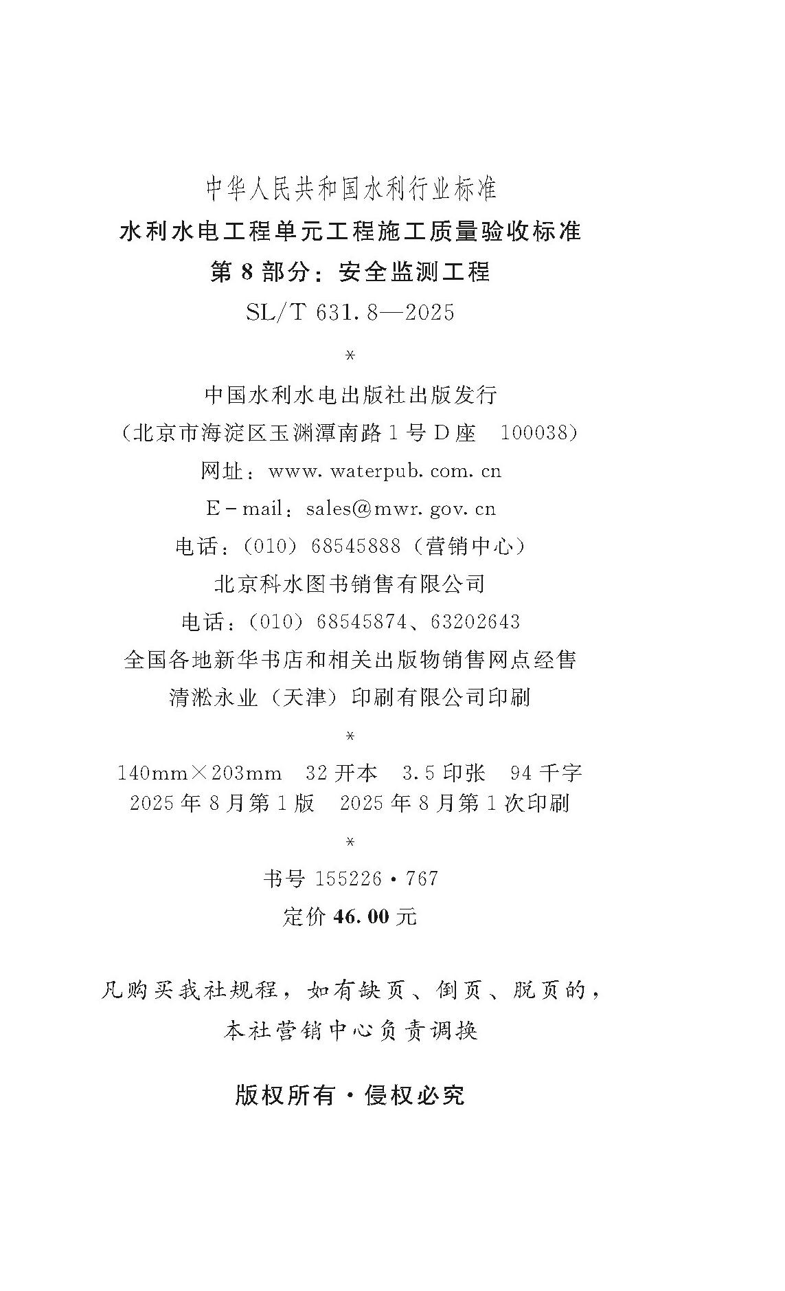 SL/T631.8-2025水利水电工程单元工程施工质量验收标准 第8部分:安全监测工程(中华人民共和国水利行业标准) 155226·767