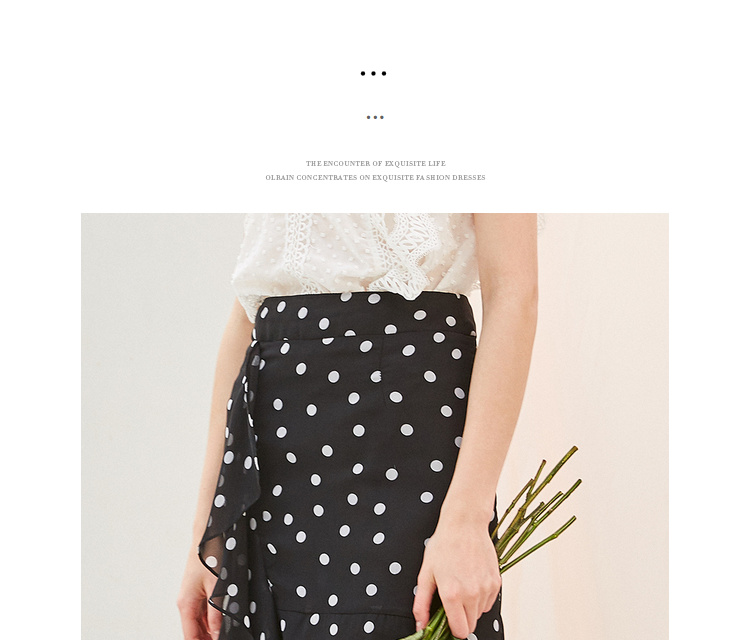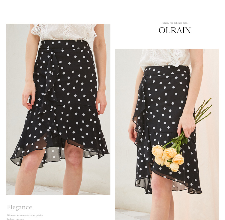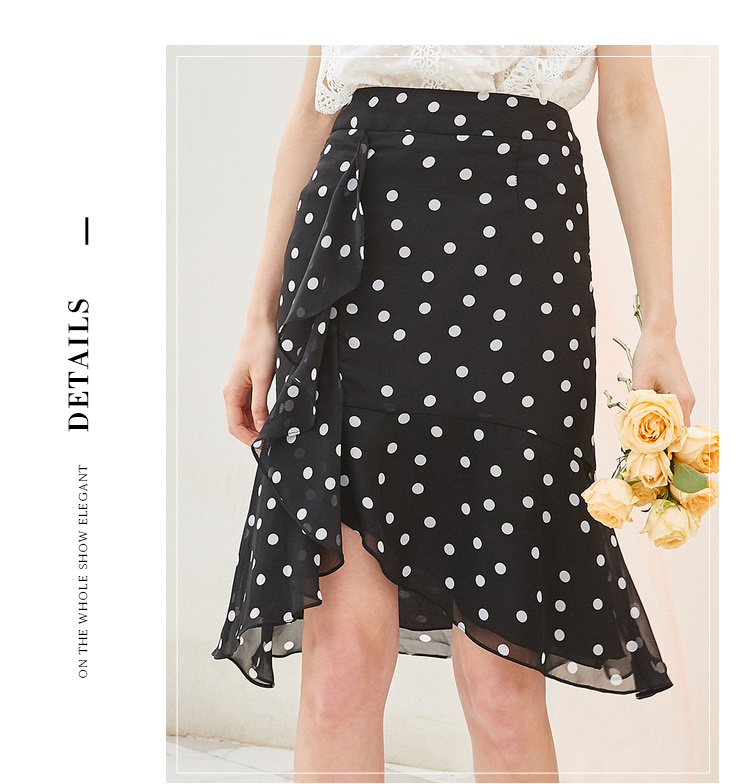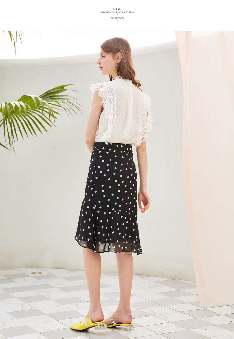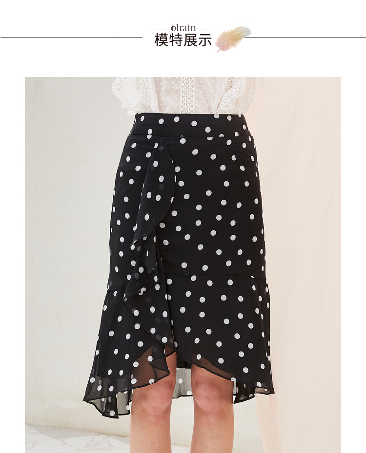 欧芮儿夏装2019新款女装黑白波点鱼尾裙女中长款不规则荷叶边裙