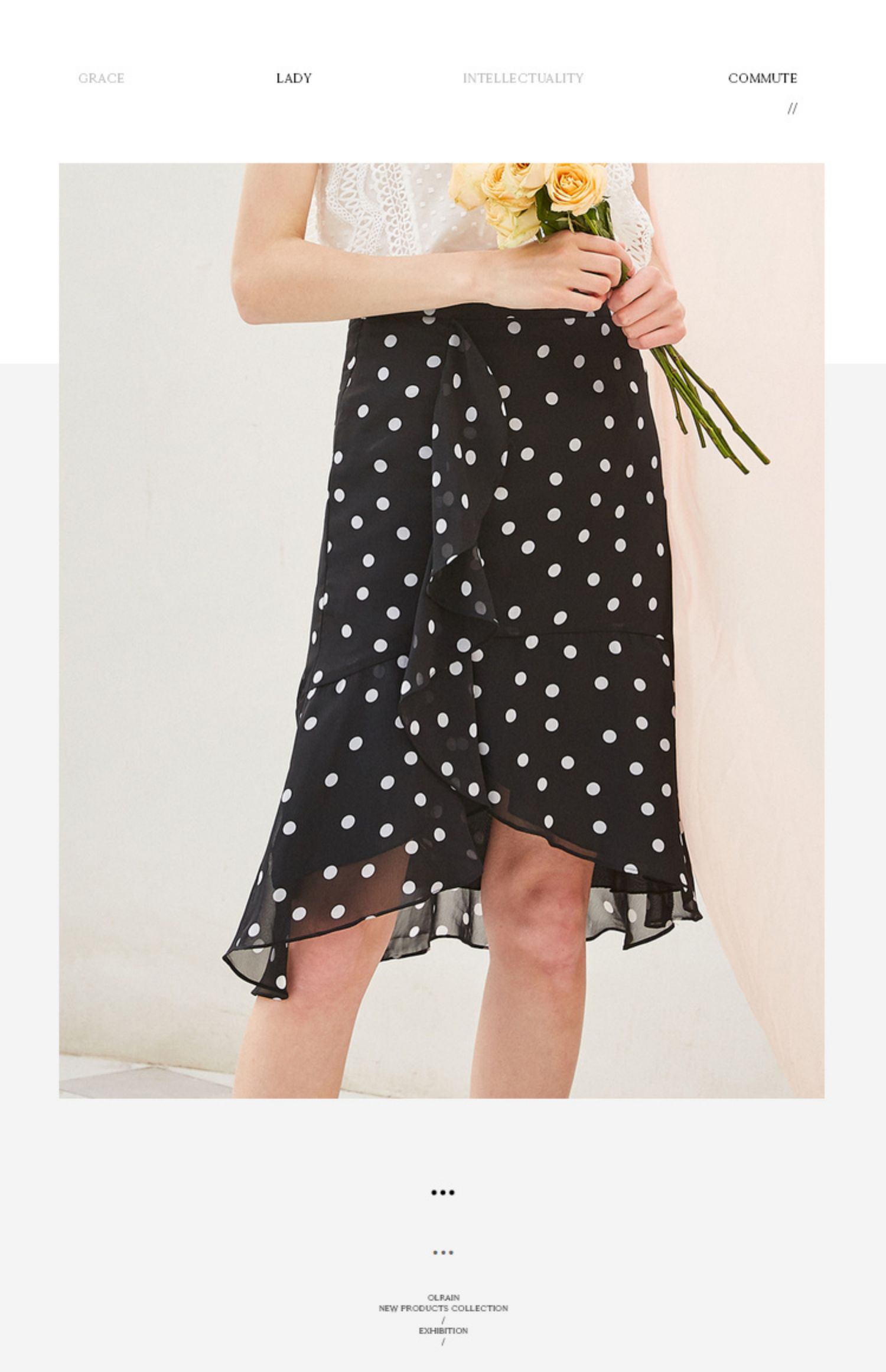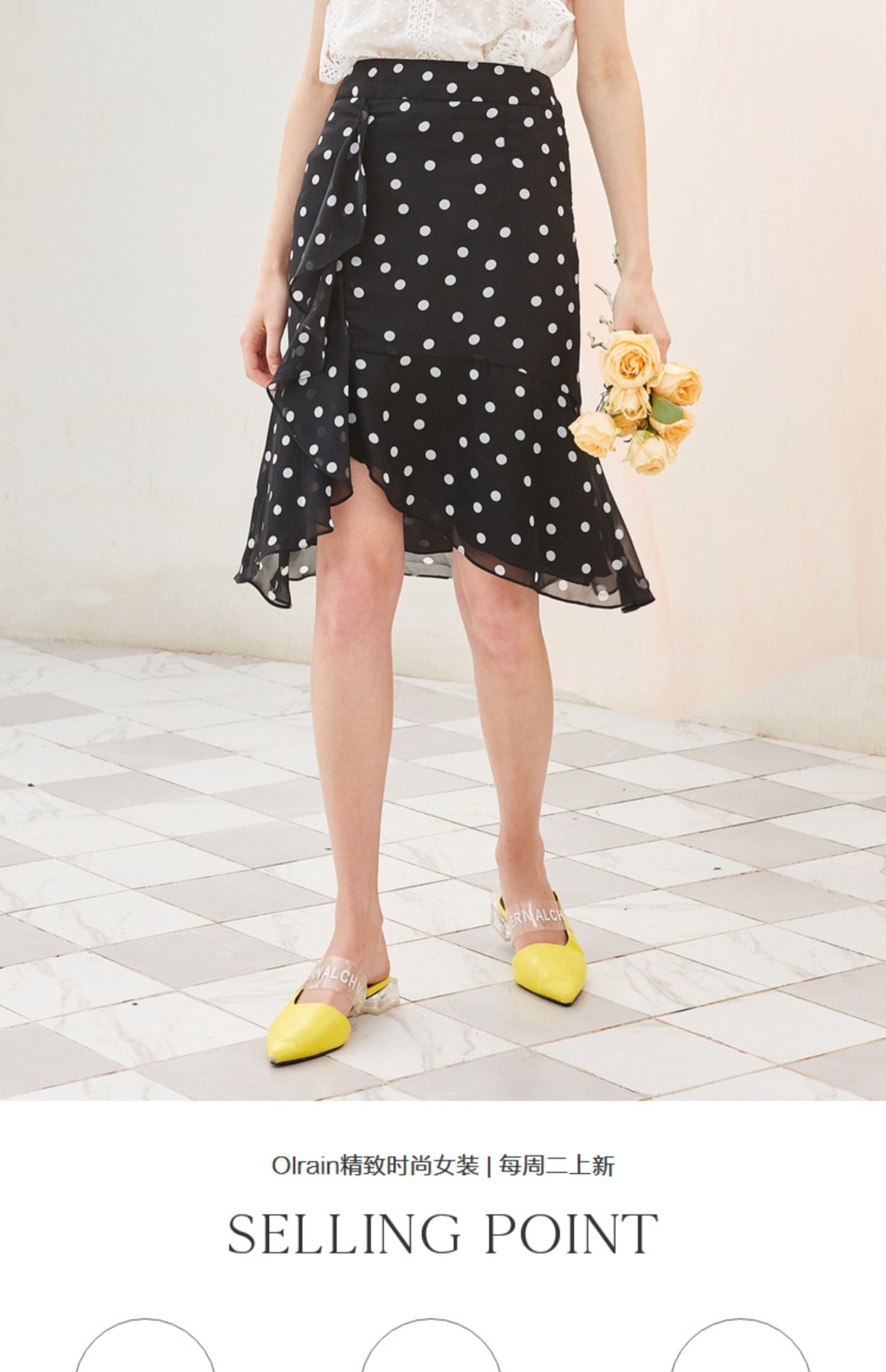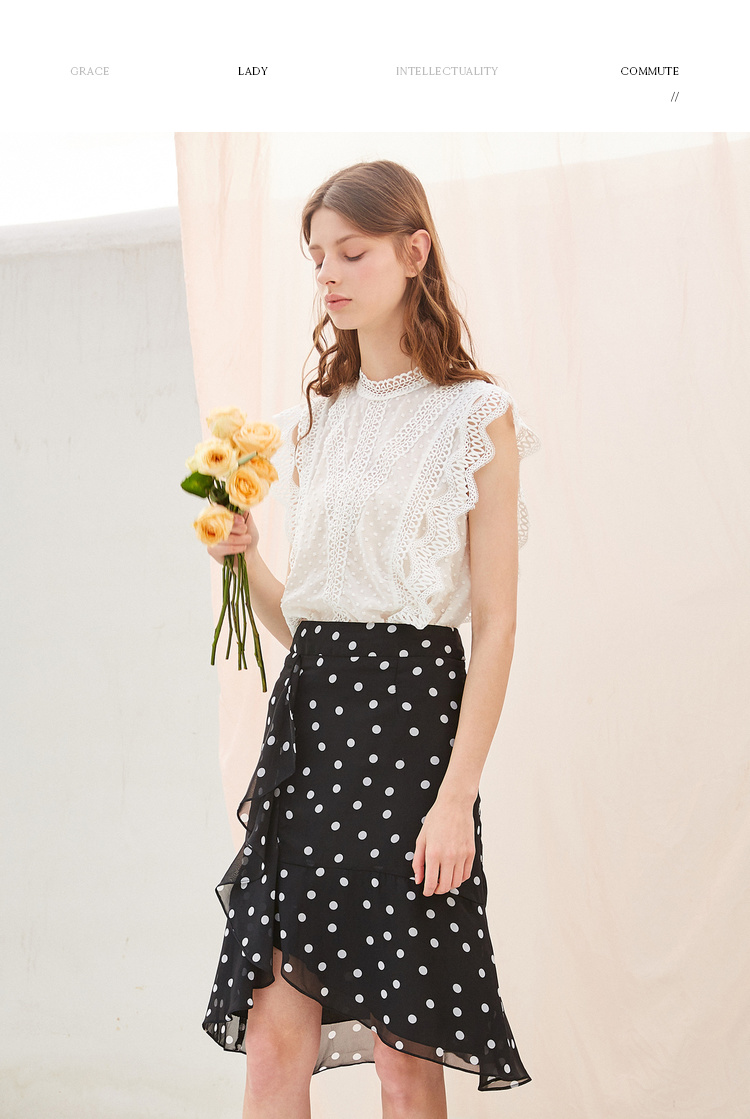 欧芮儿夏装2019新款女装黑白波点鱼尾裙女中长款不规则荷叶边裙