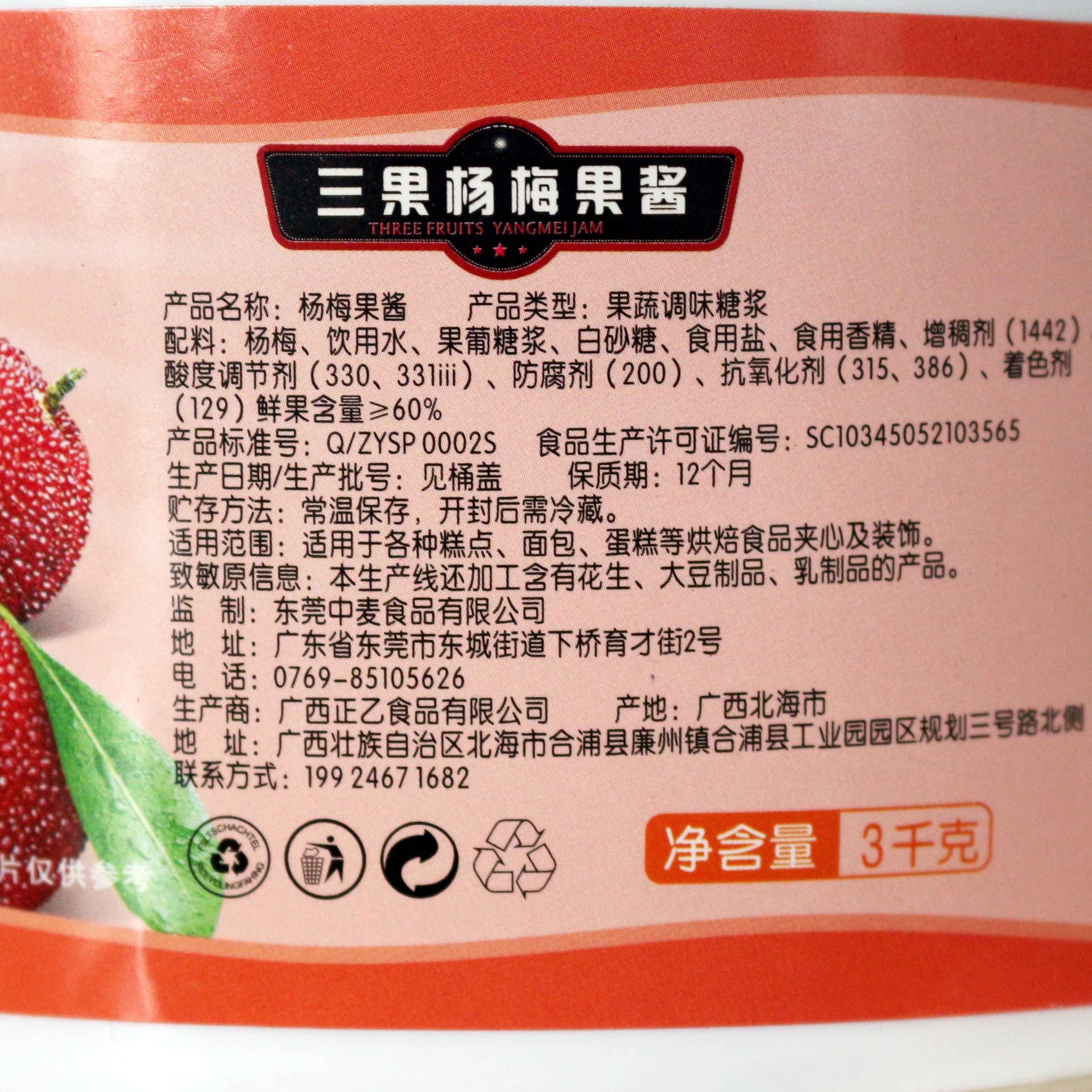 3kg 三果 杨梅果酱 杨梅果粒馅 面包蛋糕甜品夹层夹心饮品果酱