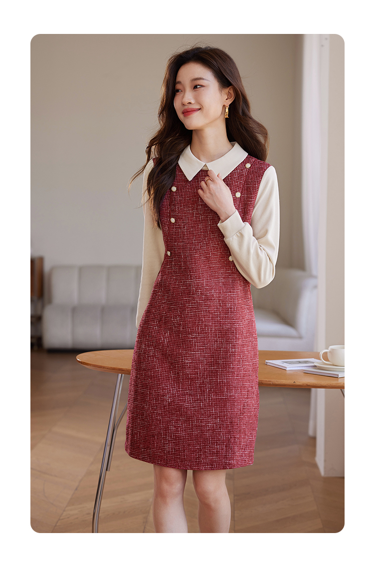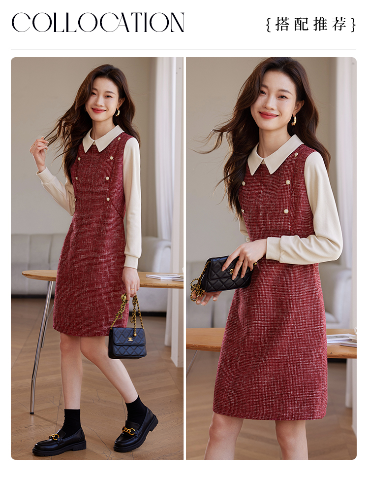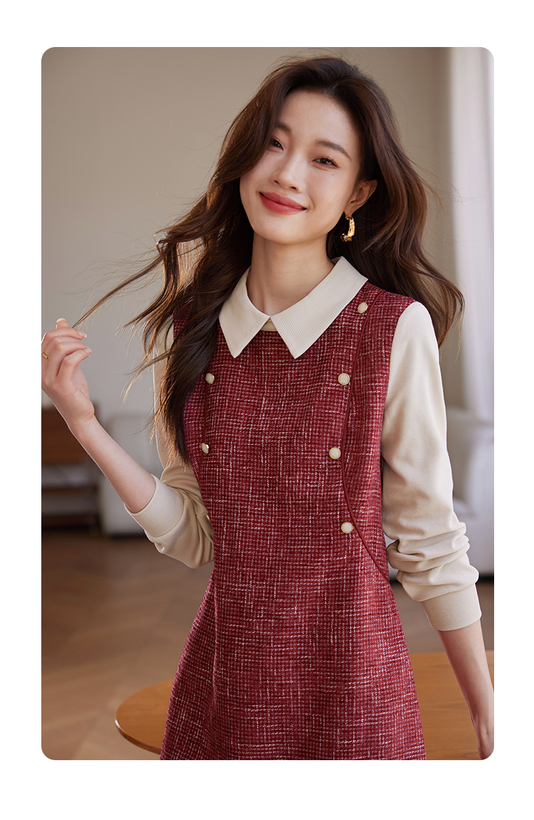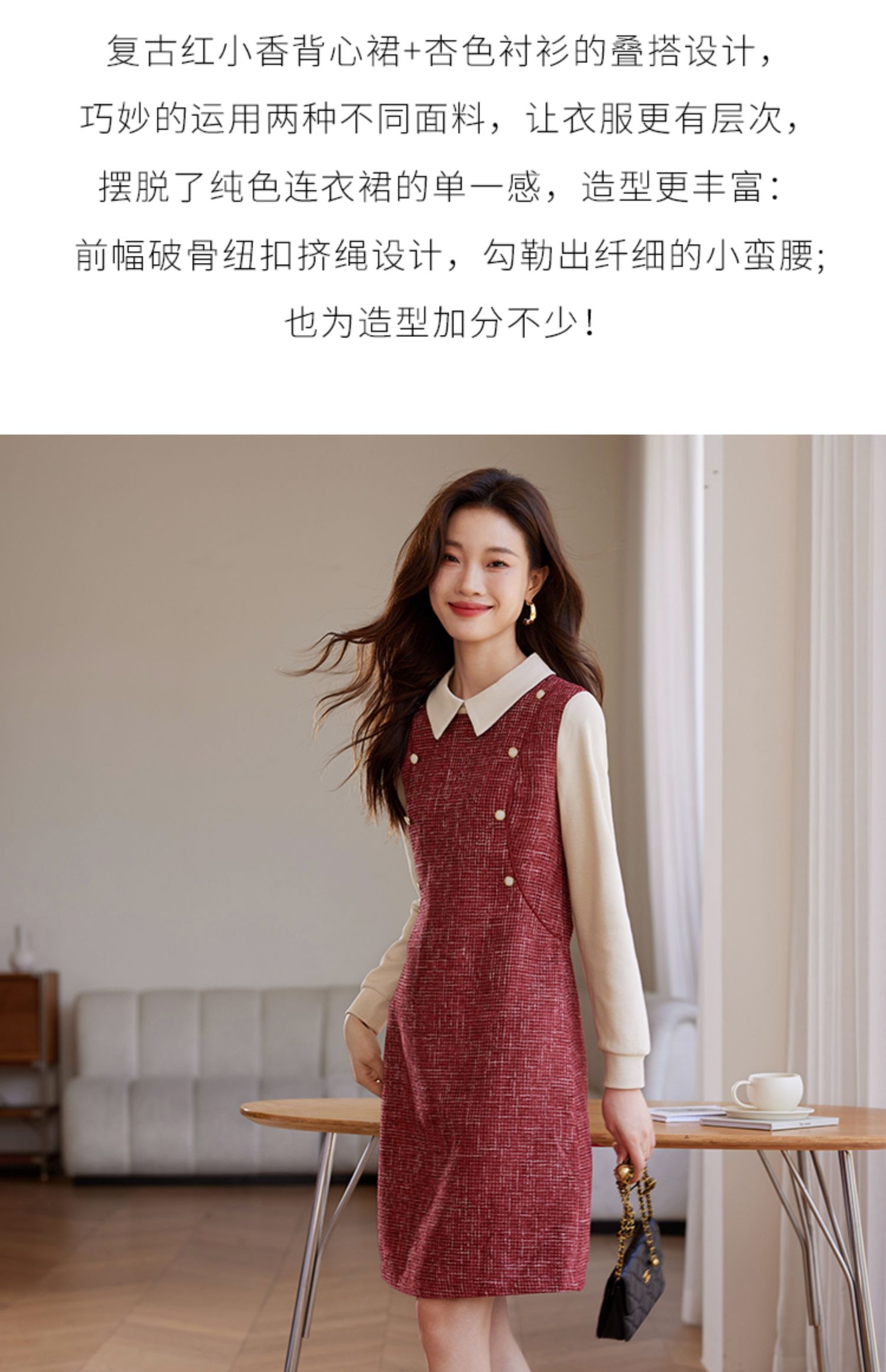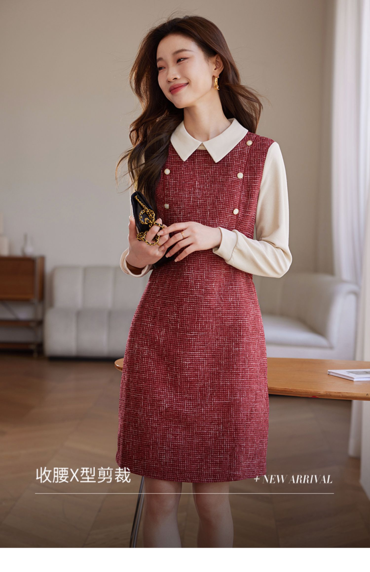 【年终特卖】熙世界小香风气质连衣裙女秋冬衬衫领拼接假两件裙子