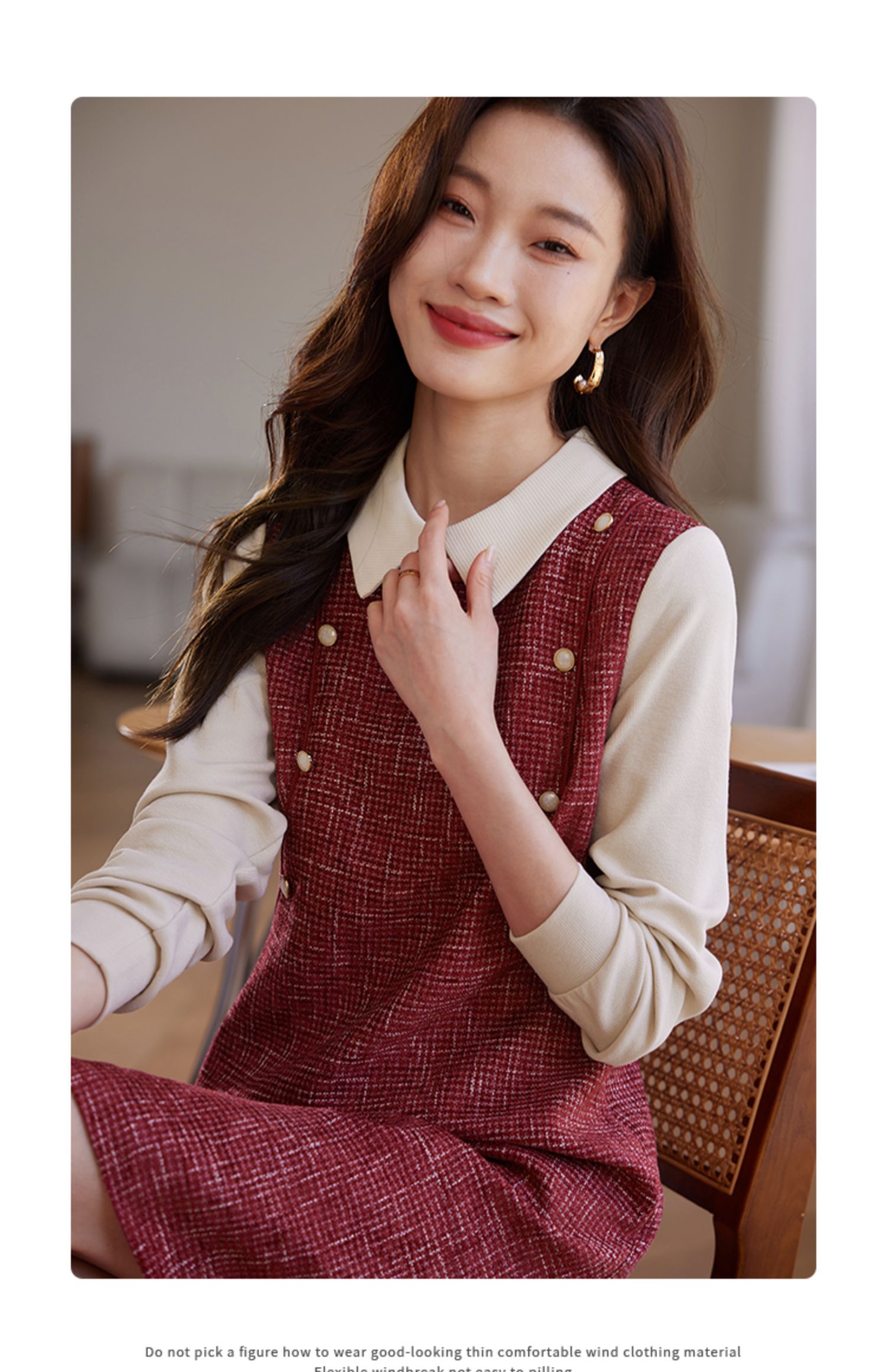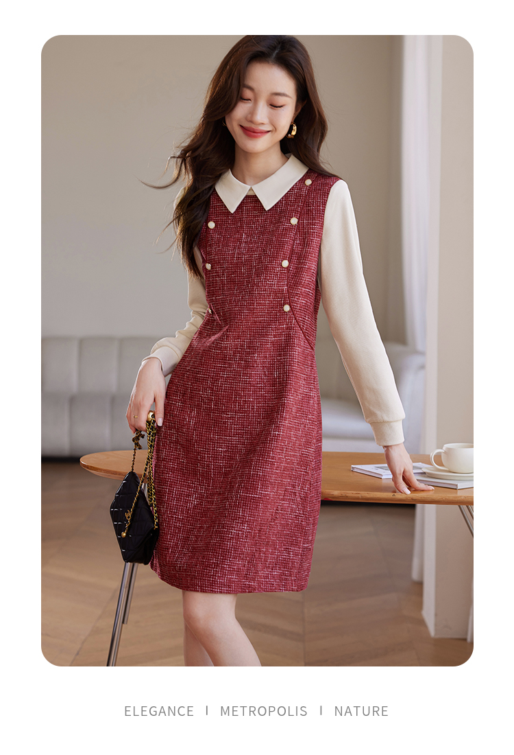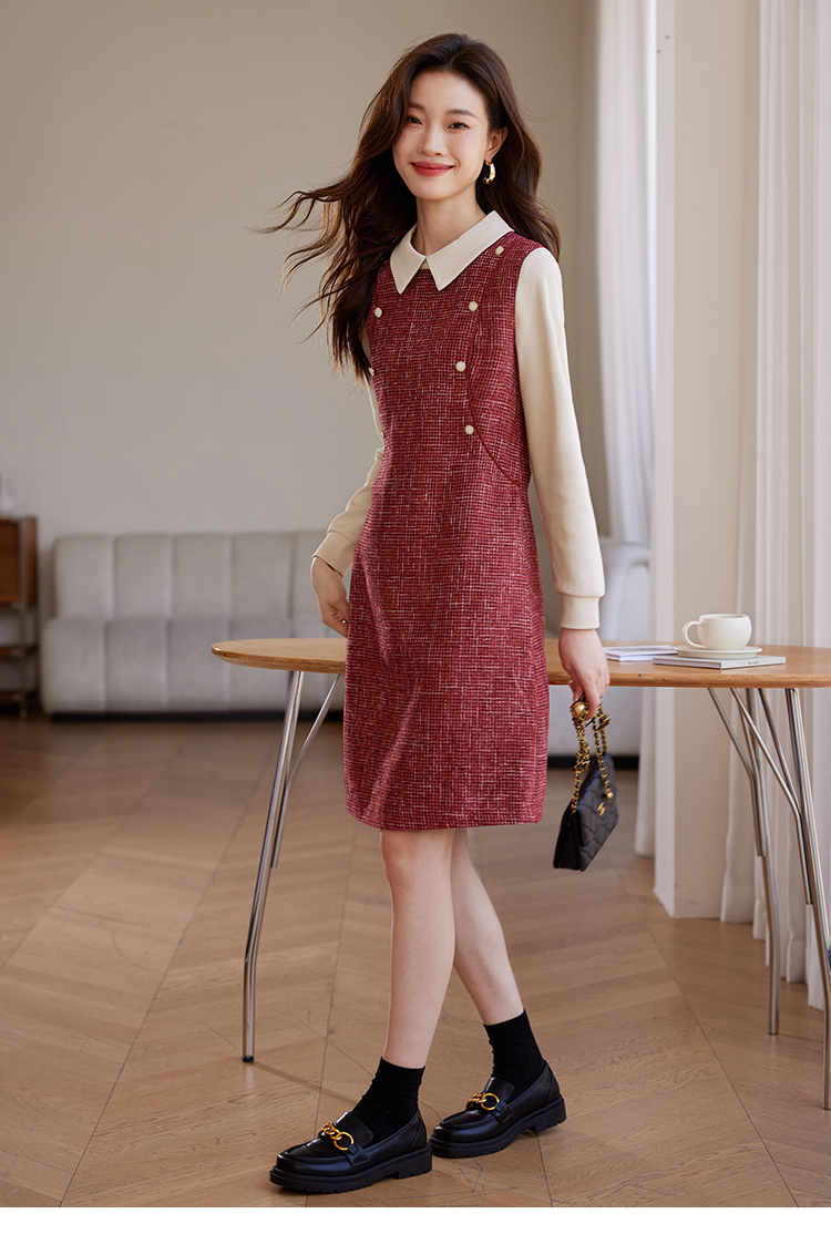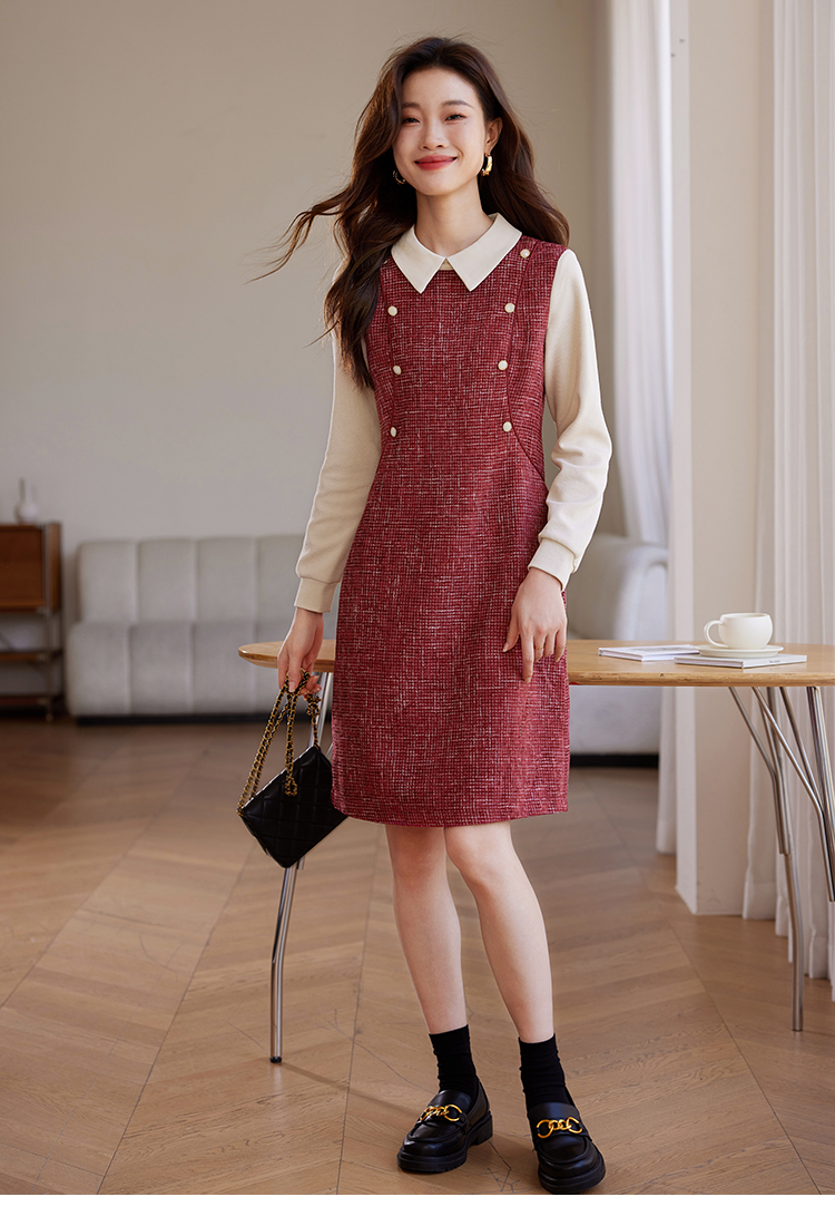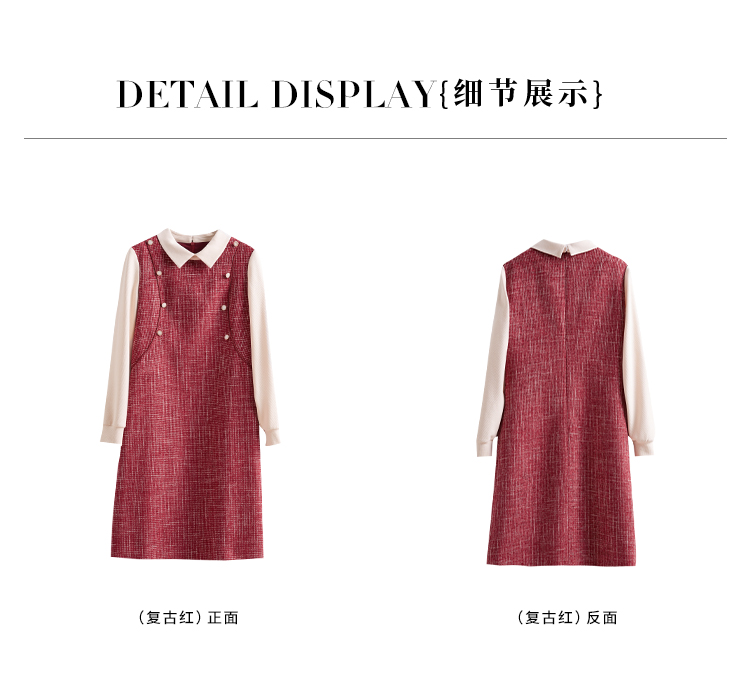 【年终特卖】熙世界小香风气质连衣裙女秋冬衬衫领拼接假两件裙子