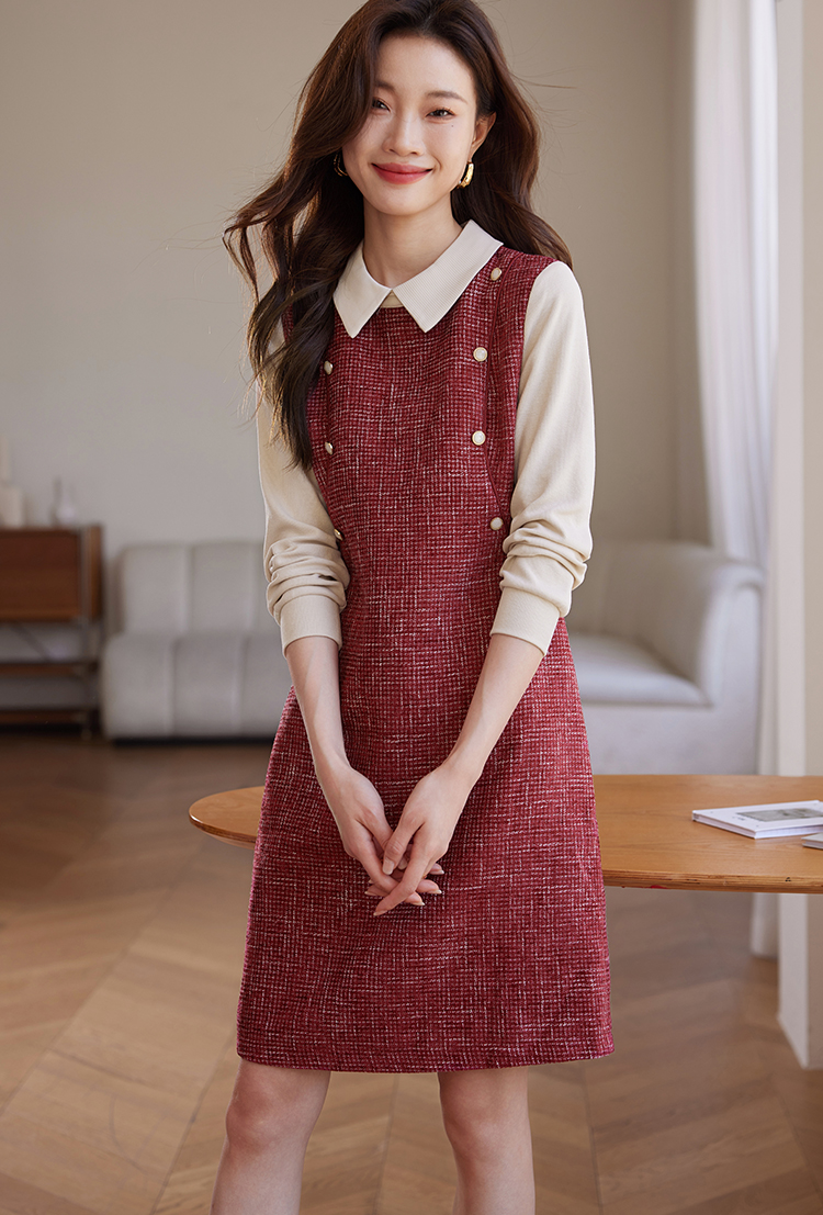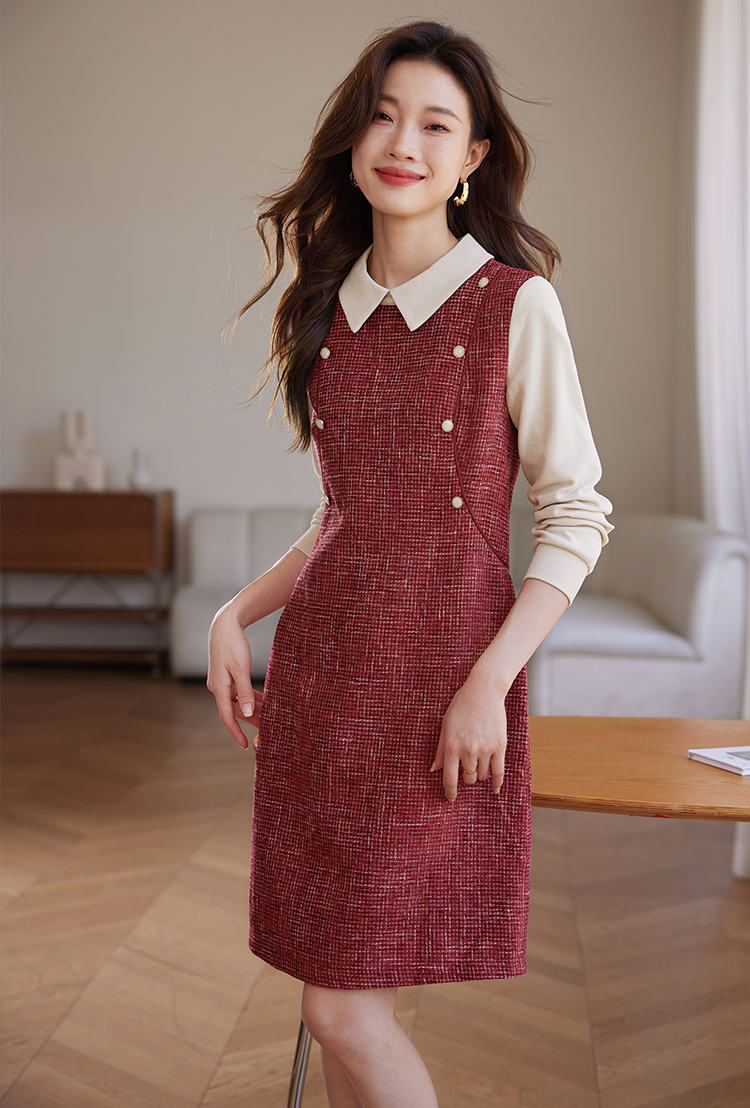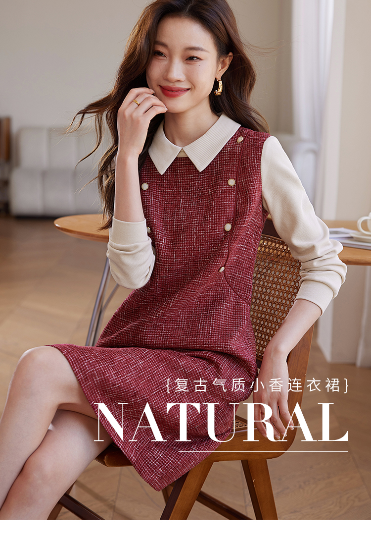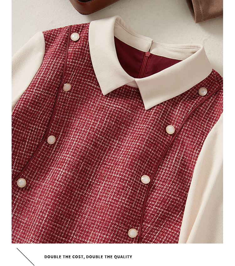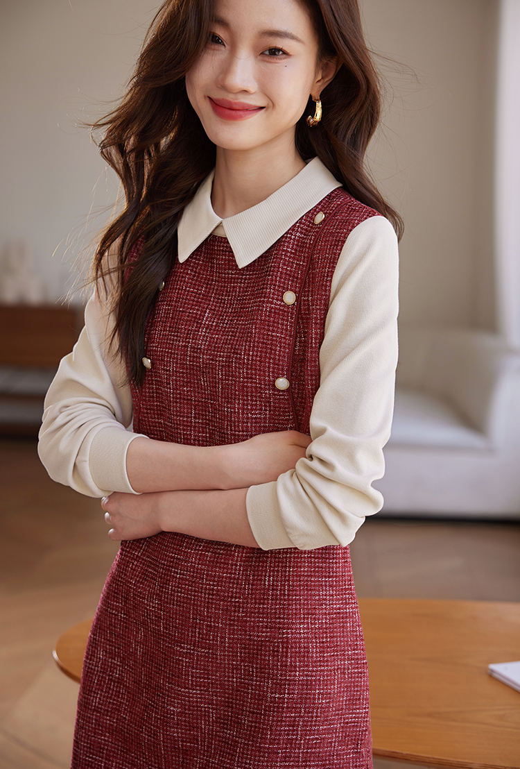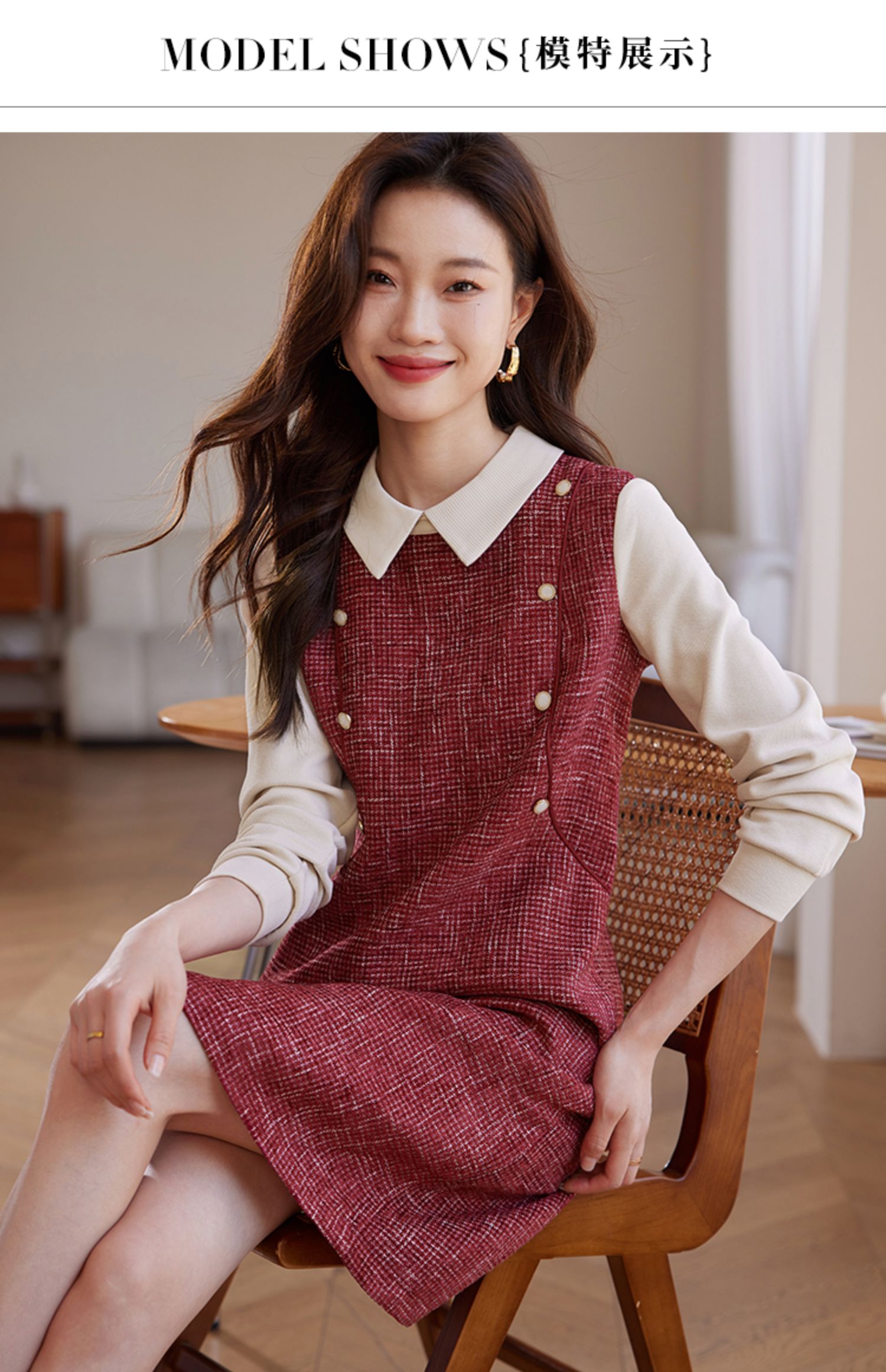 【年终特卖】熙世界小香风气质连衣裙女秋冬衬衫领拼接假两件裙子