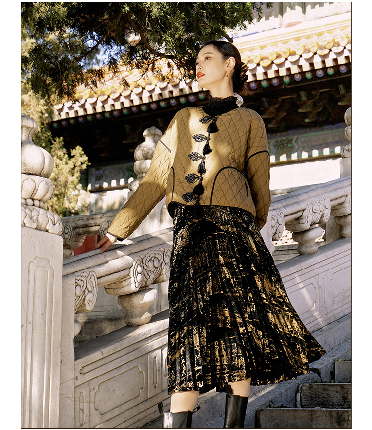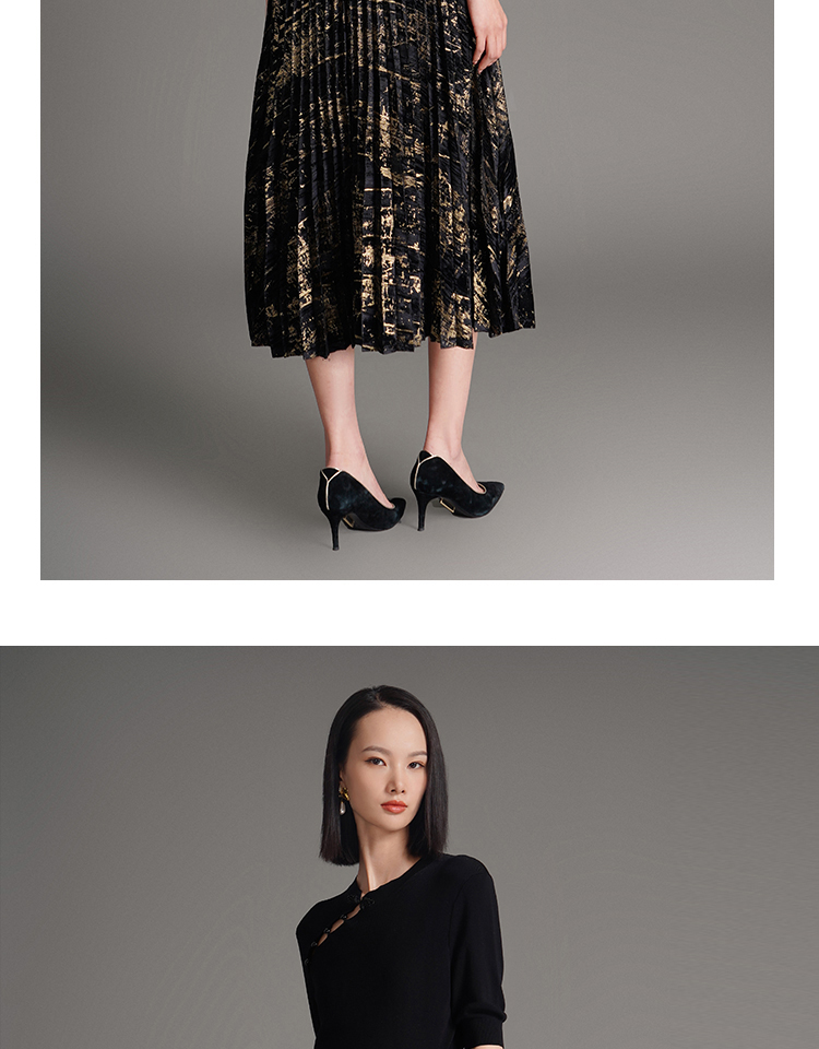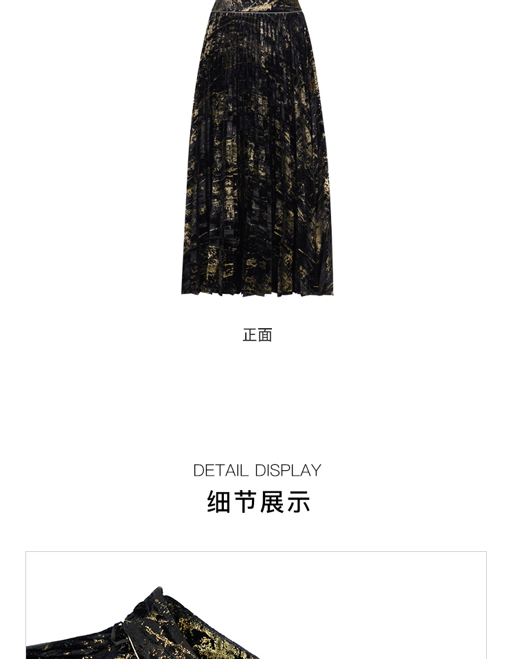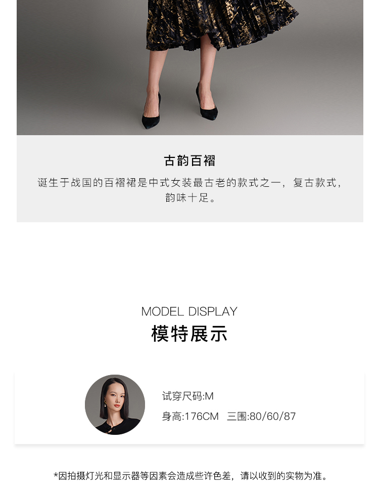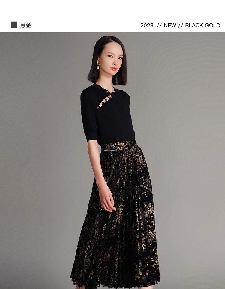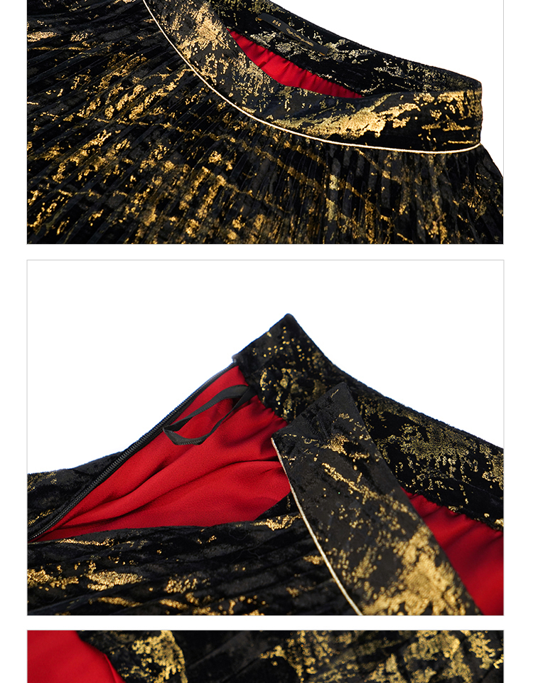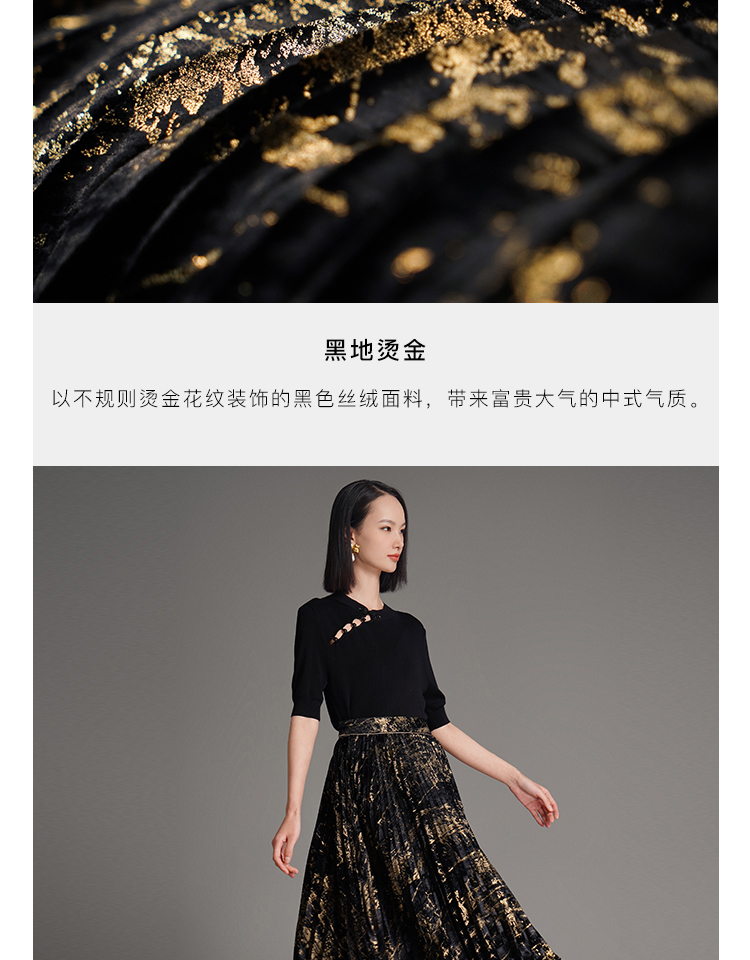 郭培成衣品牌烫金黑色丝绒国风百褶裙