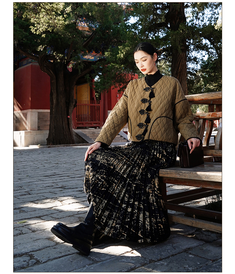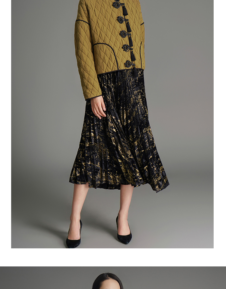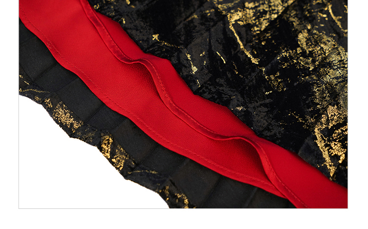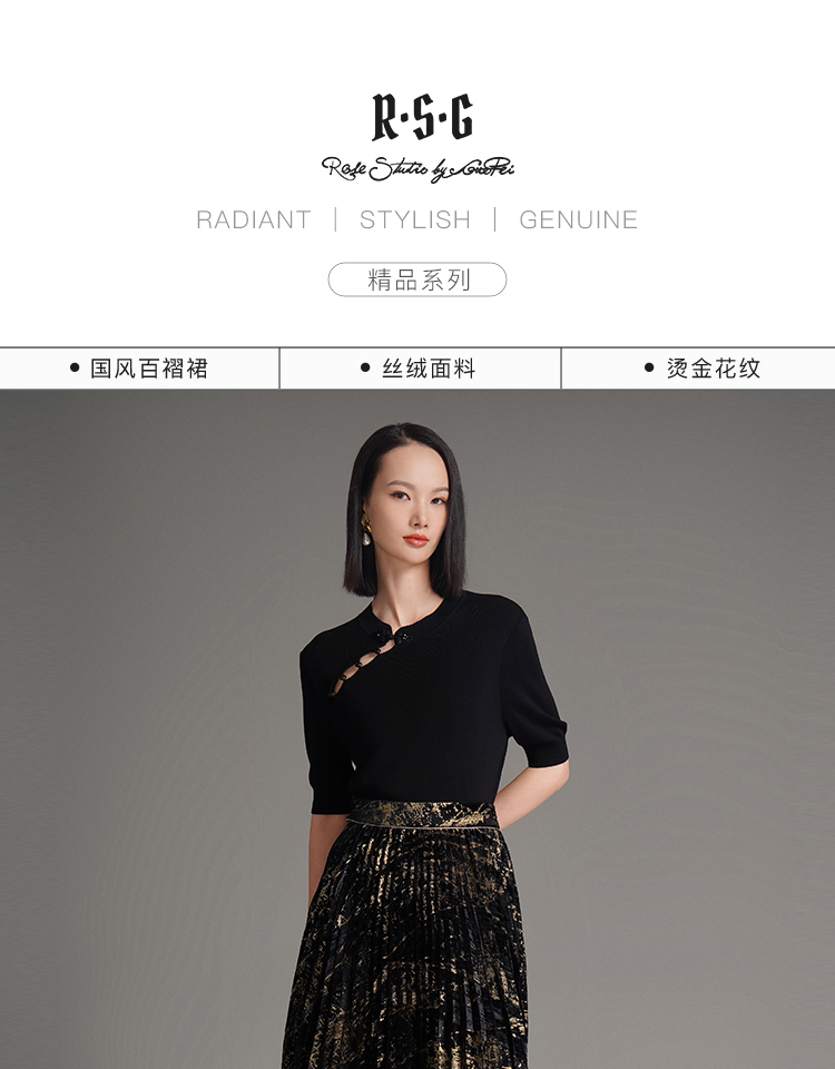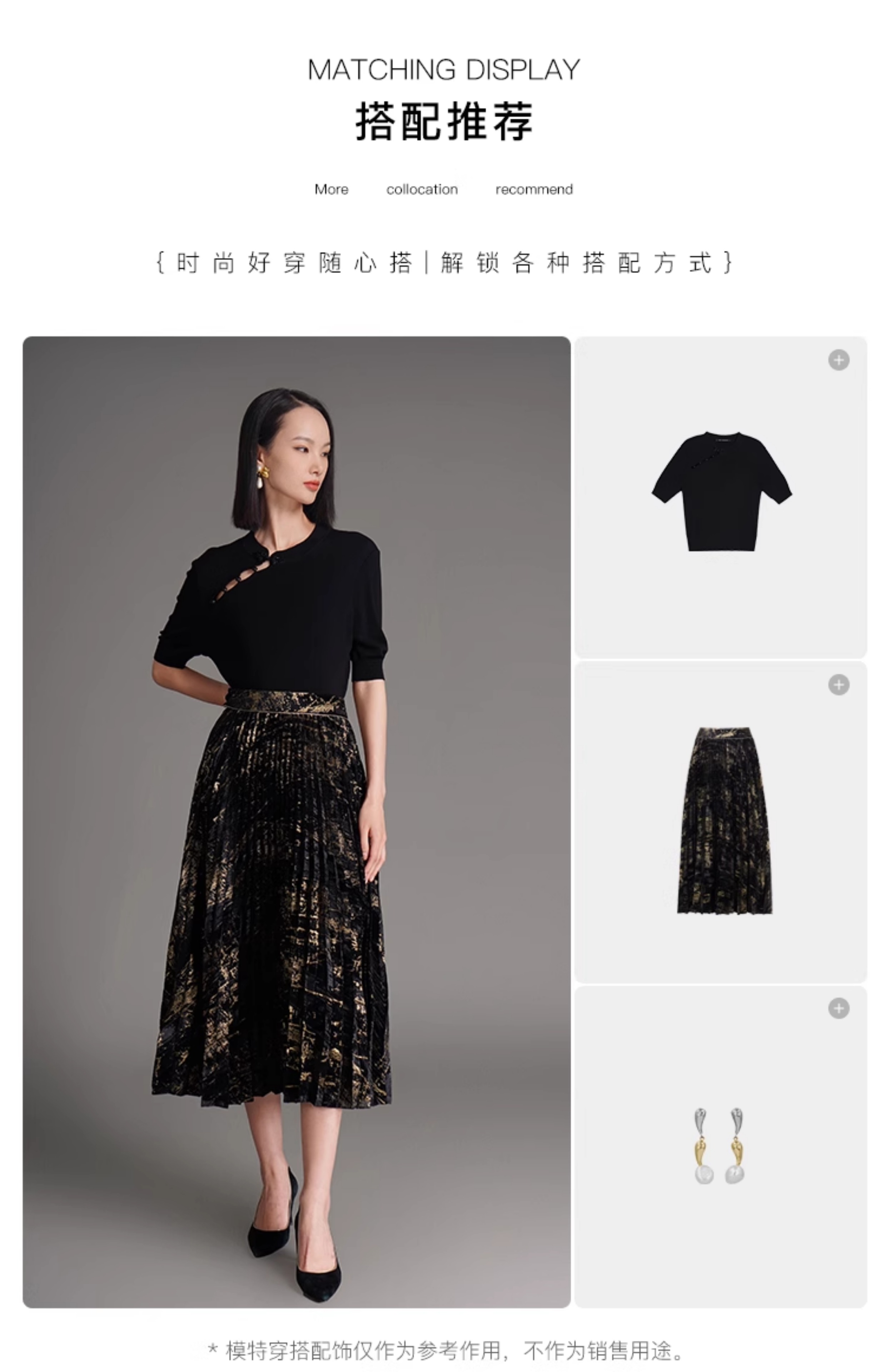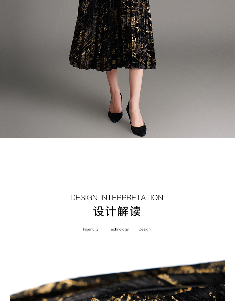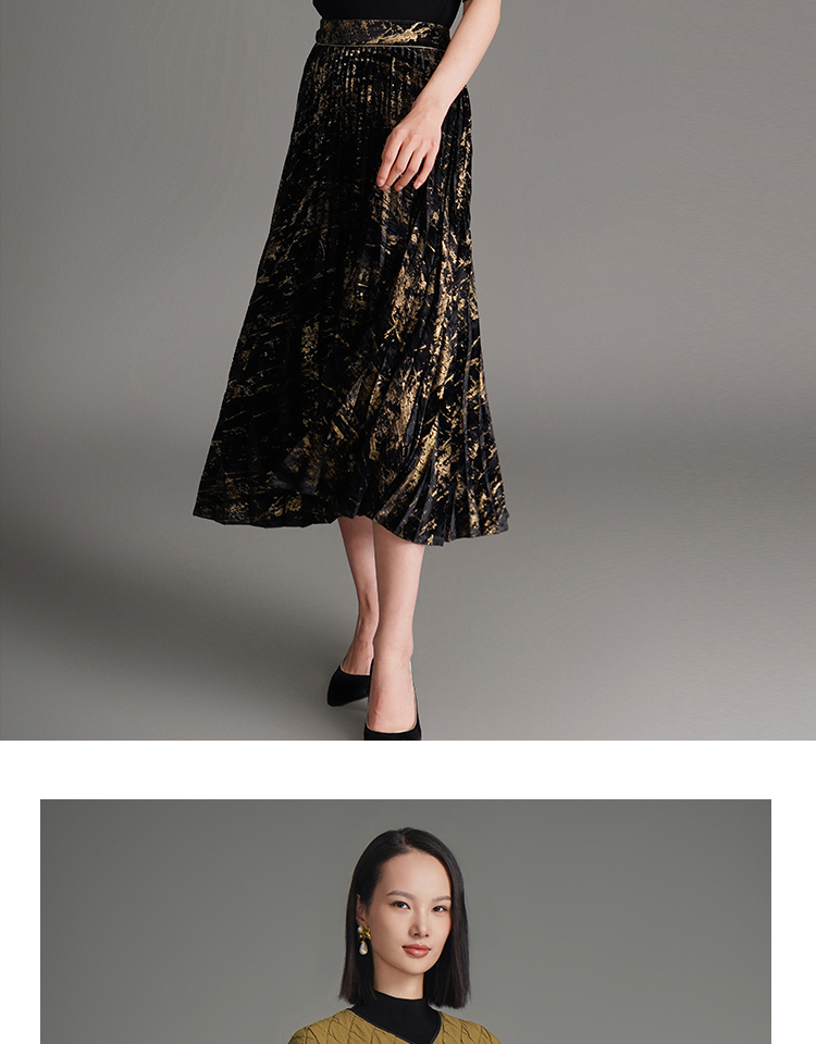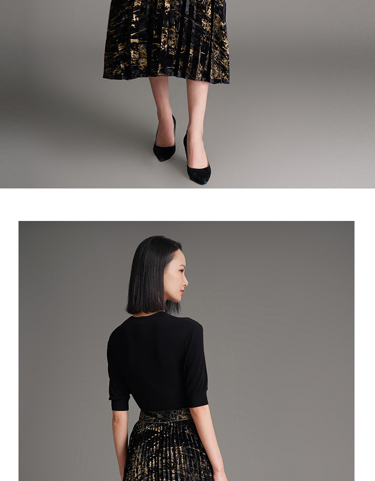 郭培成衣品牌烫金黑色丝绒国风百褶裙