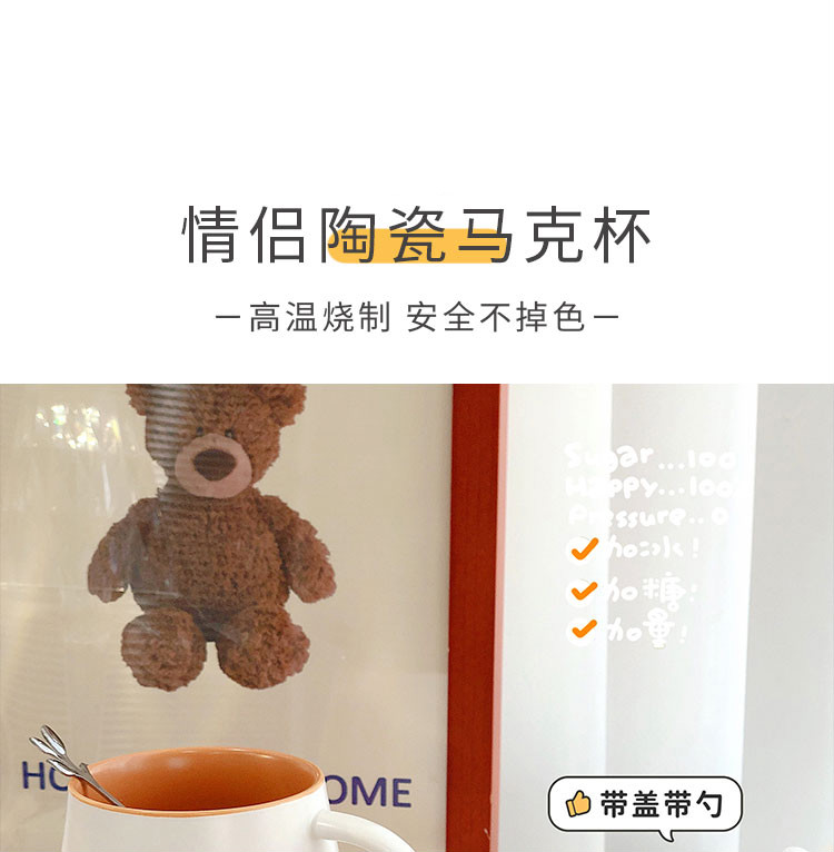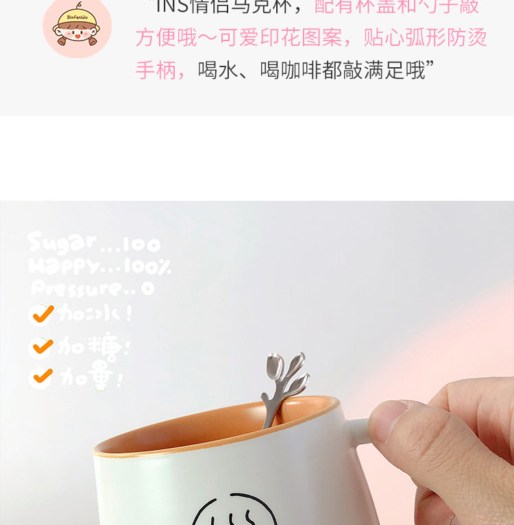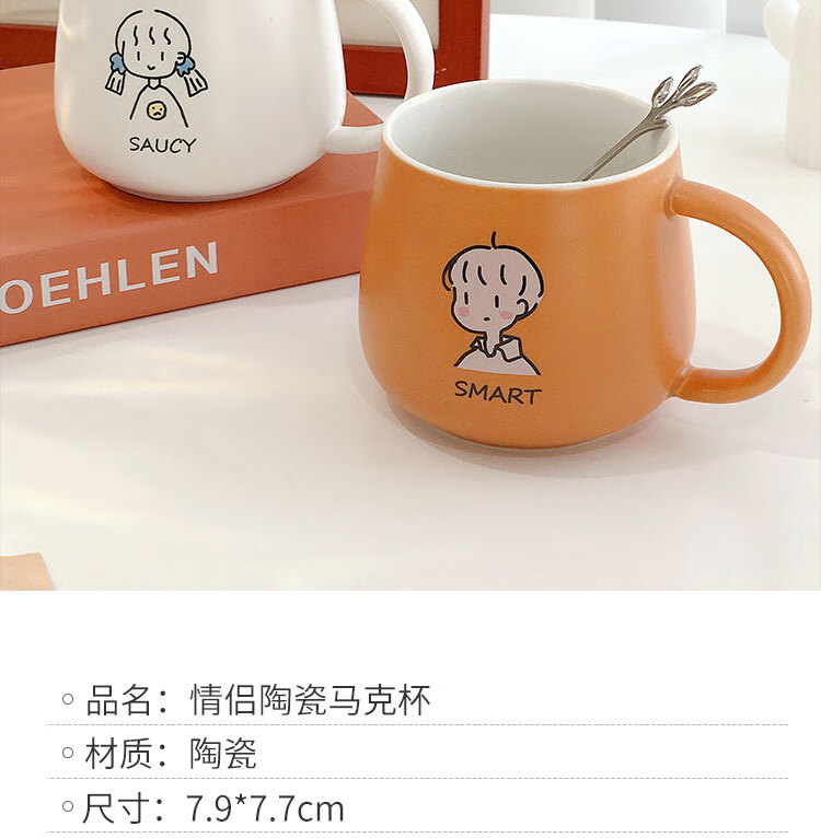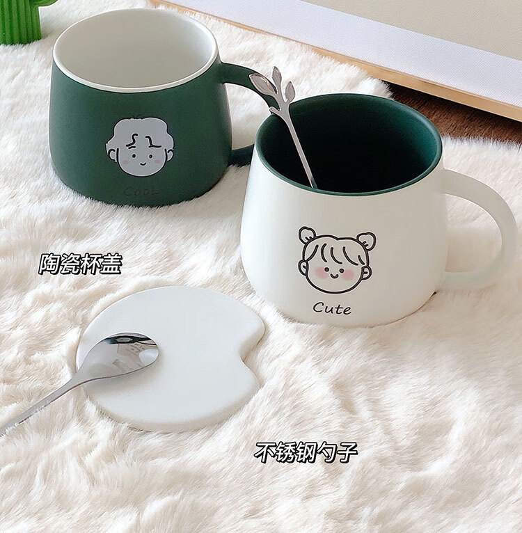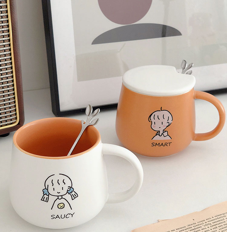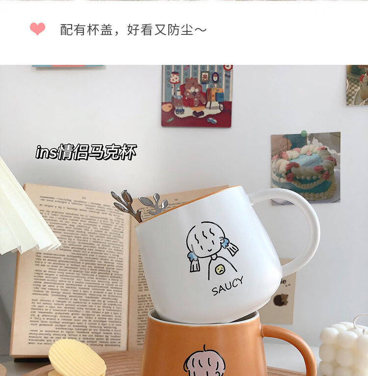 情侣杯子一对杯女生带盖勺水杯陶瓷高颜值可爱咖啡杯家用早餐 白savcy+黄smart(勺子)