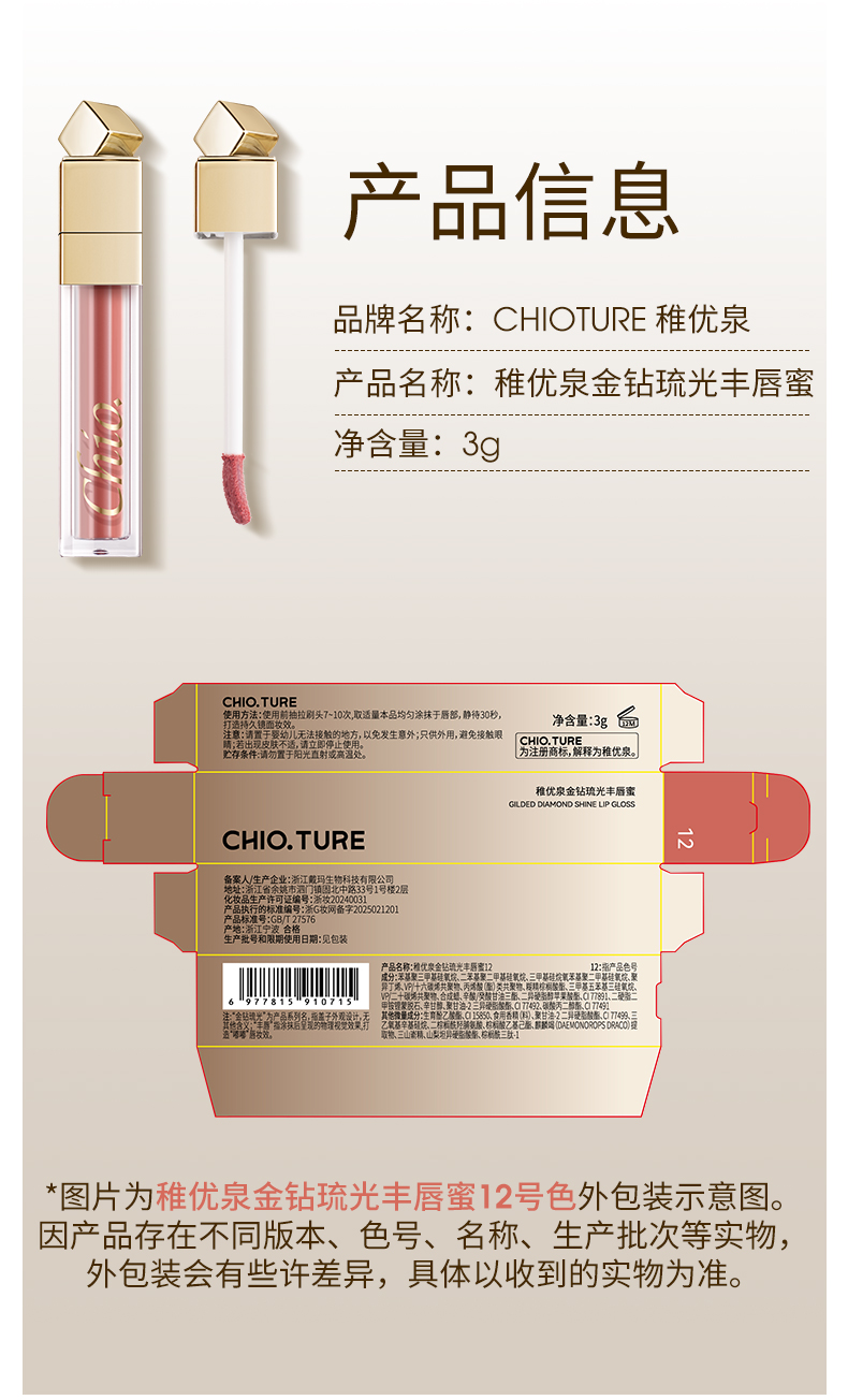 稚优泉(CHIOTURE)金钻琉光丰唇蜜唇釉水光镜面唇蜜不易沾精华口红裸色系