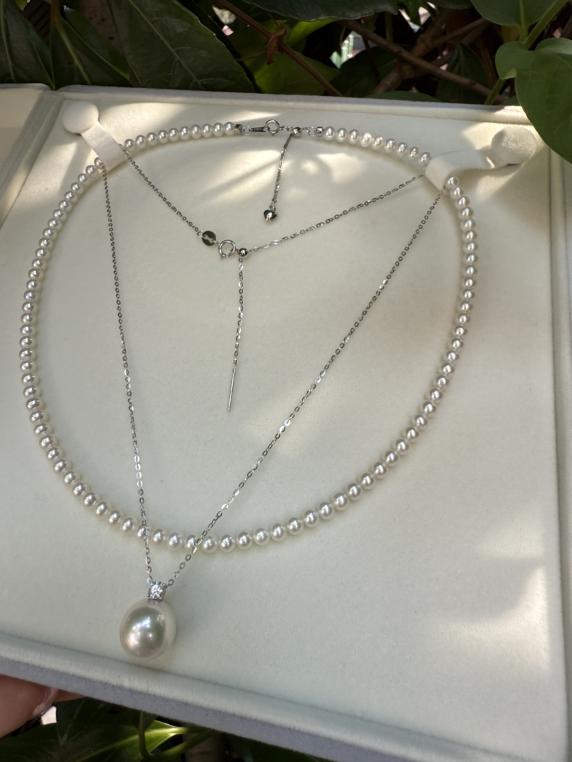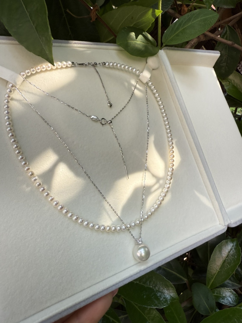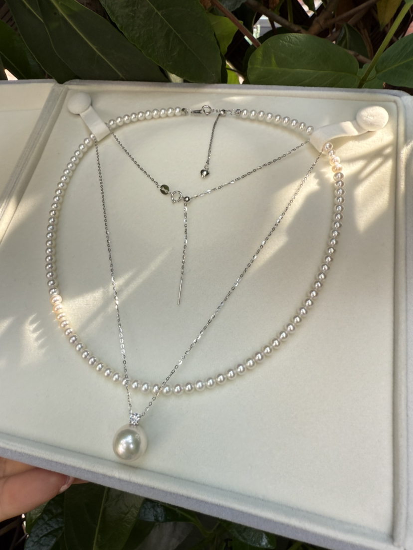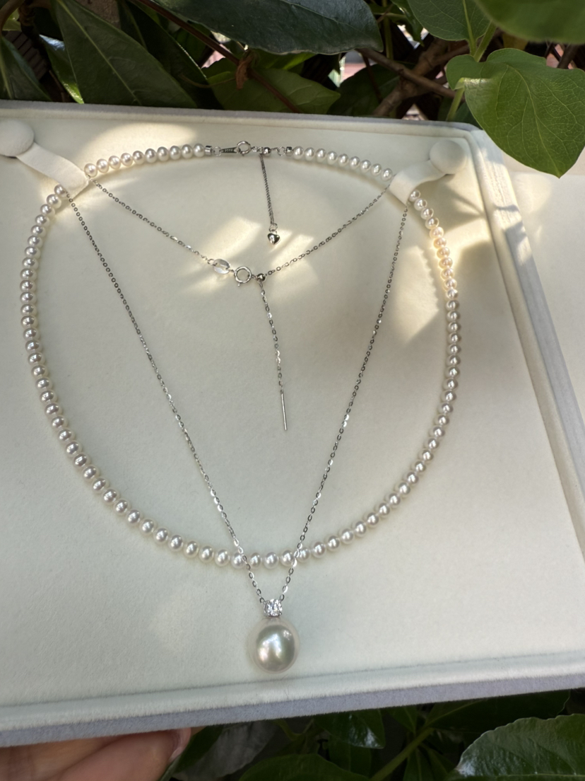 咱们这组配的是4-4.5mm极光近正圆的baby珠项链。吊坠项链用的是11-12正圆极光微微瑕的爱迪生王妃吊坠。配件均为925纯银。