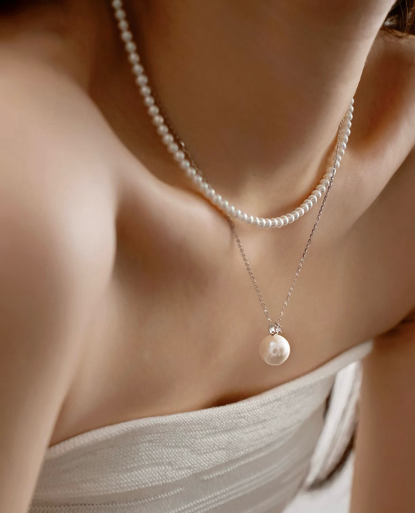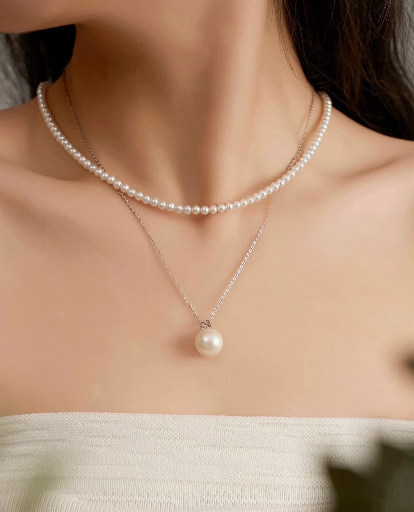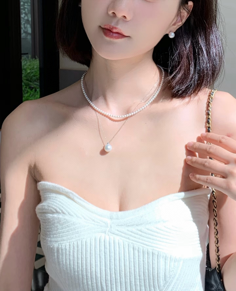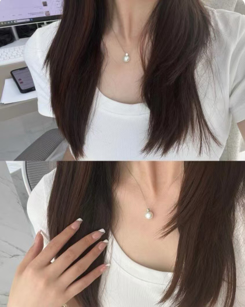 咱们这组配的是4-4.5mm极光近正圆的baby珠项链。吊坠项链用的是11-12正圆极光微微瑕的爱迪生王妃吊坠。配件均为925纯银。