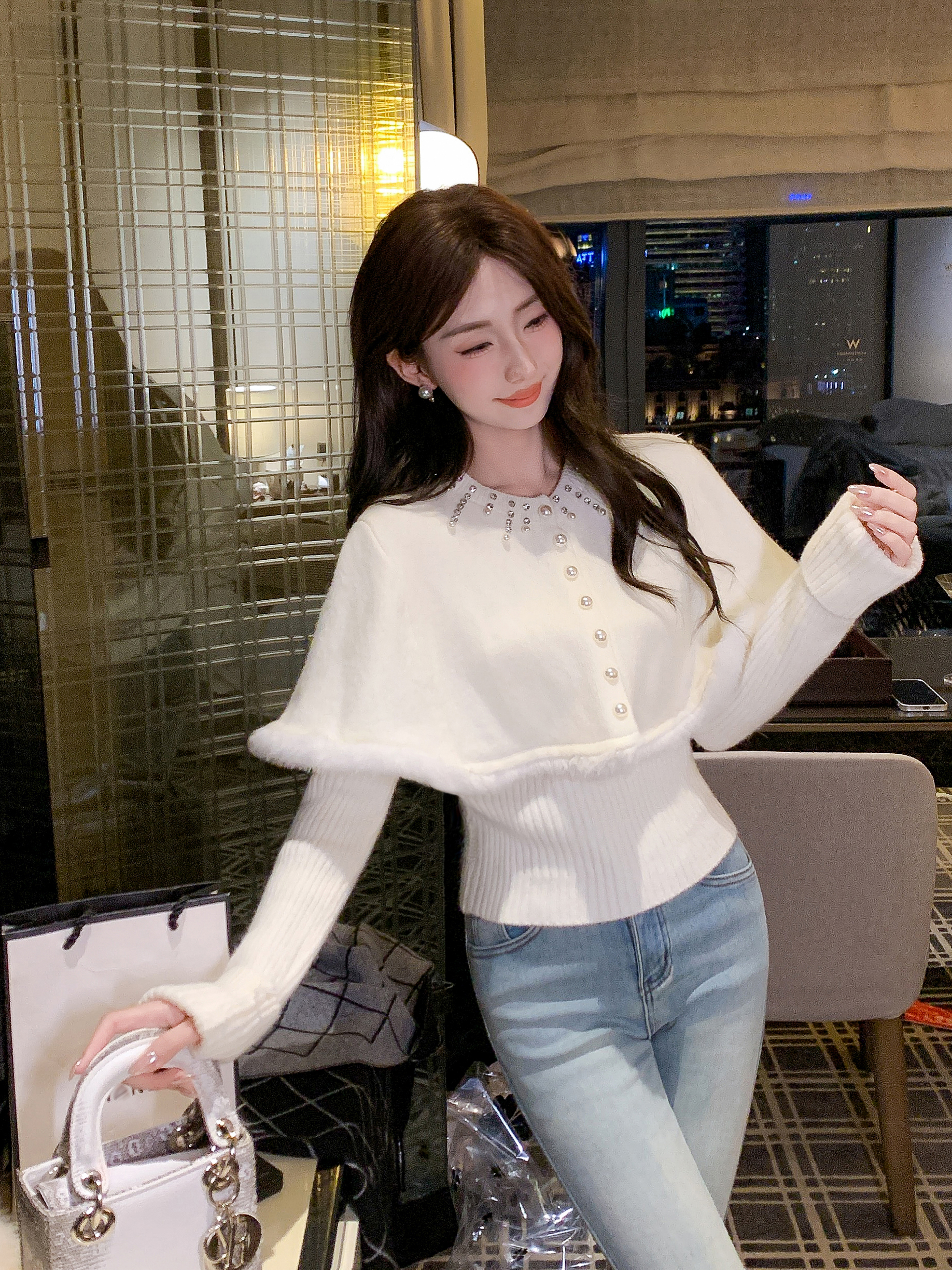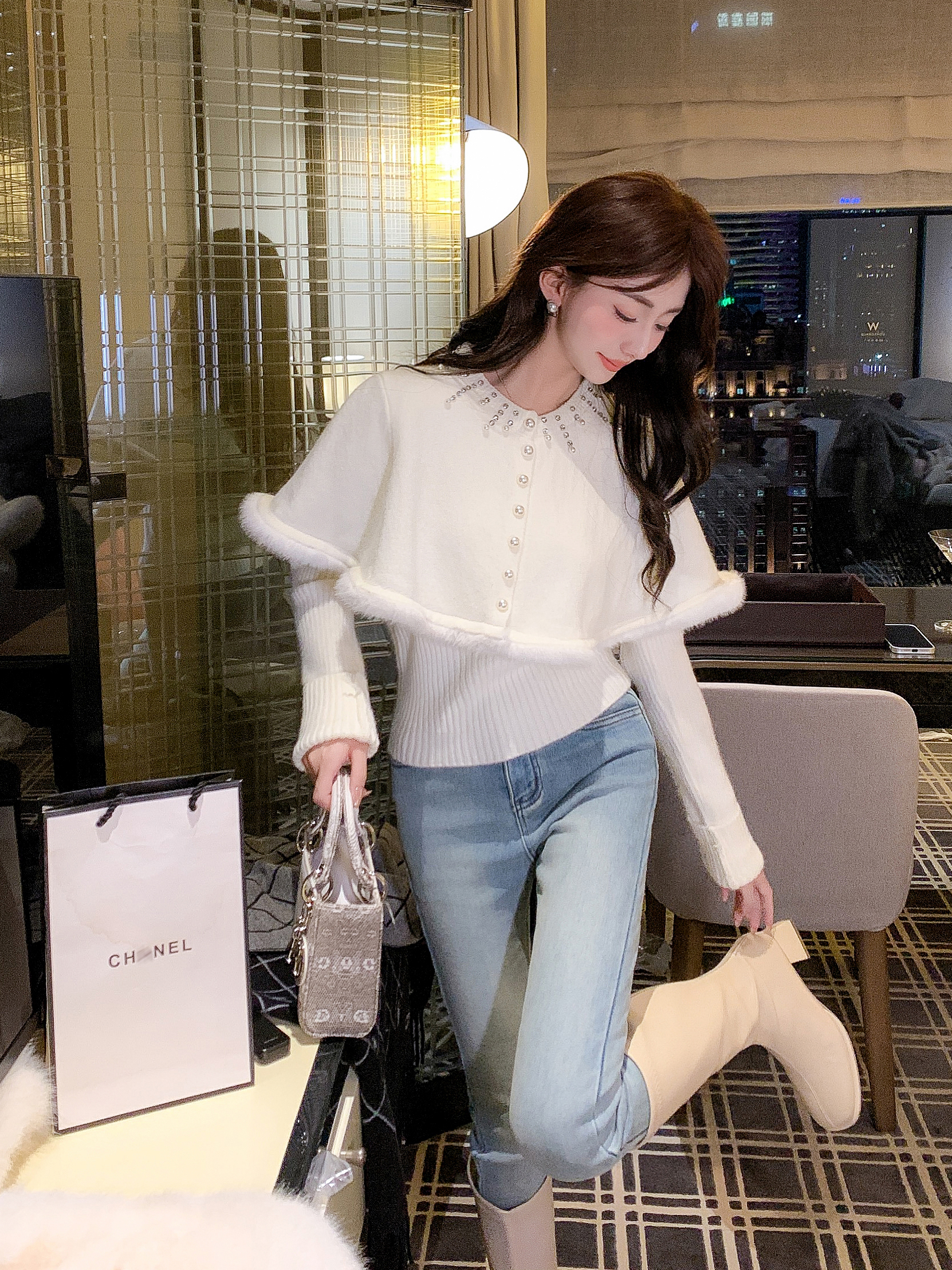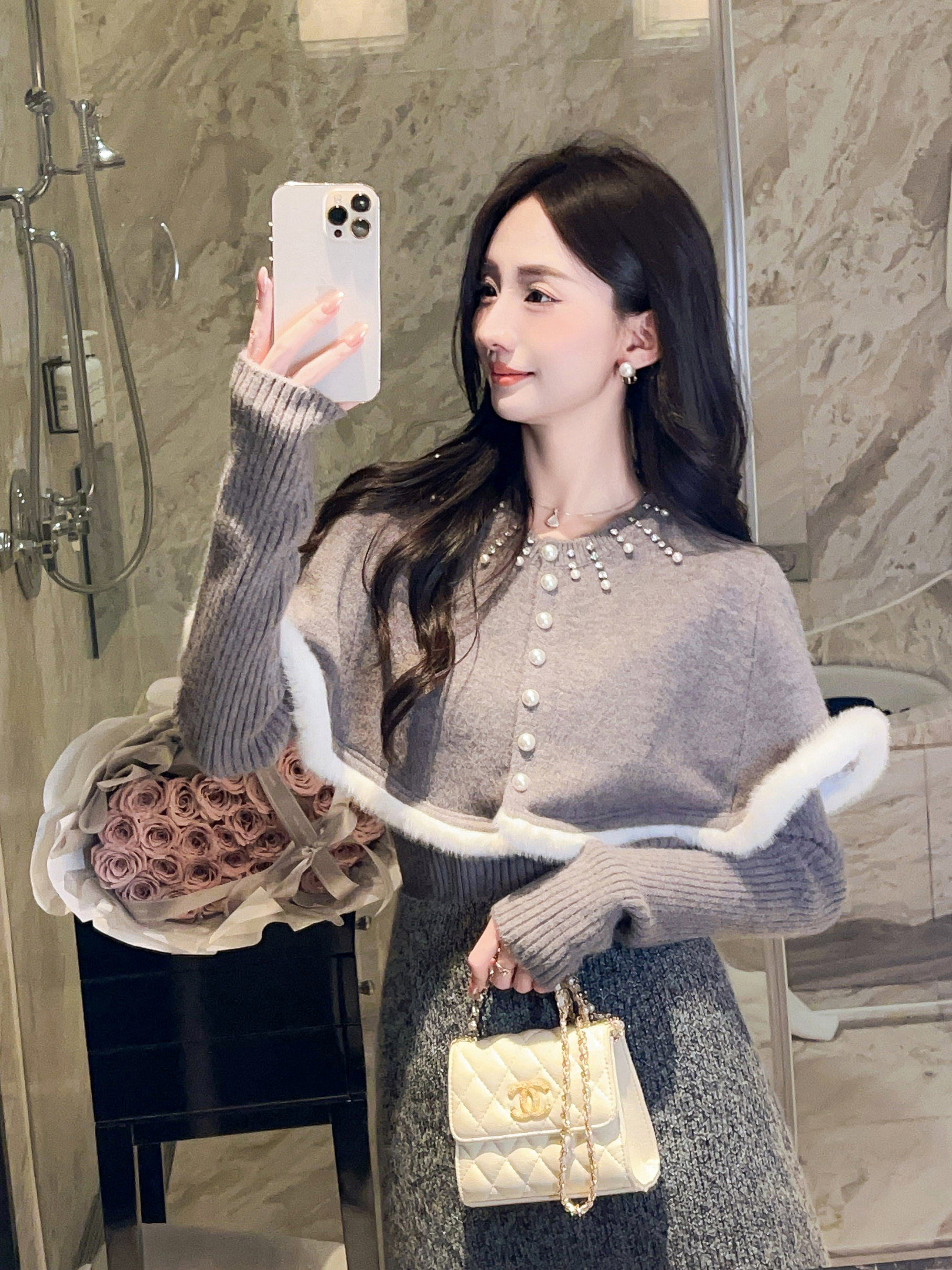 张心子【富士山下】秋冬珍珠镶钻斗篷针织衫两件套套装 U2511069