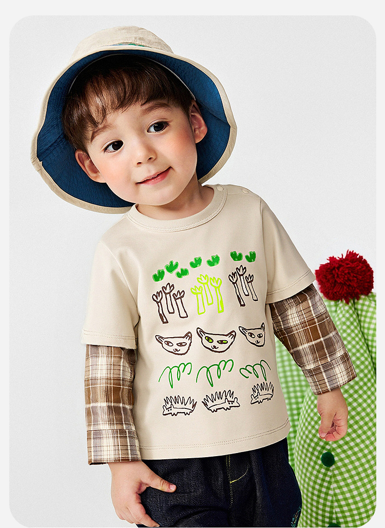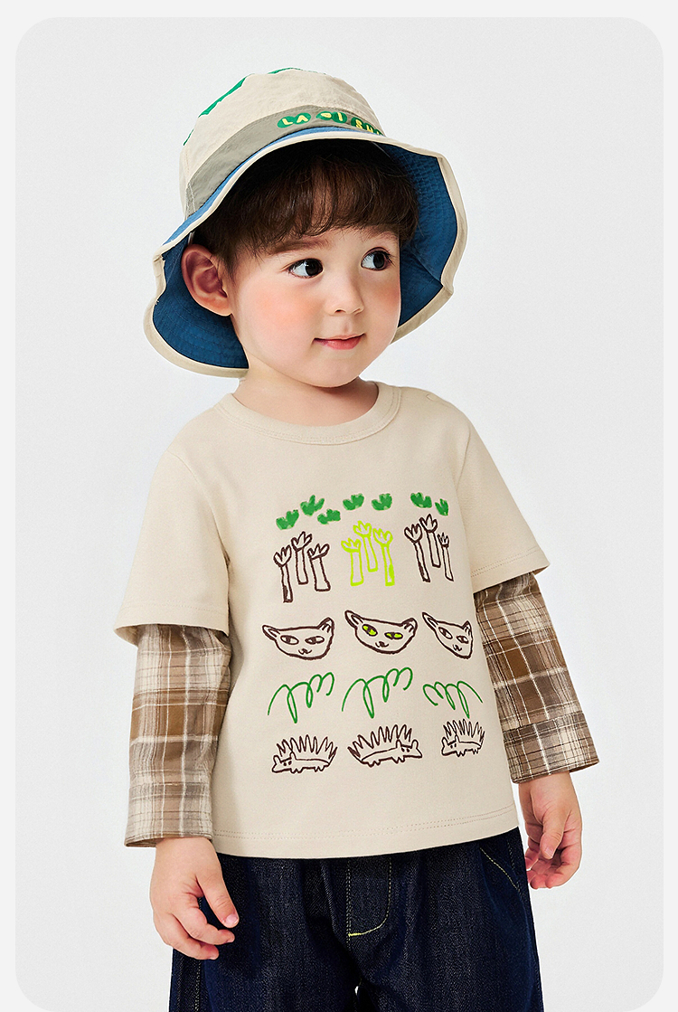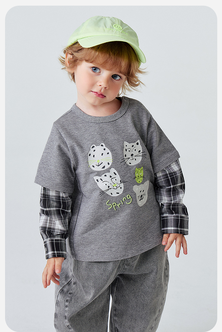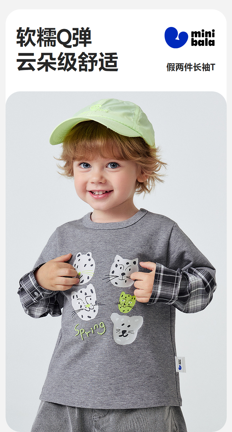 迷你巴拉男童宝宝假两件长袖T恤2026春新款软糯百搭舒适弹力上衣