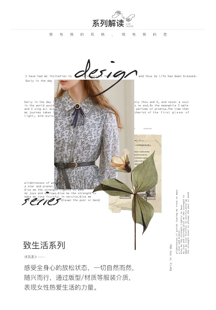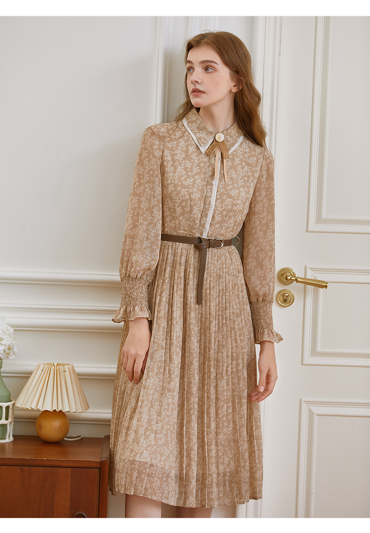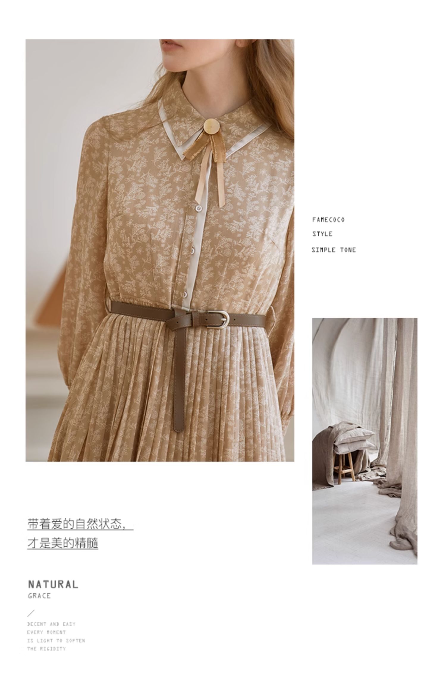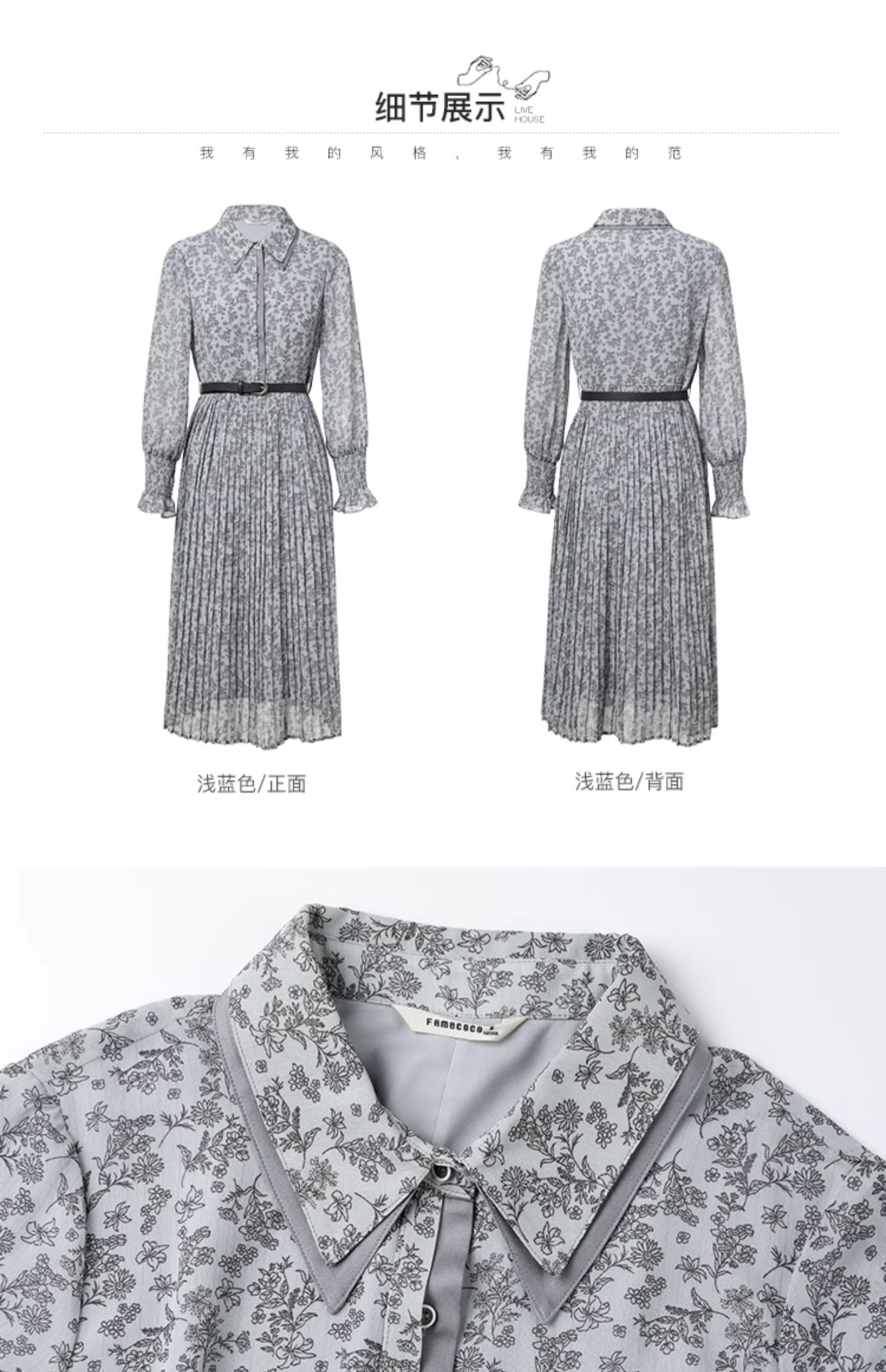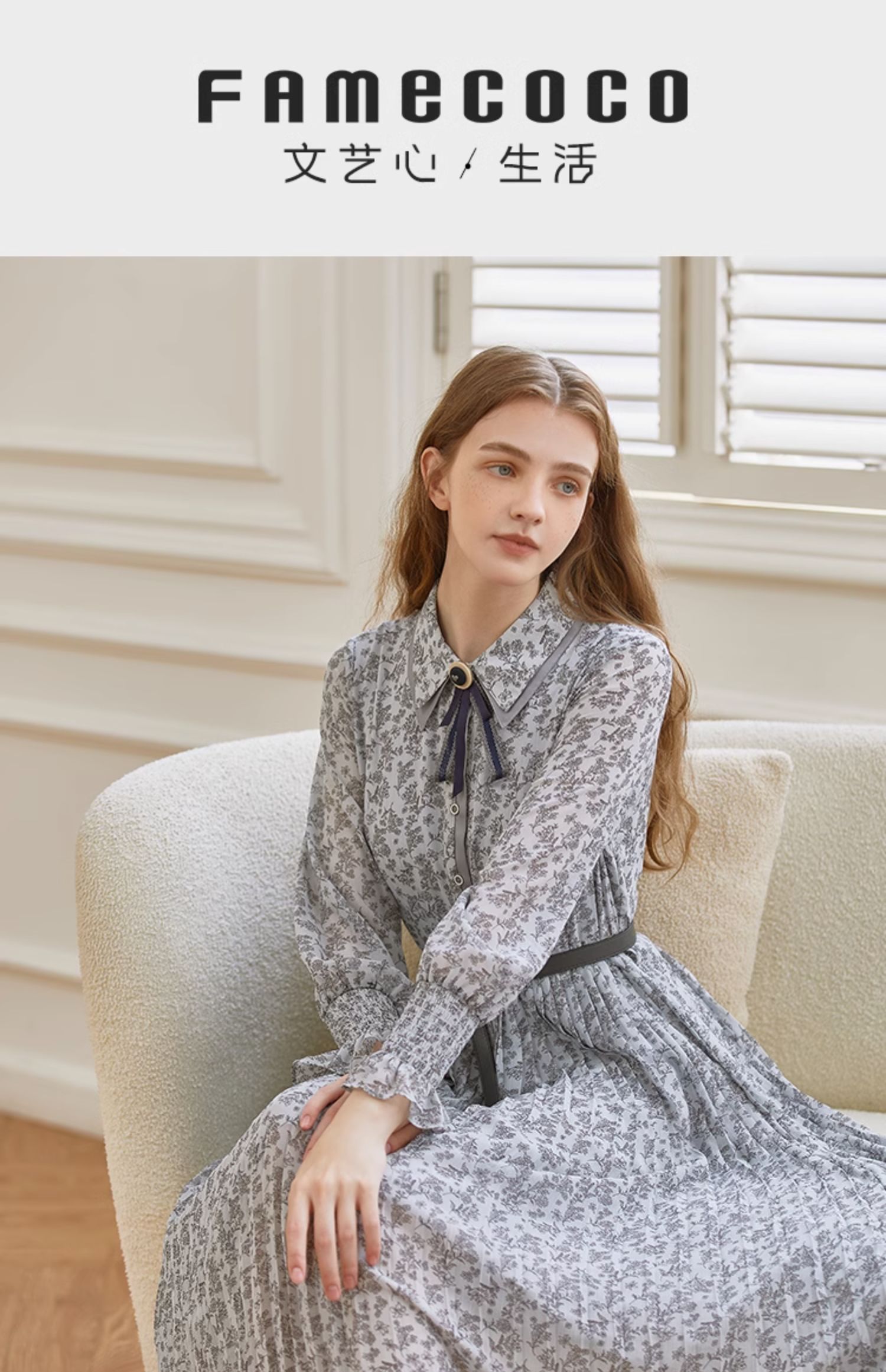 famecoco雪纺碎花连衣裙女士秋季长袖收腰衬衫裙长款F225FA011