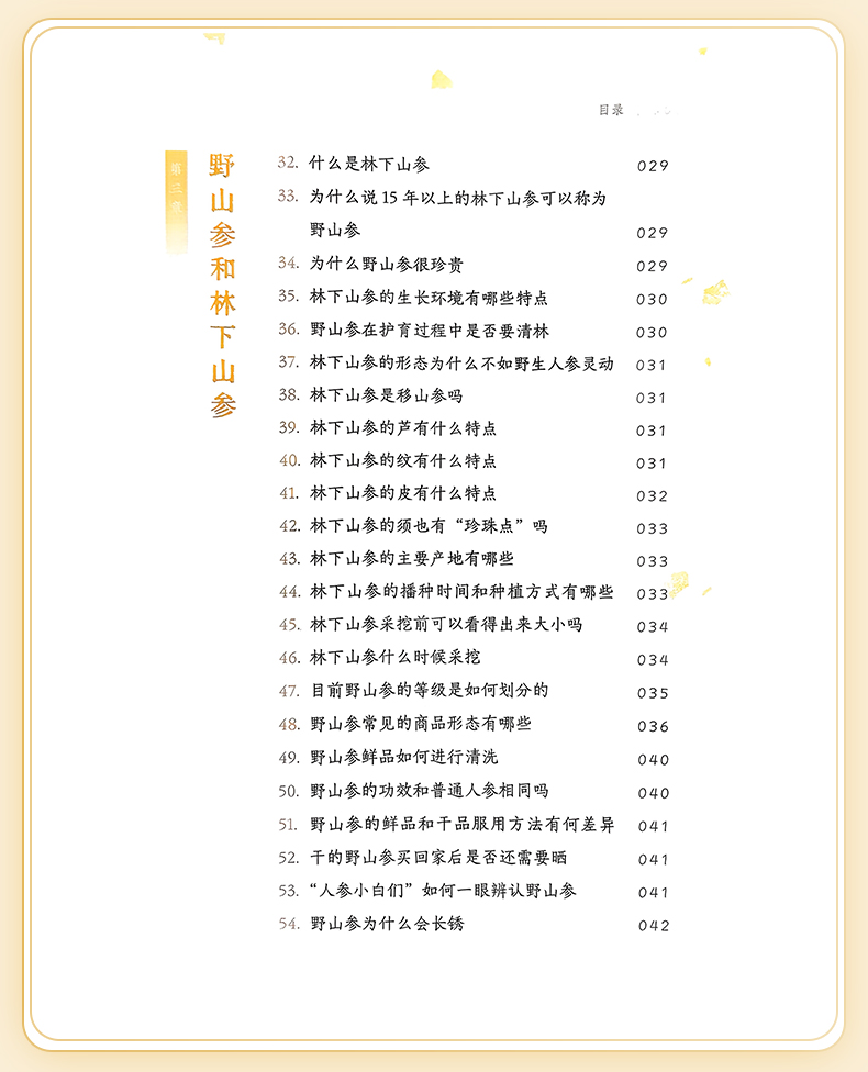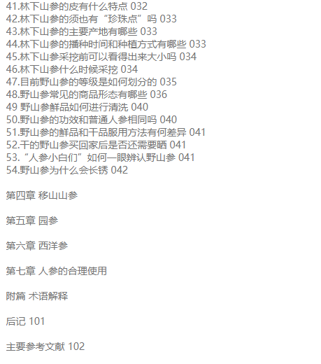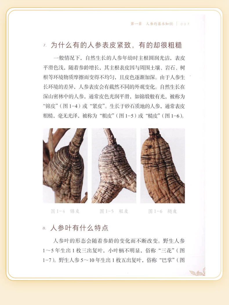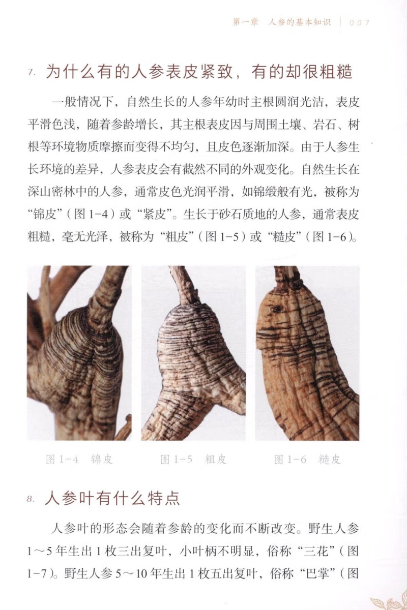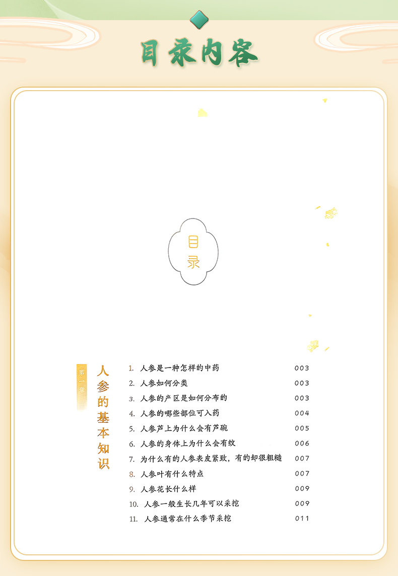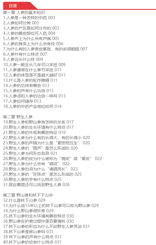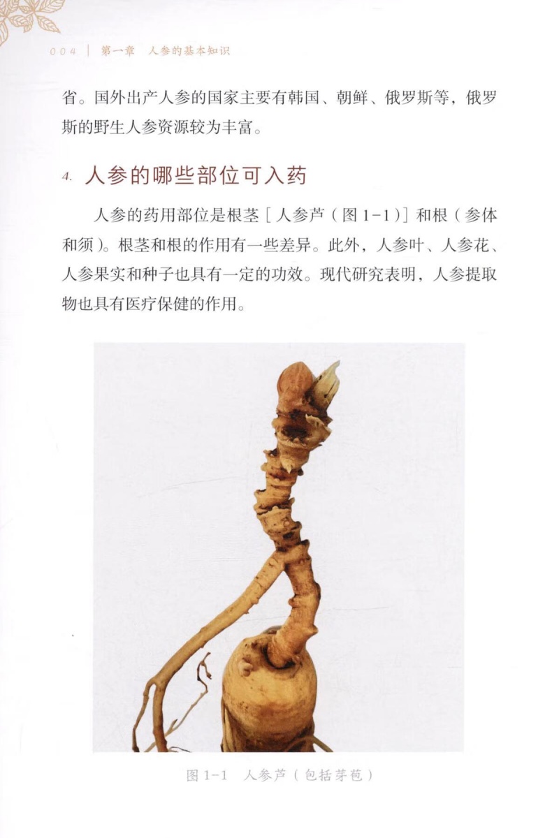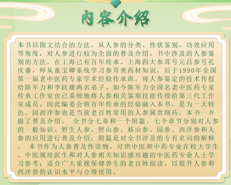 本书以图文结合的方法,从人参的分类、性状鉴别、功效应用等角度,对人参进行较为全面的普及介绍。书中涉及的人参鉴别的方法,在上海已有百年传承。上海四大参茸号元昌参号孔庆蕃,师从童宝卿系统学习参茸类药材知识,后于1990年全国第一届老中医药专家学术经验传承班,将人参鉴定的技术传授给陈军力和李跃雄两名弟子。如今陈军力全国名老中医药专家传承工作室也已系统地将人参相关鉴别技能传授给第三代工作室成员。因此编委会将百年传承的经验融入本书,是为一大特色。因西洋参也是当前老百姓常用的人参属贵细药,本书一并做了普及介绍。 全书分七章和一个附篇,七个章节分别对人参的一般知识、野生人参、野山参、移山参、园参、西洋参和人参的应用进行普及介绍;附篇是对全书涉及的专有名词的解释。 本书作为人参普及性读物,可供中医和中药专业在校大学生、中医规培医生和对人参相关知识感兴趣的中医药专业人士学习参考;适合广大重视保健养生的老百姓阅读,以提升人参和西洋参的认识水平与合理使用。