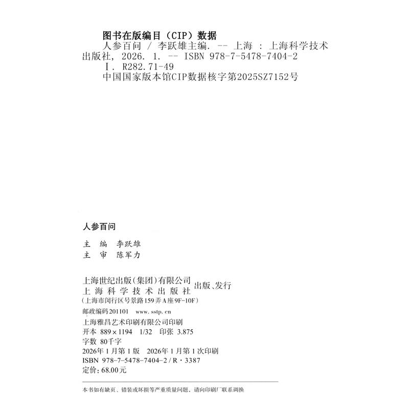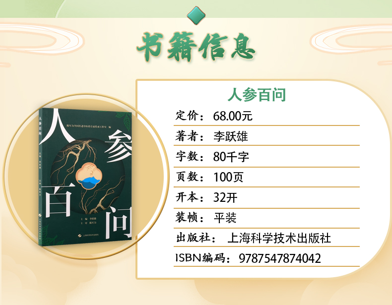 人参百问 李跃雄 主编 中医和中药院校师生,对人参相关知识感兴趣的人士 中药学 9787547874042 上海科学技术出版社