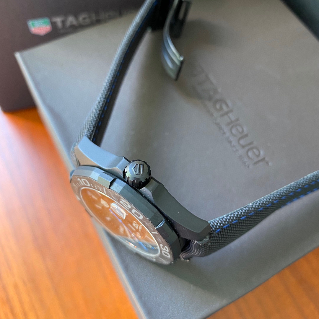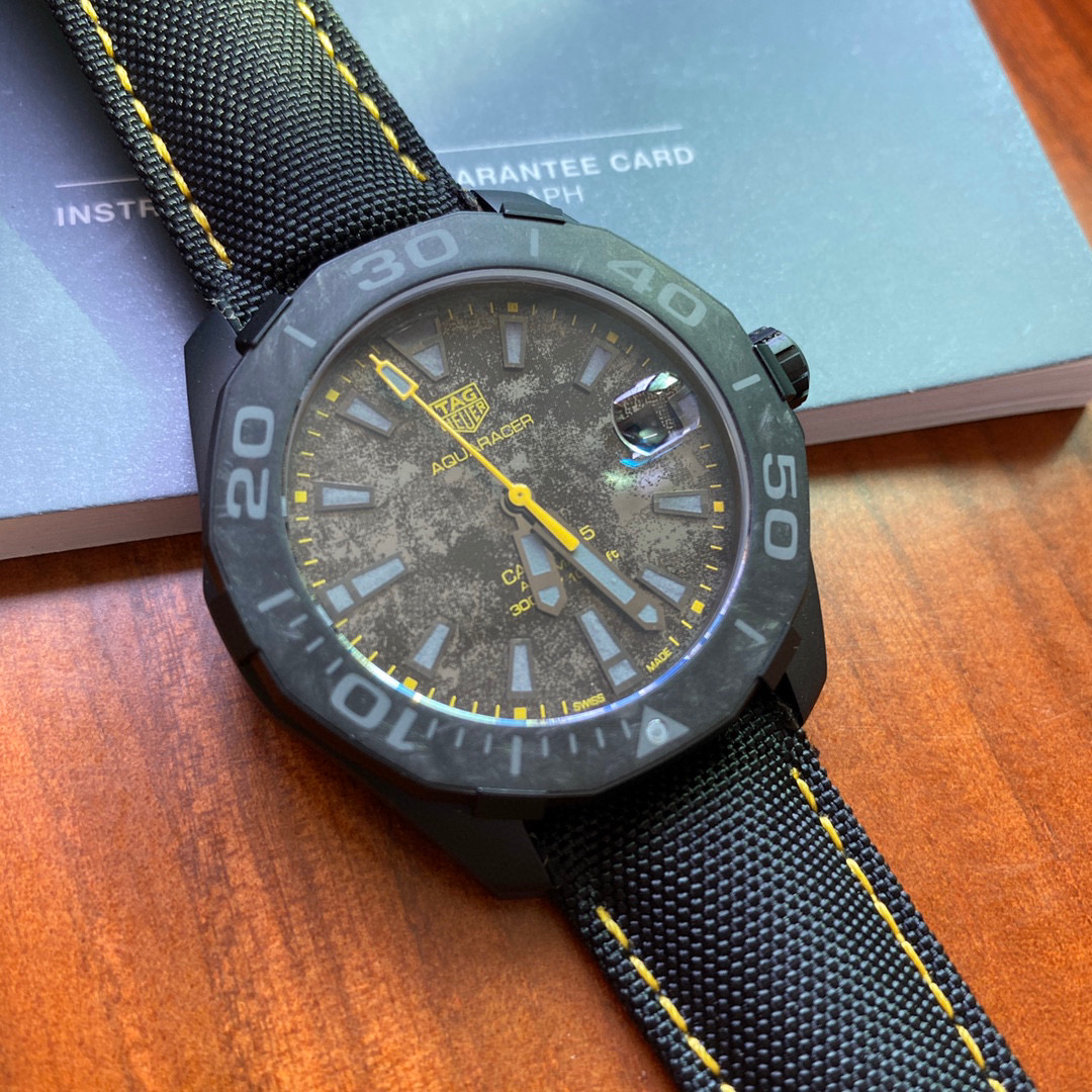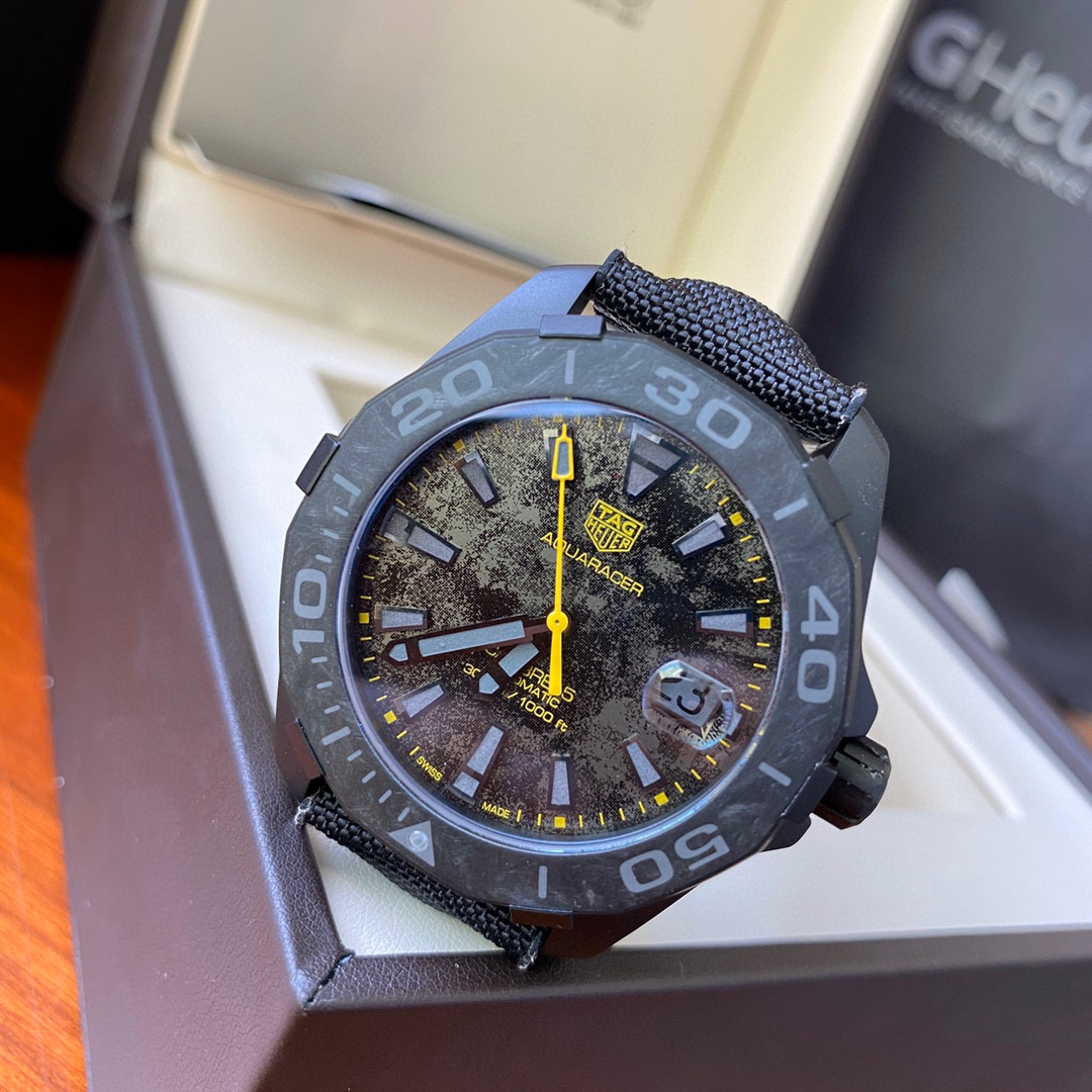 原单品质 原装机 泰格豪雅新硬货来袭,表盘直径41mm,TAG竞潜系列CALIBRE,黑色PVD钛金属,表面碳纤维航空专供材质,搭载瑞士原装进口SW200全自动机械机芯,超深度防水300米,如此高深度防水,不论是在高速的游艇上,还是绝佳性能的赛车里,碳纤维是一种性能卓越的材质,卓越的机械性能,出众的耐化学性,强大的抗冲击能力,碳纤维集所有这些性质于一身,这种前卫的材质轻盈,耐用,使腕表呈现别具一格的风范和高舒适度。全套专柜包装。