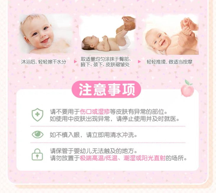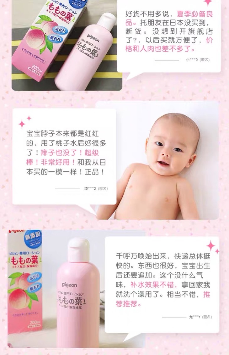 3、功效:贝亲桃子水,液体爽身粉,无添加无着色特别适合婴儿娇嫩的肌肤,孕妇可以用哦,这是一款桃子叶做的乳液,针对宝宝热痱,尿布疹,湿疹有快速修复作用,还可以让日晒的肌肤得到镇静,消炎的作用!
