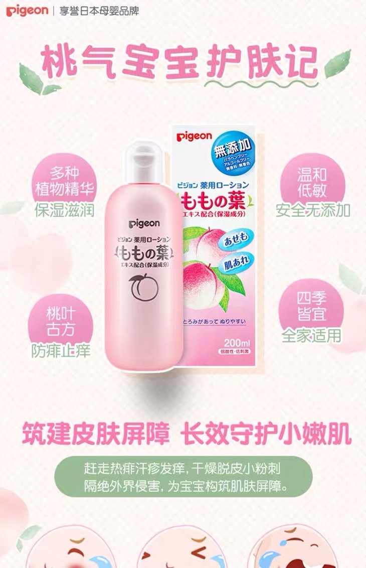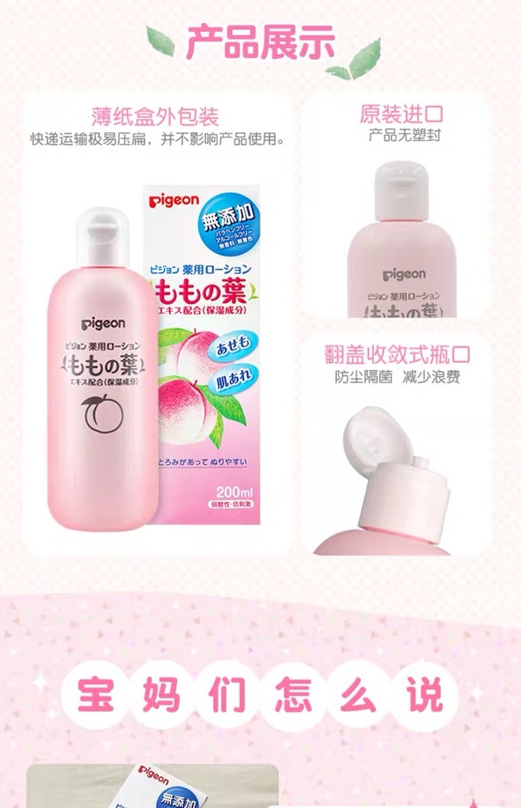 1、产品名称:Pigeon/贝亲婴儿爽身露桃叶精华