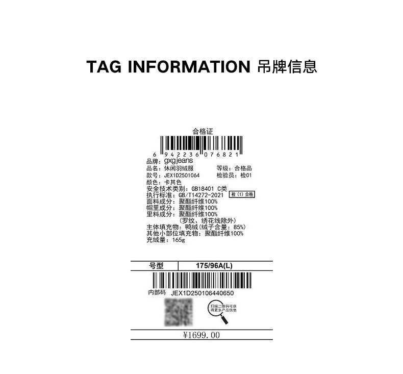 gxg.jeans男装冬季羽绒服 卡其色休闲羽绒服JEX1D2501064