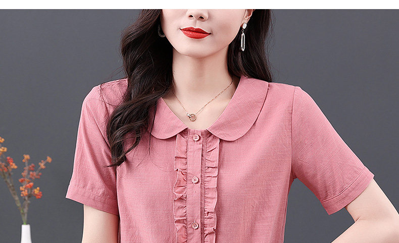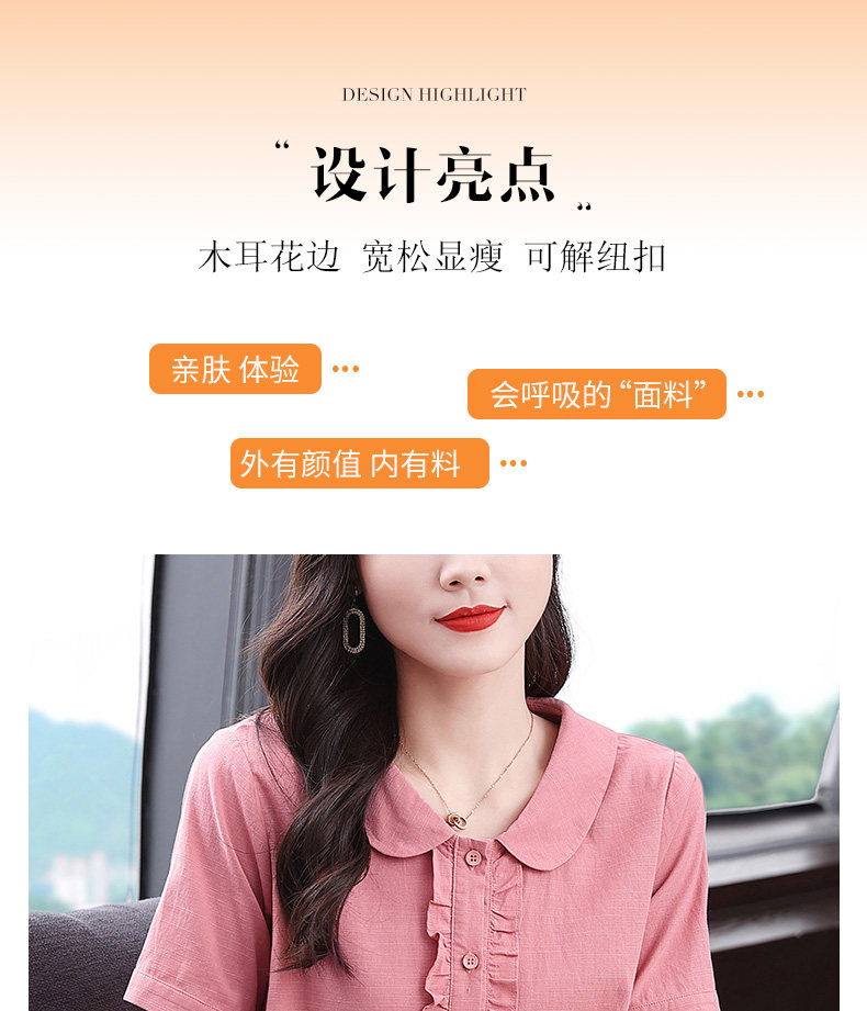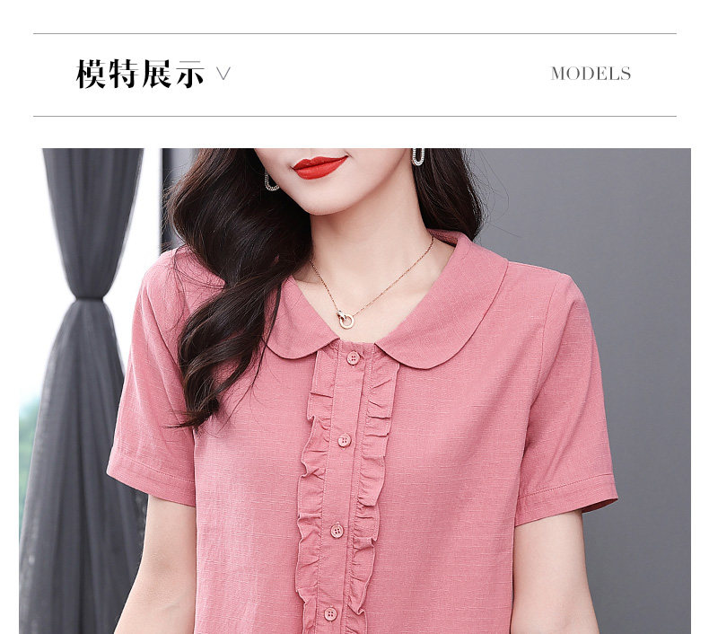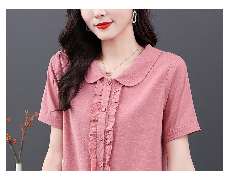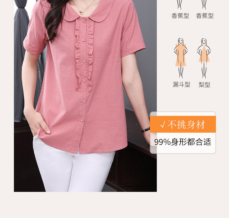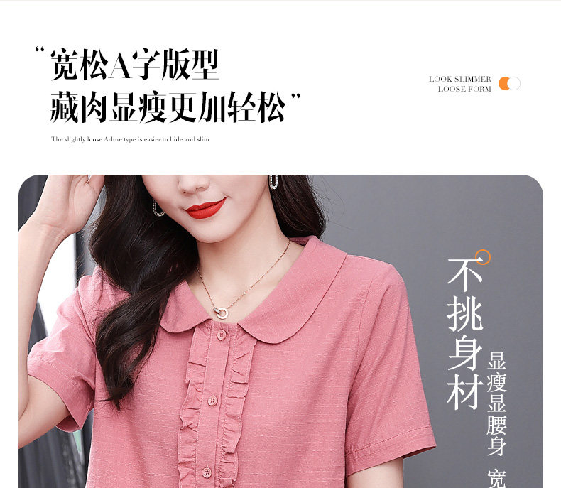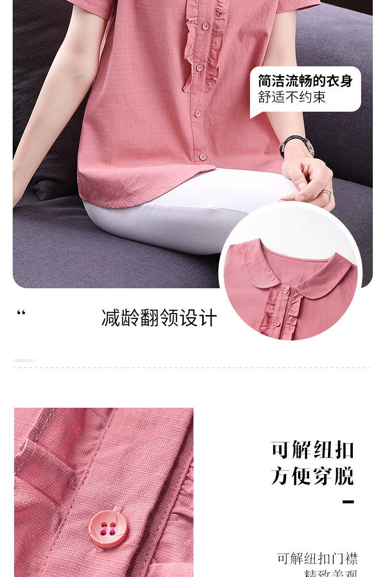 女士短袖衬衫棉麻大码遮肚子2026新款休闲衬衣夏季宽松娃娃领上衣