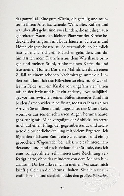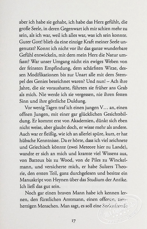 歌德的书信体小说《少年维特之烦恼》让这位诗人突然声名大噪,除了热情的风暴之外,还引发了极大的愤慨:因为这里的中心是一个带有主观世界观的自我和一段不可能的爱情的痛苦。一个无法毫无怨言地忍受社会压力并选择自杀而不是接受这些压力的自我。当时对宗教规范的巨大侮辱在今天仍然令人不安和感人——因为在《少年维特之烦恼》中,我们看到了一个我们可以理解和同情他的痛苦的现代人。此版本包含 1787 年小说的第二版。