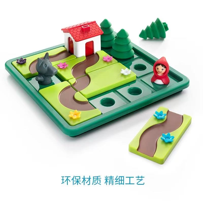 配件情况:小红帽*1,大灰狼*1,红色小屋*1,松树*3,游戏底盘*1,绘本*1,游戏手册*1,道路拼板*5。