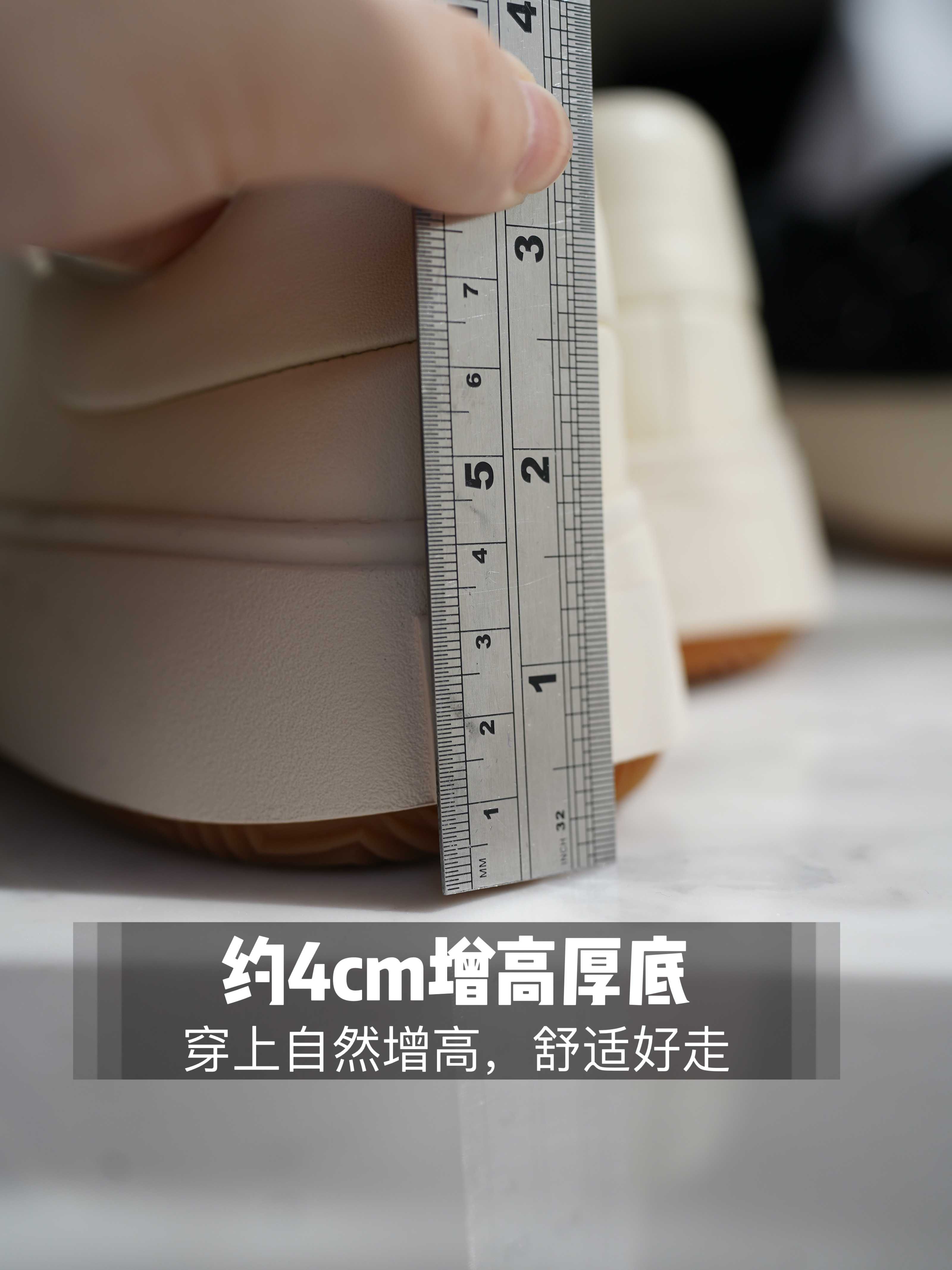 4公分的厚底,不显累赘的同时,自然增高,拉长双腿,并且鞋子虽然看着比较大只,但是上脚真的是很轻巧,走路穿它真的很舒服呀😄