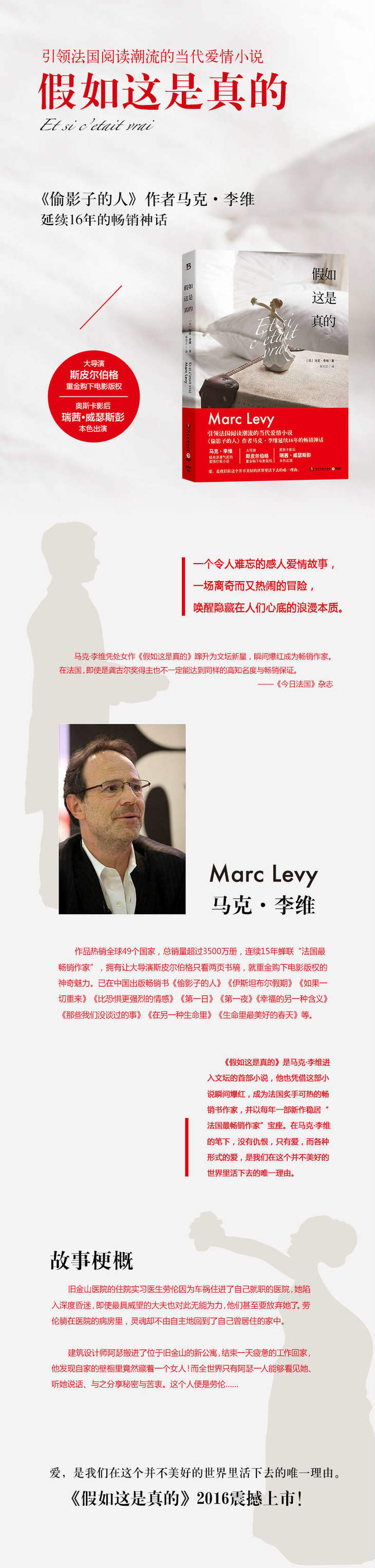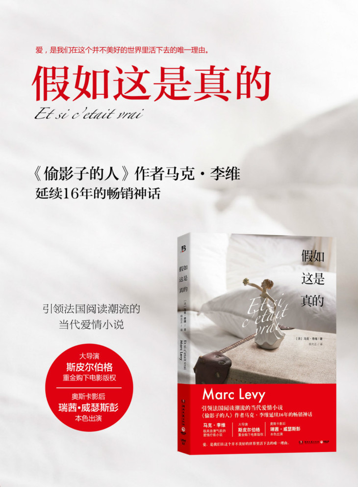 《假如这是真的》是马克-李维进入文坛的首部小说,他也凭借这部小说瞬间爆红,成为法国炙手可热的畅销书作家,并以每年一部新作稳居“法国最畅销作家”宝座。《假如这是真的》是一个令人难以忘怀的感人爱情故事,马克?李维通过自己的想象力让读者与世间最浪漫、最纯粹的爱情相遇,也唤醒人们隐藏在心底的浪漫本质。在马克?李维的笔下,没有仇恨,只有爱,而各种形式的爱,是我们在这个并不美好的世界里活下去的最大理由。