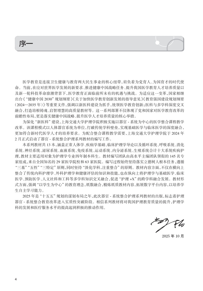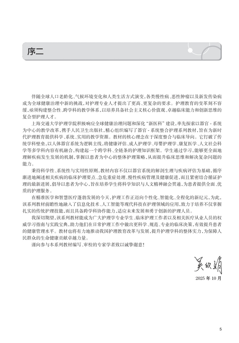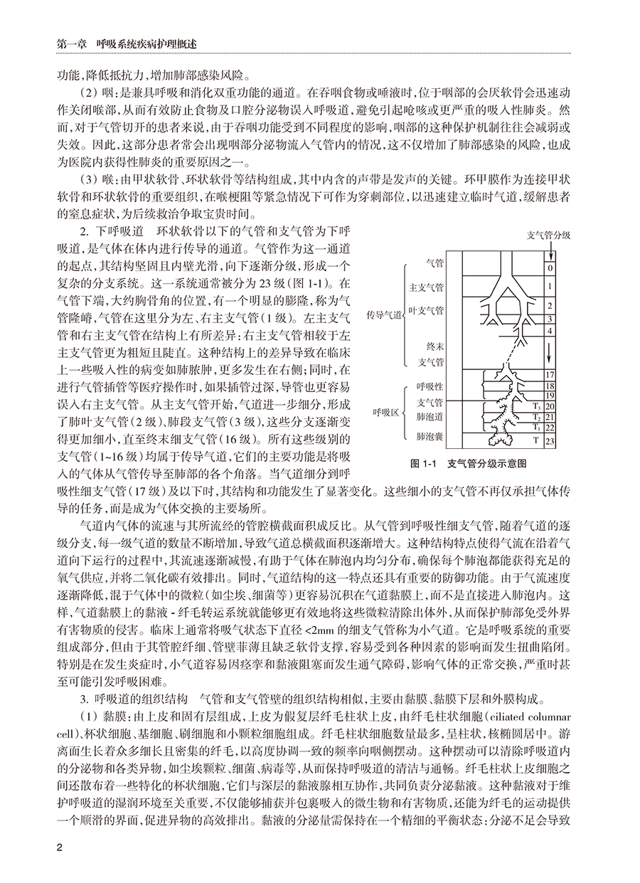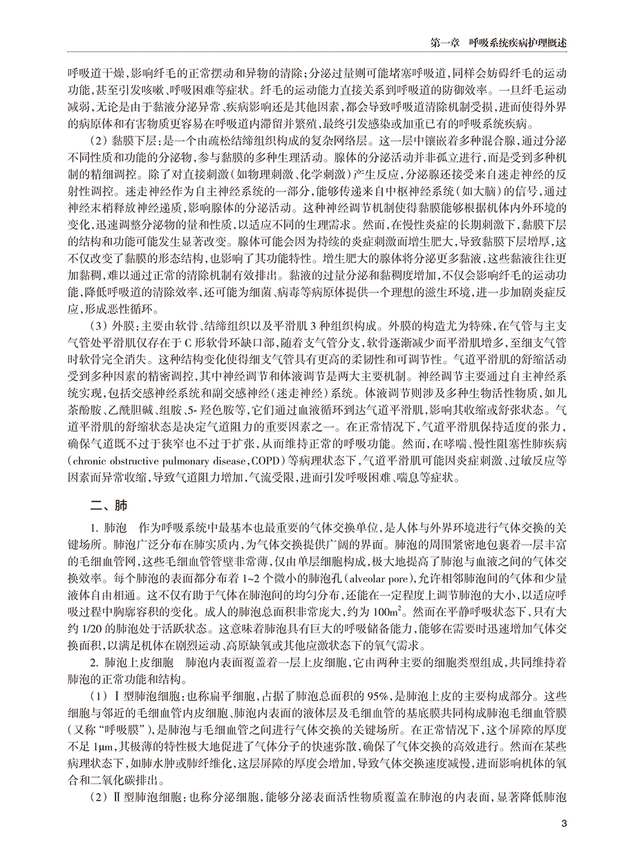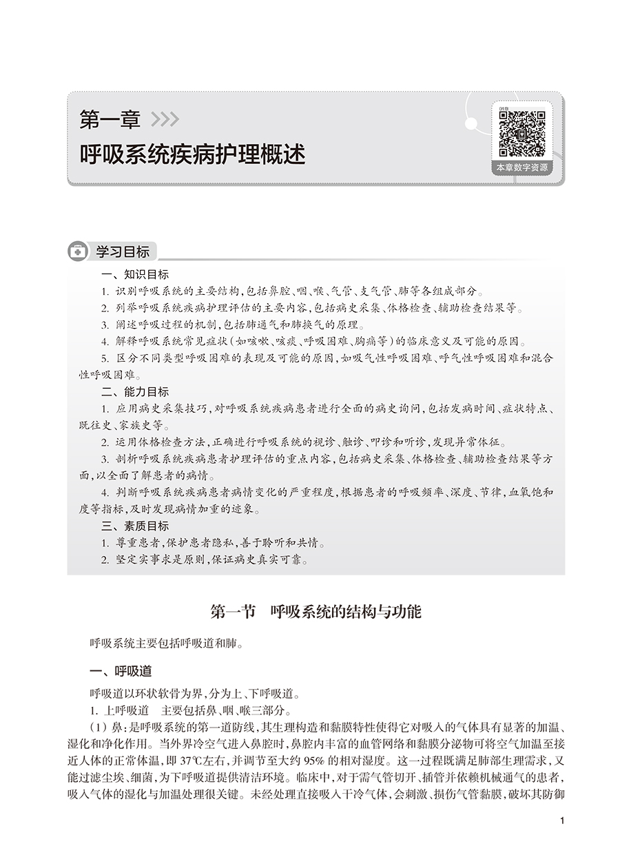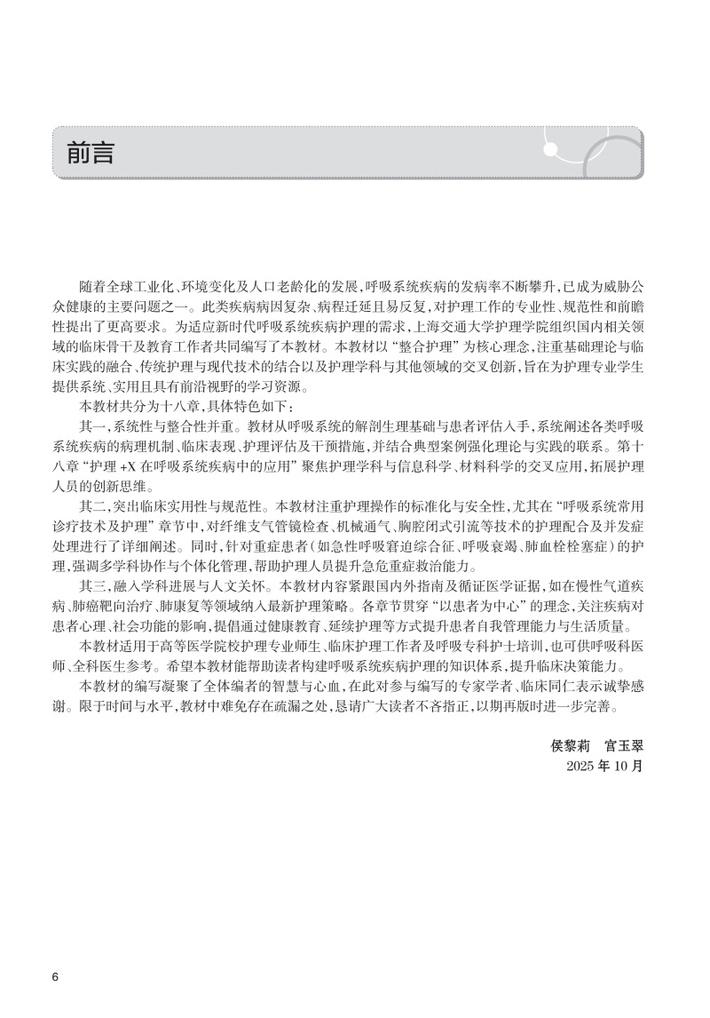 本教材共分为十八章,内容涵盖呼吸系统疾病的基础知识、诊疗技术、疾病护理及前沿拓展,系统性与整合性并重。第一章至第二章从呼吸系统的解剖生理基础入手,详细阐述呼吸系统疾病患者的评估方法及常用诊疗技术的护理要点,为后续疾病护理奠定科学基础。第三章至第十七章围绕各类呼吸系统疾病(如感染性疾病、慢性阻塞性肺疾病、肺癌、睡眠呼吸障碍等)展开,系统介绍其病理机制、临床表现、护理评估及干预措施,并结合典型案例分析,强化理论与实践的联系。第十八章“护理+X在呼吸系统疾病中的应用”聚焦护理学科与信息科学、材料科学的交叉应用,探索智能化护理、新型护理材料等前沿方向,拓展护理人员的创新思维。