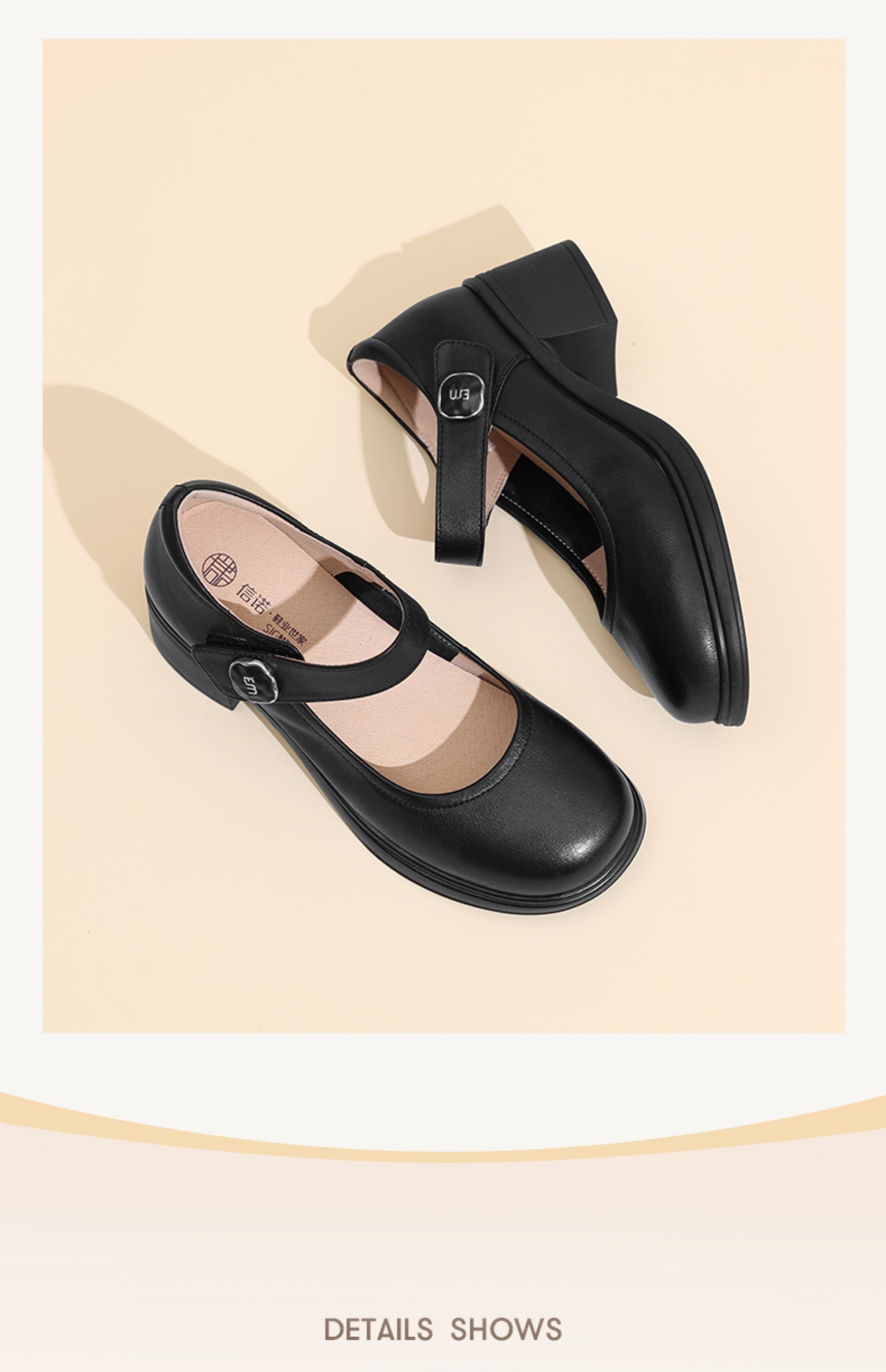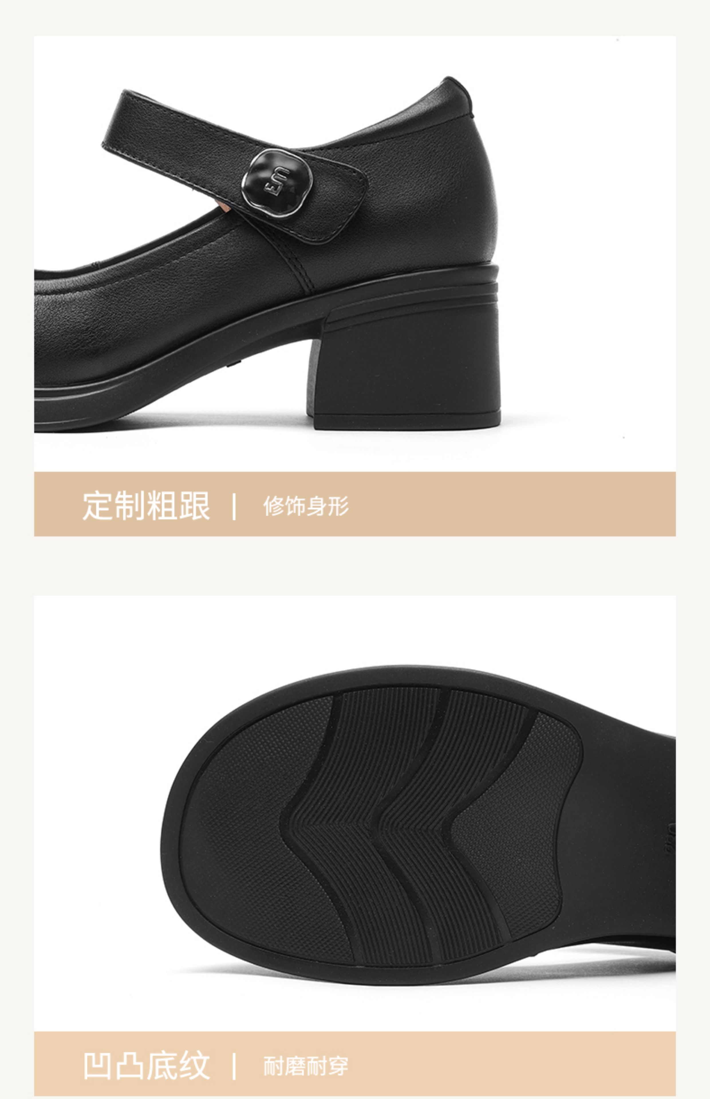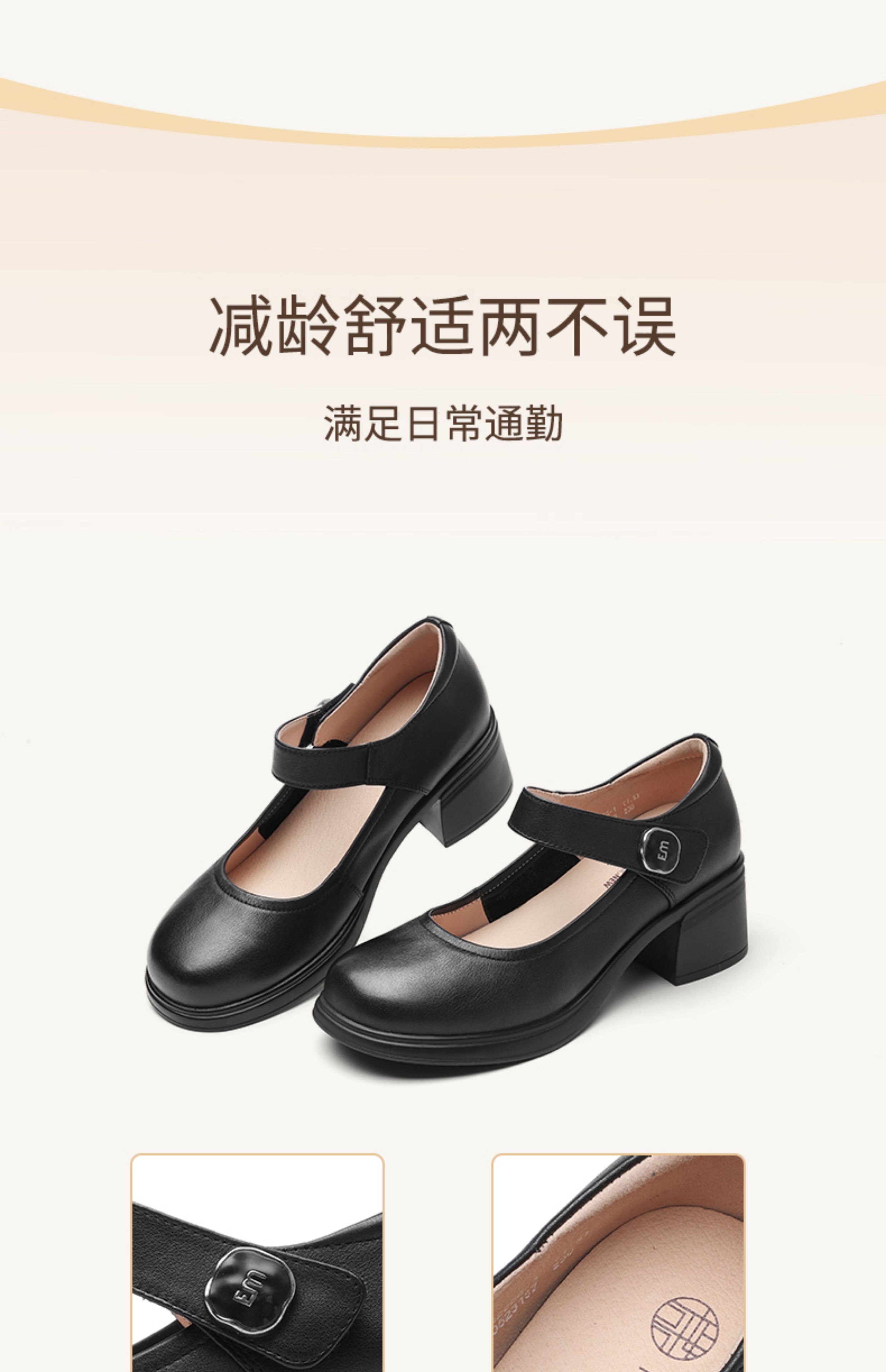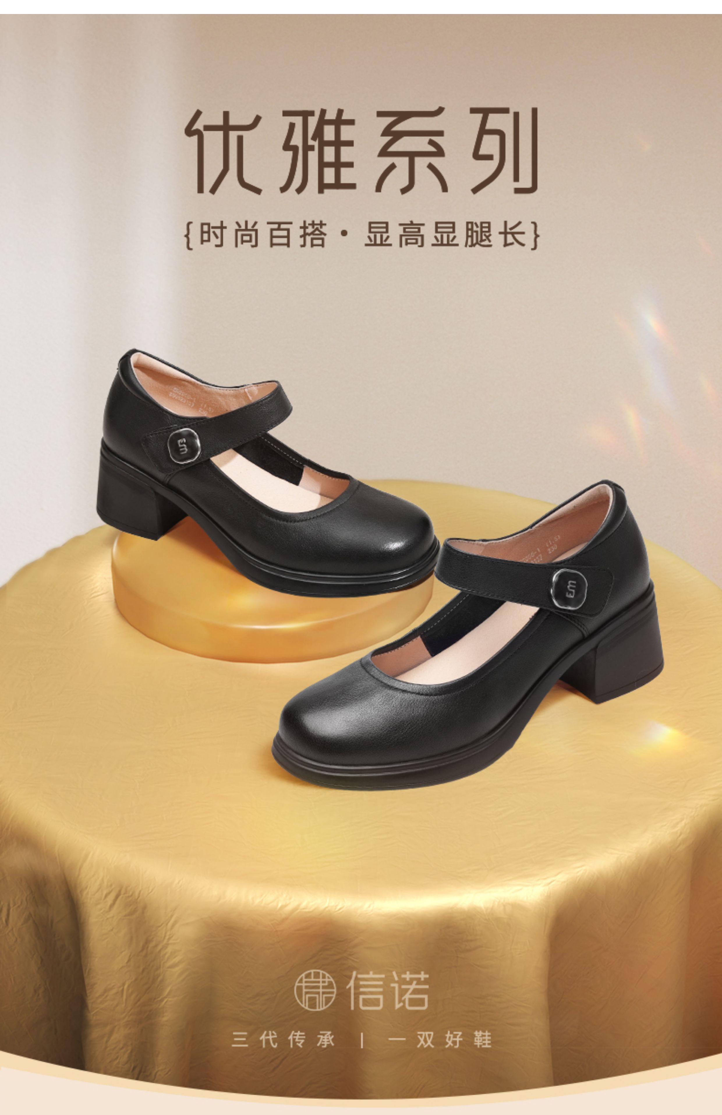 信诺真皮妈妈鞋女2025夏季新款软底粗跟高跟单鞋皮鞋法式玛丽珍鞋5Q2066-1