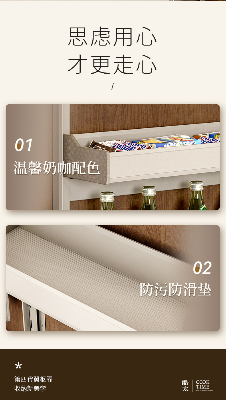 - 酷太坚持8年自主研发,已获得专利证书130项,拥有一套领先市场的厨房收纳系统,为千万中国家庭解决厨房脏乱差,缔造厨房新生活。